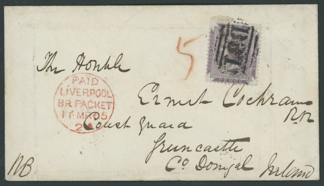 1865 (19 Feb.) envelope ex the Cochrane correspondence to Ireland, bearing 1859 6d. dull purple tied by "B31" obliterator, showing red crayon "5",