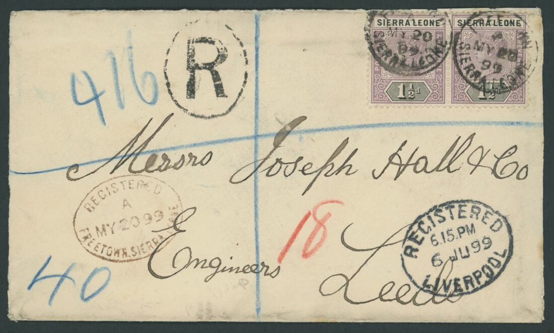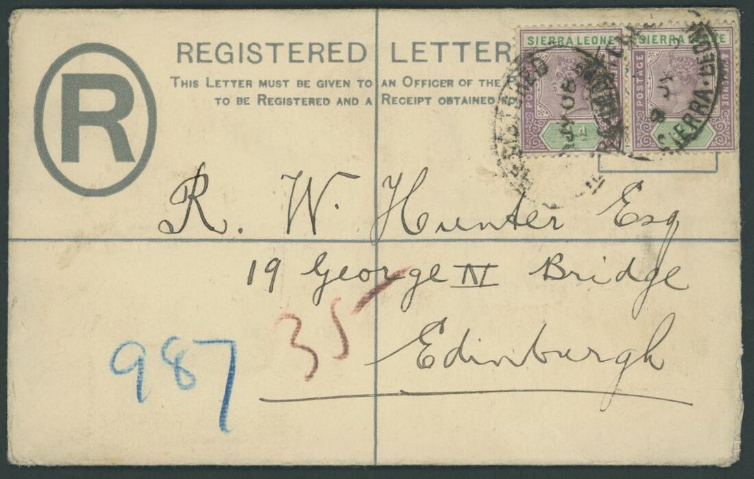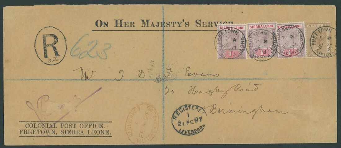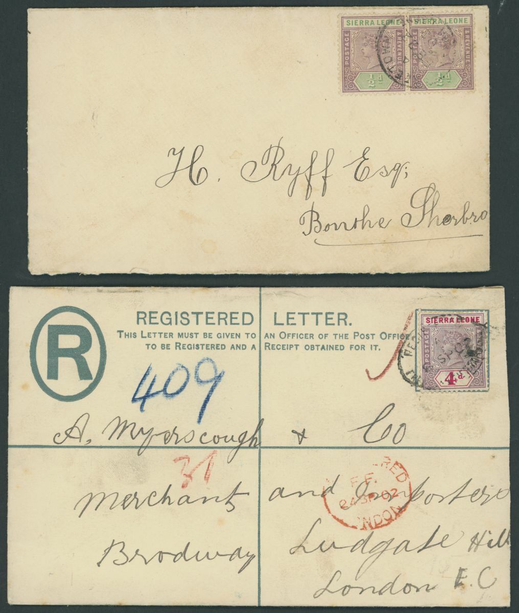 1896-1905 envelopes (8, five registered), 2d. registered envelopes (2) and a picture postcard, variously addressed and franked with 1896-97 keyplate values, including 1897 (4 Feb.) OHMS envelope registered to Birmingham bearing 1d. (3) and 1884 4d.; 1898 (22 Jan.) OHMS envelope (265x125mm; a little soiled) registered to New York, bearing 1½d. and 2/- and showing manuscript "A.R."; 1898 (26 May) envelope (250x103mm.) registered to Manchester bearing 1d. (2) and 5d. (4); 1899 (20 May) envelope registered to Leeds bearing 1½d. pair; and 1902 (22 Feb.) envelope from Freetown to Bonthe bearing ½d. pair. A good lot