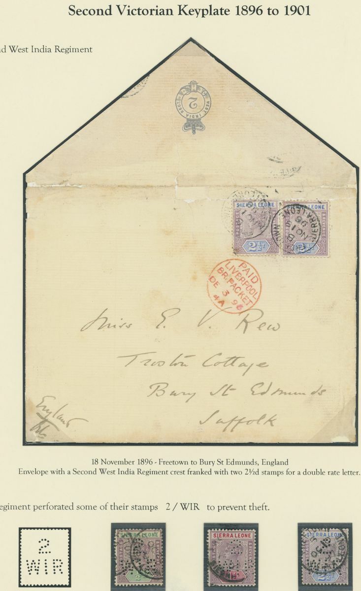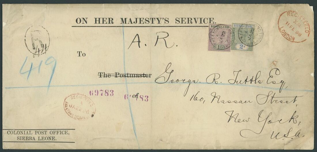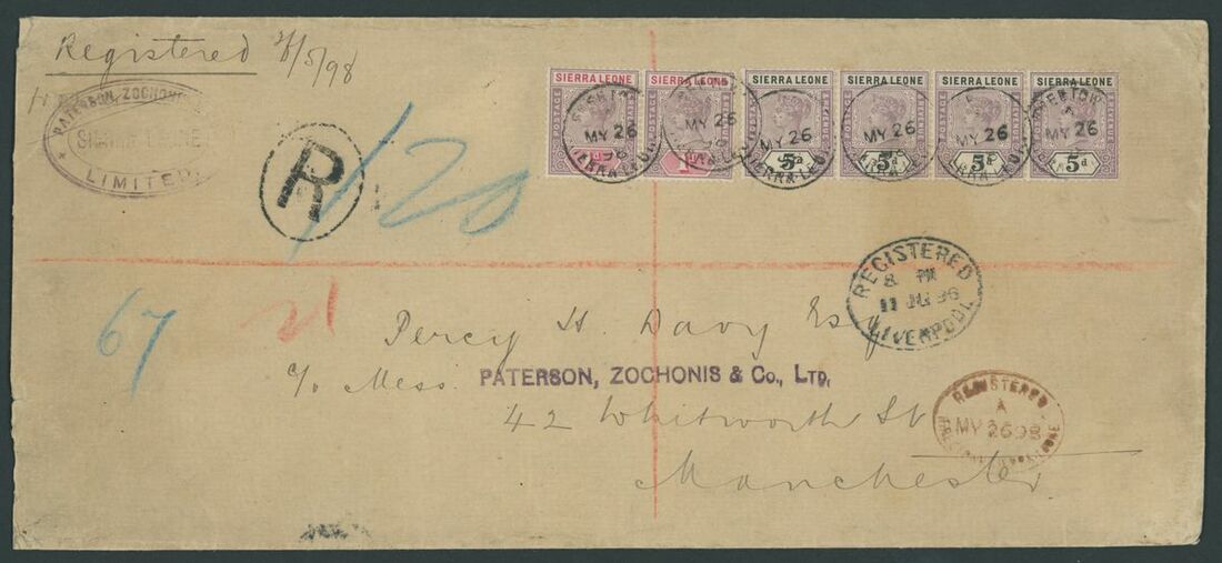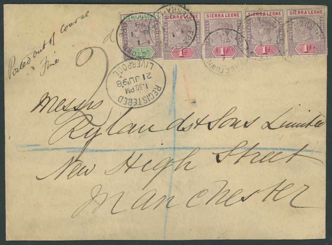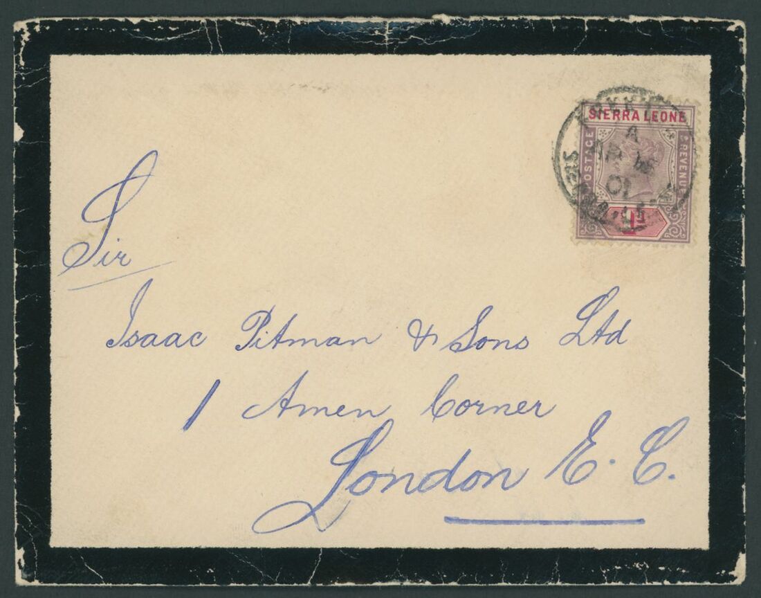 1896-1905 envelopes (8, five registered), 2d. registered envelopes (2) and a picture postcard, variously addressed and franked with 1896-97 keyplate values, including 1897 (4 Feb.) OHMS envelope registered to Birmingham bearing 1d. (3) and 1884 4d.; 1898 (22 Jan.) OHMS envelope (265x125mm; a little soiled) registered to New York, bearing 1½d. and 2/- and showing manuscript "A.R."; 1898 (26 May) envelope (250x103mm.) registered to Manchester bearing 1d. (2) and 5d. (4); 1899 (20 May) envelope registered to Leeds bearing 1½d. pair; and 1902 (22 Feb.) envelope from Freetown to Bonthe bearing ½d. pair. A good lot