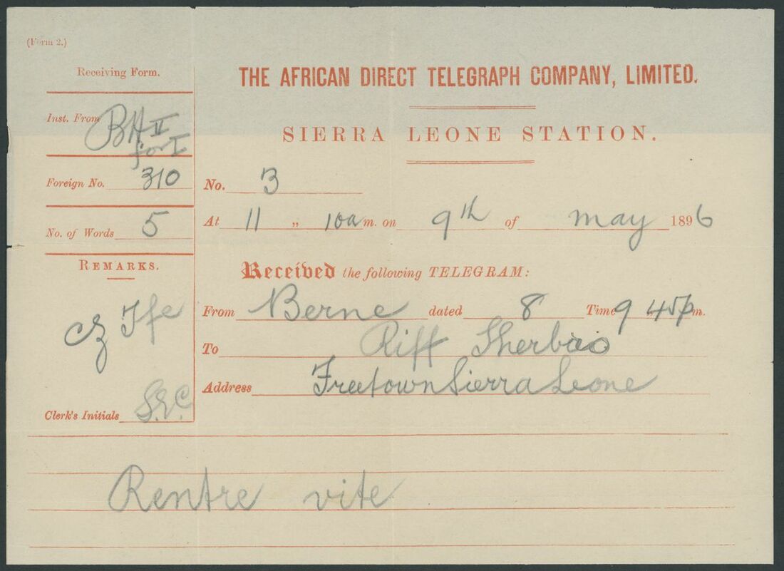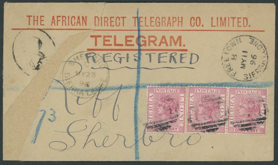 1896 (11 May) African Direct Telegraph Co., Ltd. printed envelope (complete with telegram) from Freetown to Sherbro, bearing 1884-91 1d. carmine pair and a single each lightly cancelled "B31" and showing "R" in oval h.s., despatch and arrival (23.5) c.d.s.; a portion of the envelope, clear of the adhesives and datestamps, missing nevertheless rare and unusual