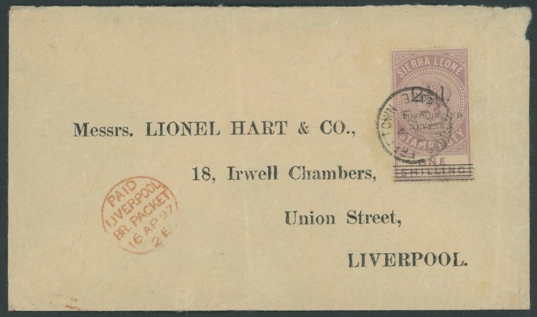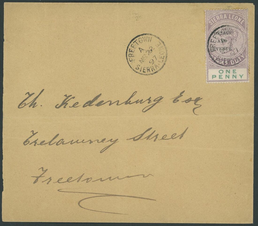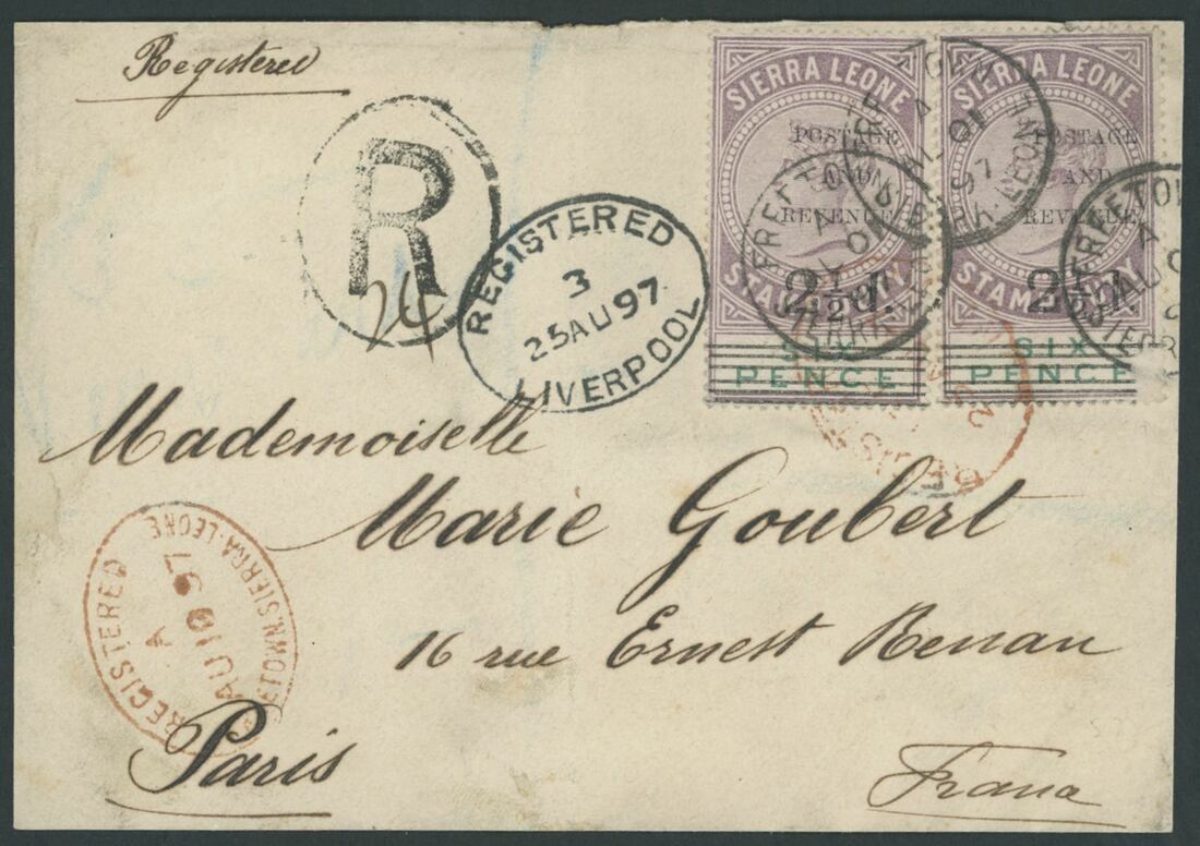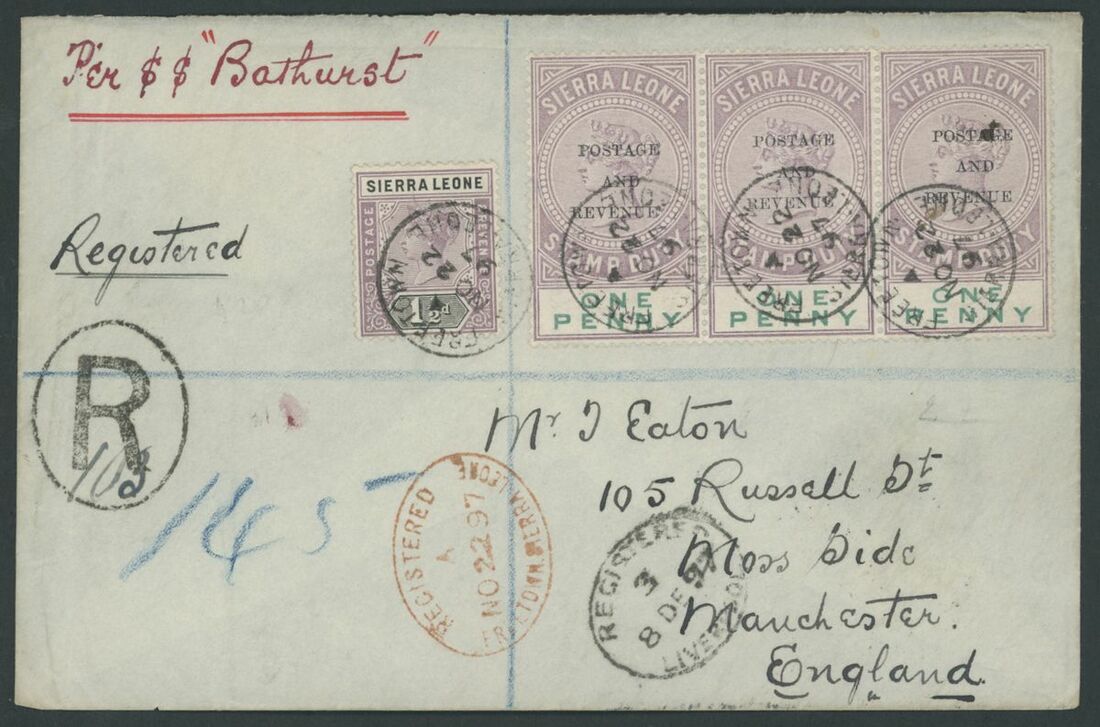 1897 (22 Mar.) envelope locally addressed at Freetown bearing 1897 1d.; 1897 (27 Mar.) Hart envelope to Liverpool bearing 1897 2½d. (Type 8) on 1/- tied by Freetown c.d.s.; 1897 (1 Aug.) envelope registered from Freetown to France bearing 1897 2½d. (Type 8) on 6d. (2); and 1897 (22 Nov.) envelope registered from Freetown to Manchester bearing 1897 1d. strip of three and keyplate 1½d.. A nice group