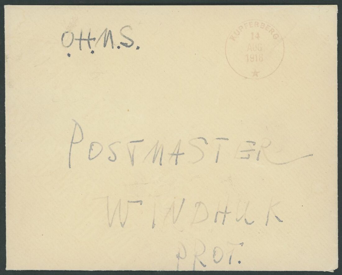 Kupferberg: 1916 (14 Aug.) stampless O.H.M.S. envelope to Windhuk with a faint but readable strike of the violet rubber