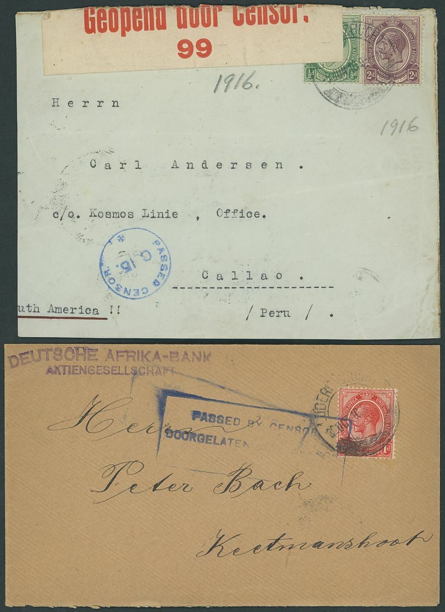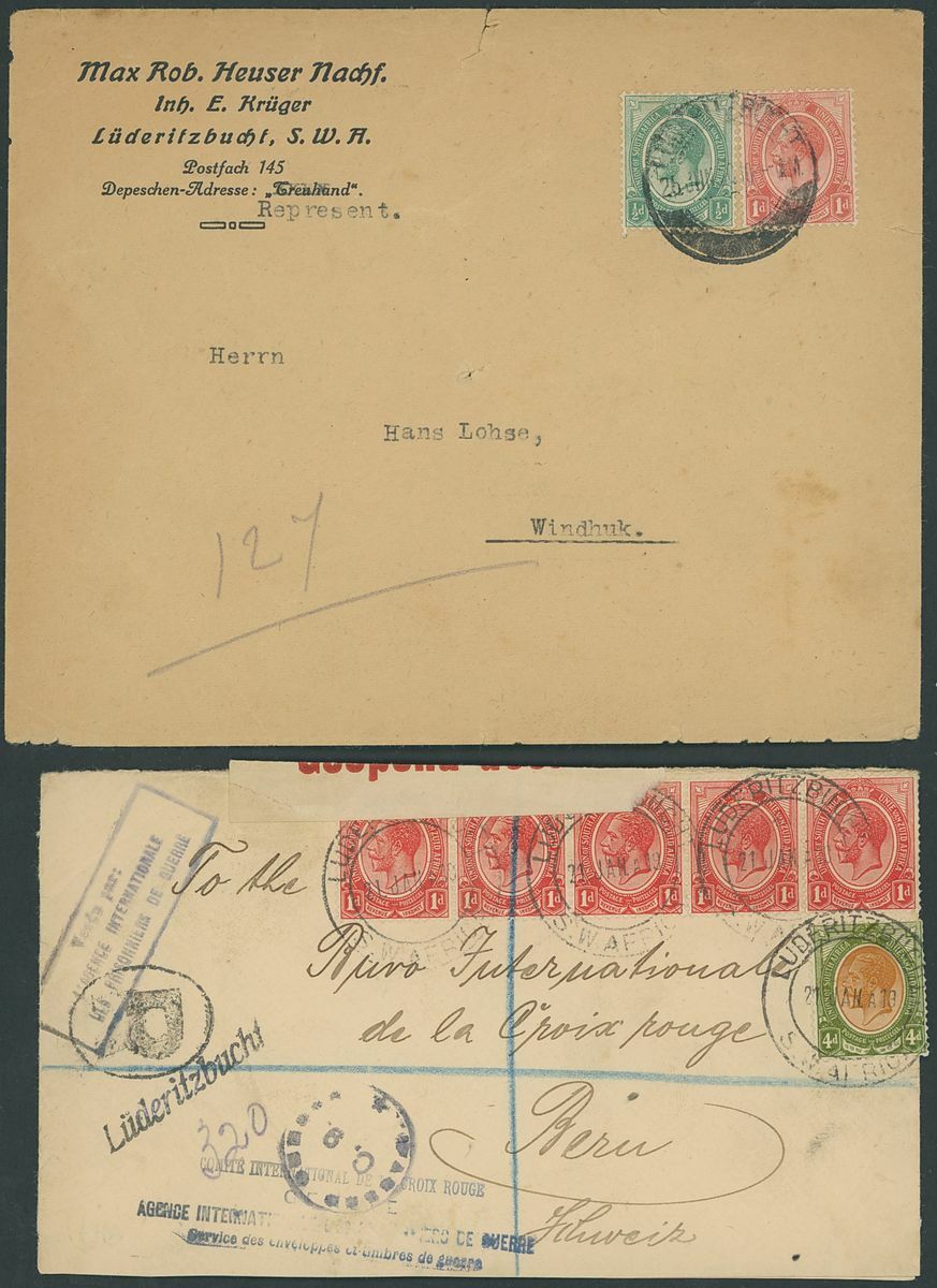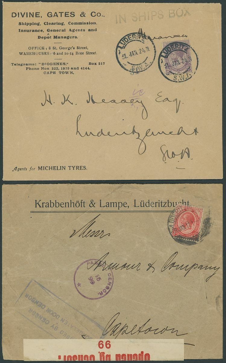 Luderitzbucht: 1916-24 a small group of six envelopes with various censor markings including attractive 1919 (21 Jan.) envelope registered to Switzerland bearing 1d. strip of five and 4d. with various cachets and straight line "Lüderitzbucht" handstamp, also 1924 (31 Jan.) incoming from Cape Town, posted on S.S. "Mwanza" with 2d. applied and cancelled on arrival, the envelope endorsed "Mwanza" and with straight line "