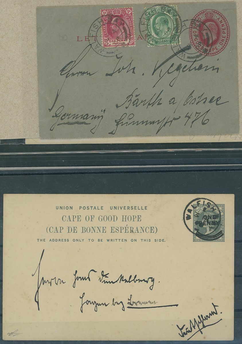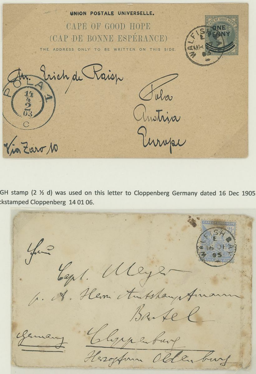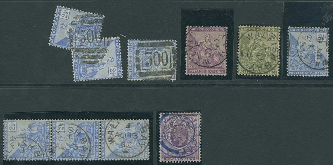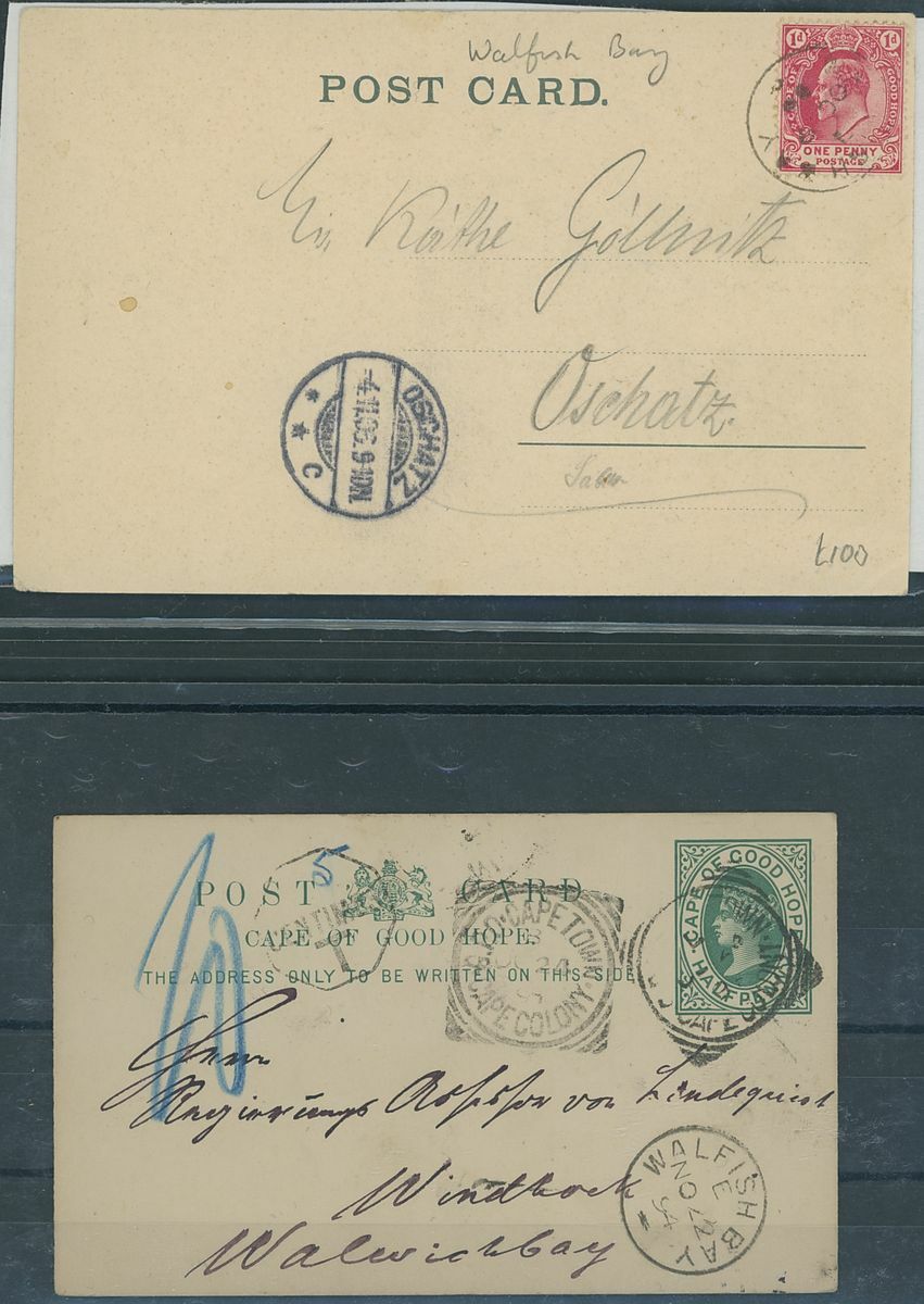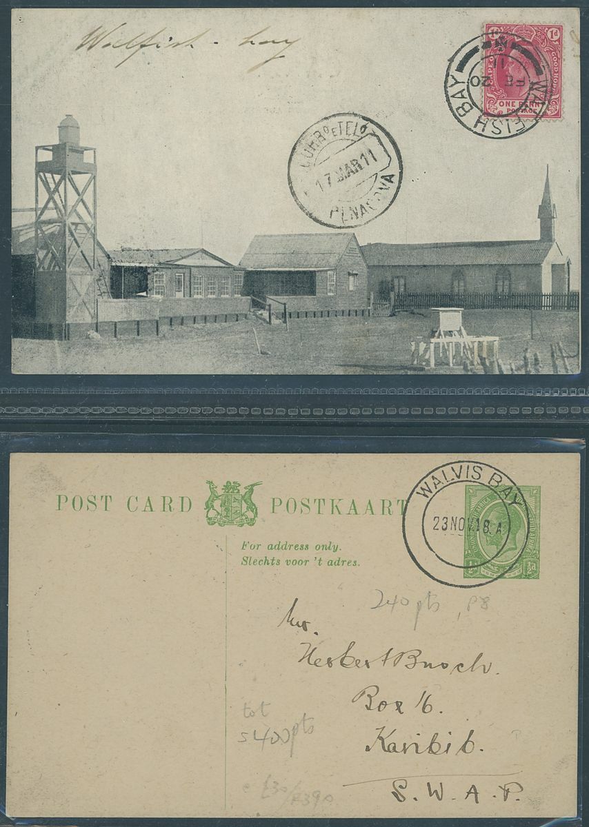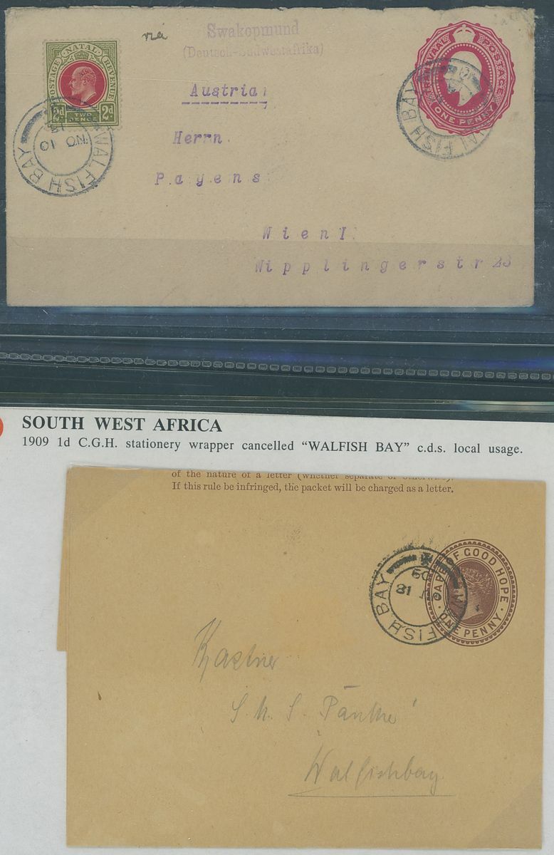 Walvis Bay: A collection on stock and exhibition pages including cards (2) and pieces (2) showing "Walfish Bay" dated manuscript, singles and multiples of Cape off cover (10) with numeral cancel including strip of three with Putz. B3a and Orange River Colony 3d. cancelled by unrecorded double ring in violet/blue, covers and cards (c.40) including 1906 (12 March) Cape 1d. letter card to Munich uprated with ½d. and 1d. with three Putz. B3a cancels and same cancel on two 1d. Cape cards, various examples of the double ring with Maltese Cross cancels and later covers through to 2004. Mixed condition though an interesting group.