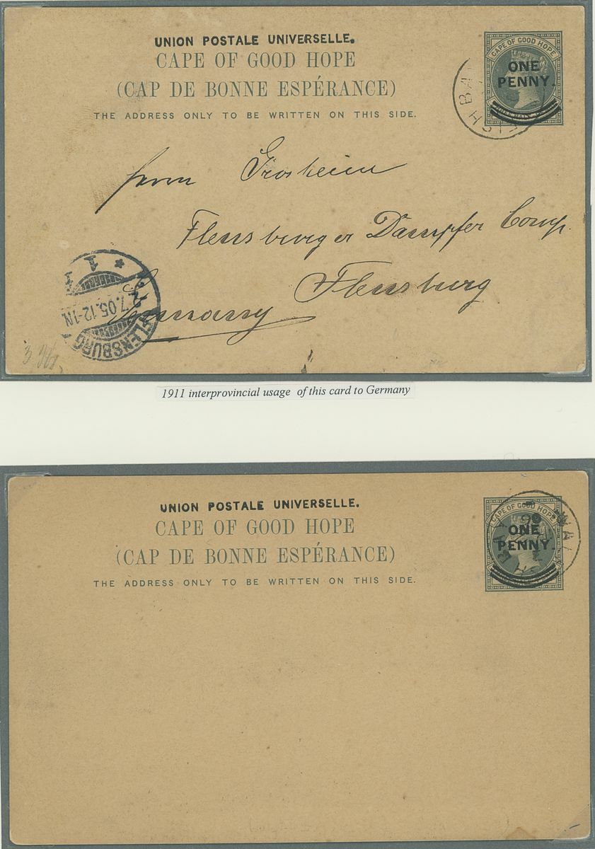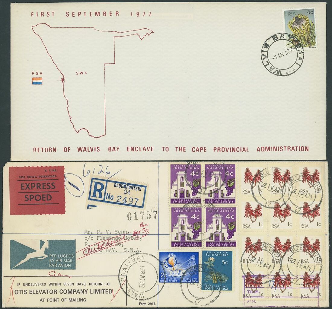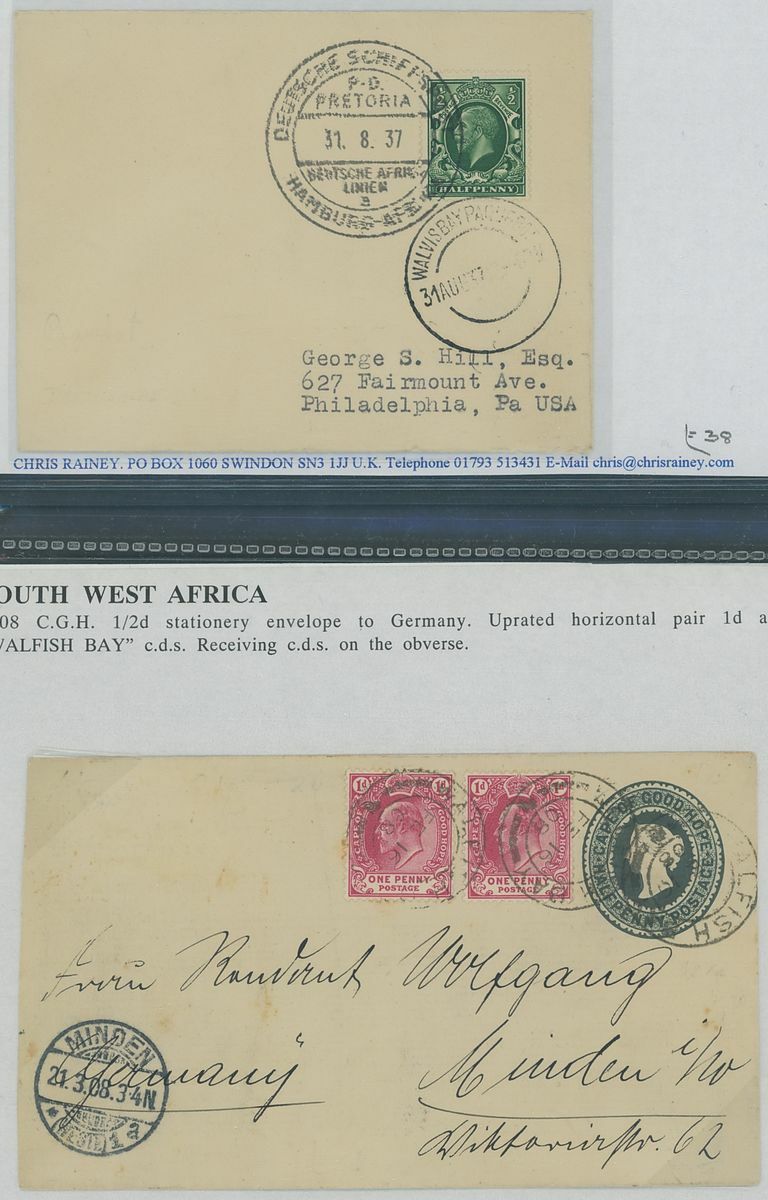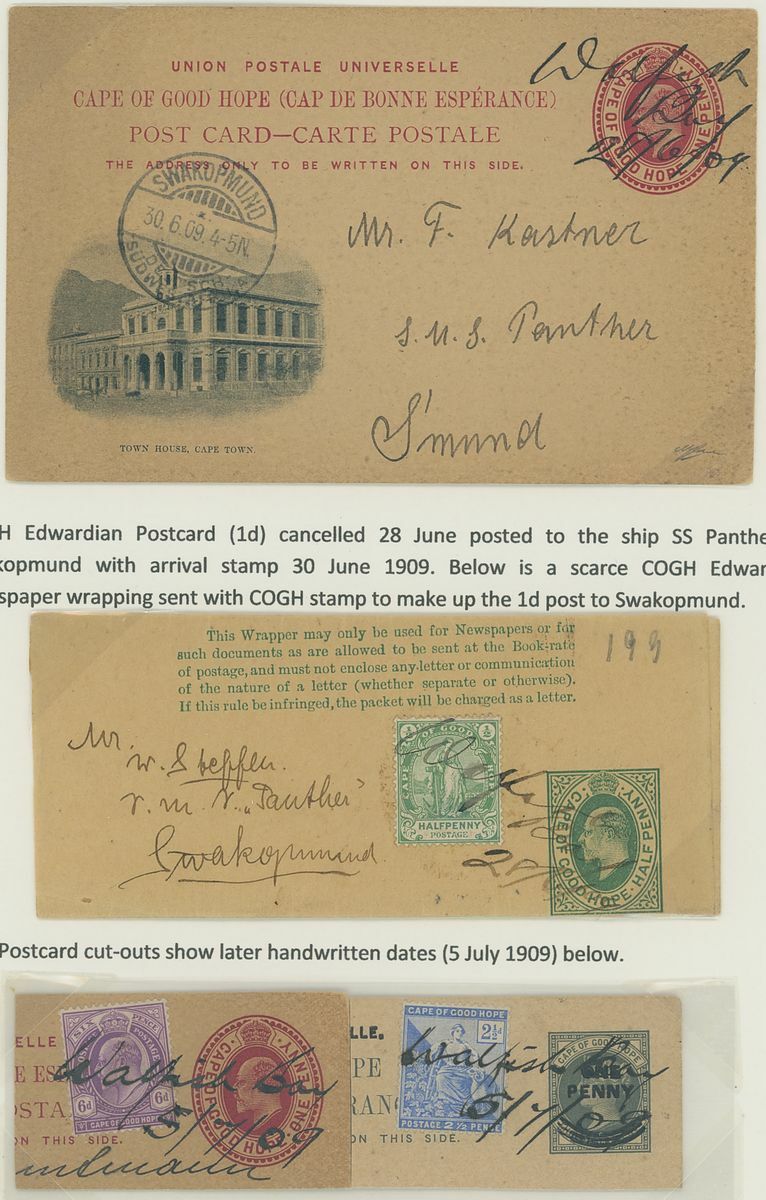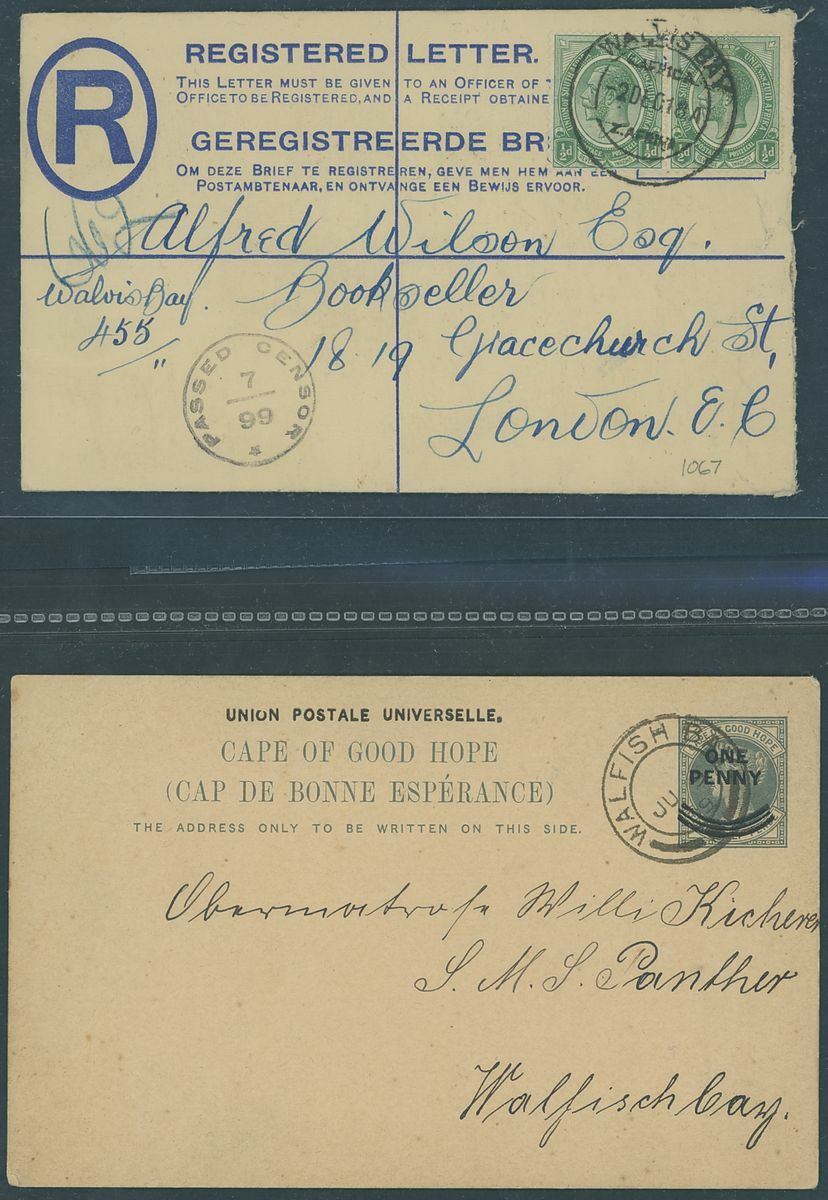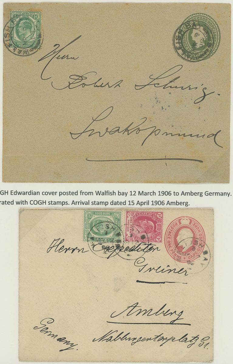 Walvis Bay: A collection on stock and exhibition pages including cards (2) and pieces (2) showing "Walfish Bay" dated manuscript, singles and multiples of Cape off cover (10) with numeral cancel including strip of three with Putz. B3a and Orange River Colony 3d. cancelled by unrecorded double ring in violet/blue, covers and cards (c.40) including 1906 (12 March) Cape 1d. letter card to Munich uprated with ½d. and 1d. with three Putz. B3a cancels and same cancel on two 1d. Cape cards, various examples of the double ring with Maltese Cross cancels and later covers through to 2004. Mixed condition though an interesting group.