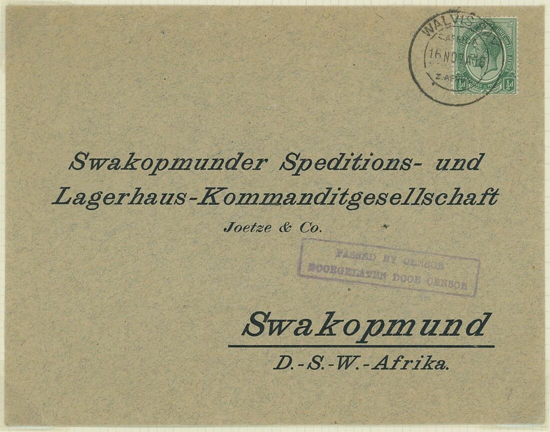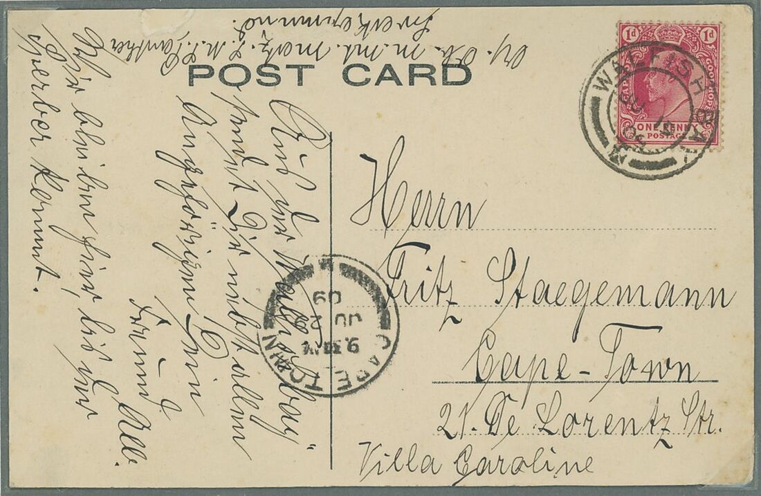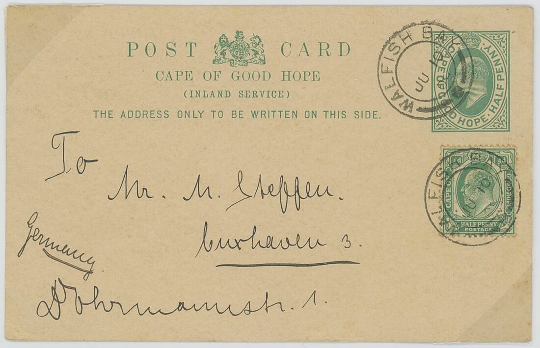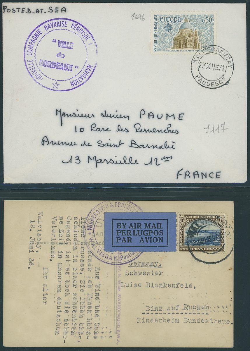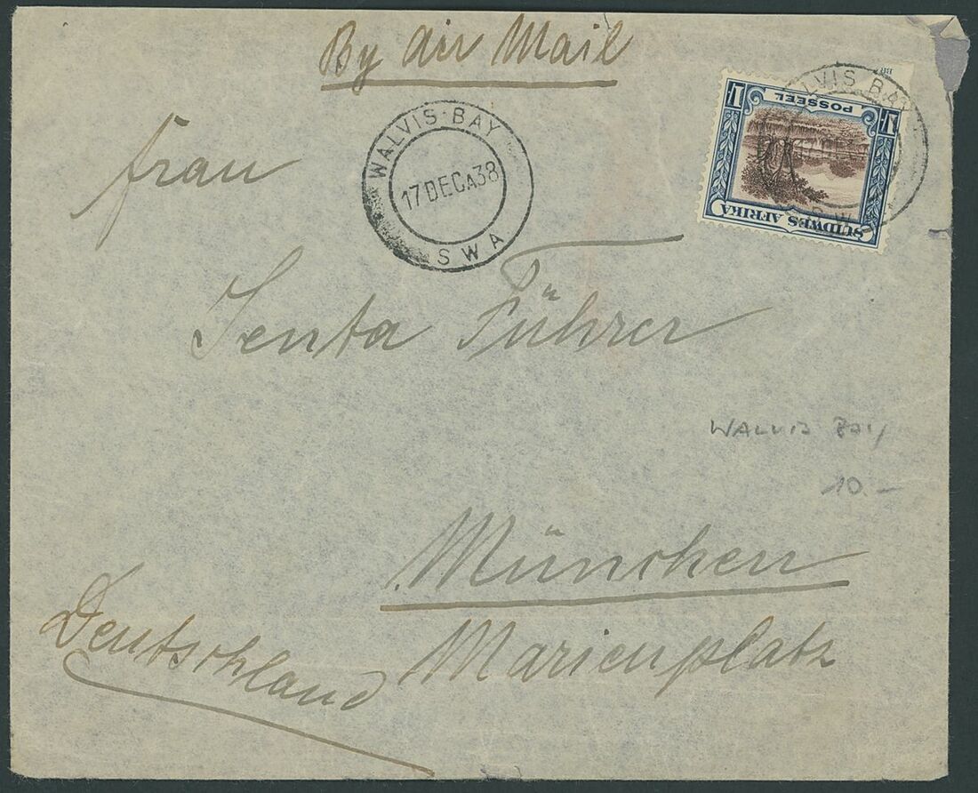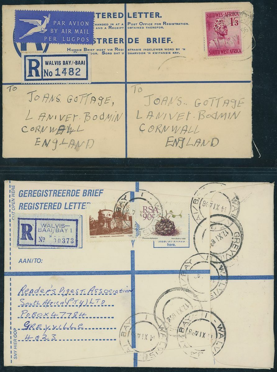 Walvis Bay: A collection on stock and exhibition pages including cards (2) and pieces (2) showing "Walfish Bay" dated manuscript, singles and multiples of Cape off cover (10) with numeral cancel including strip of three with Putz. B3a and Orange River Colony 3d. cancelled by unrecorded double ring in violet/blue, covers and cards (c.40) including 1906 (12 March) Cape 1d. letter card to Munich uprated with ½d. and 1d. with three Putz. B3a cancels and same cancel on two 1d. Cape cards, various examples of the double ring with Maltese Cross cancels and later covers through to 2004. Mixed condition though an interesting group.