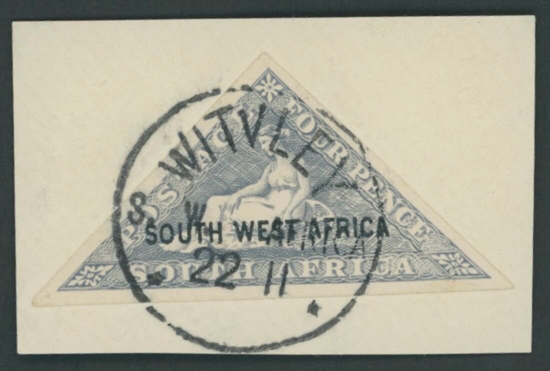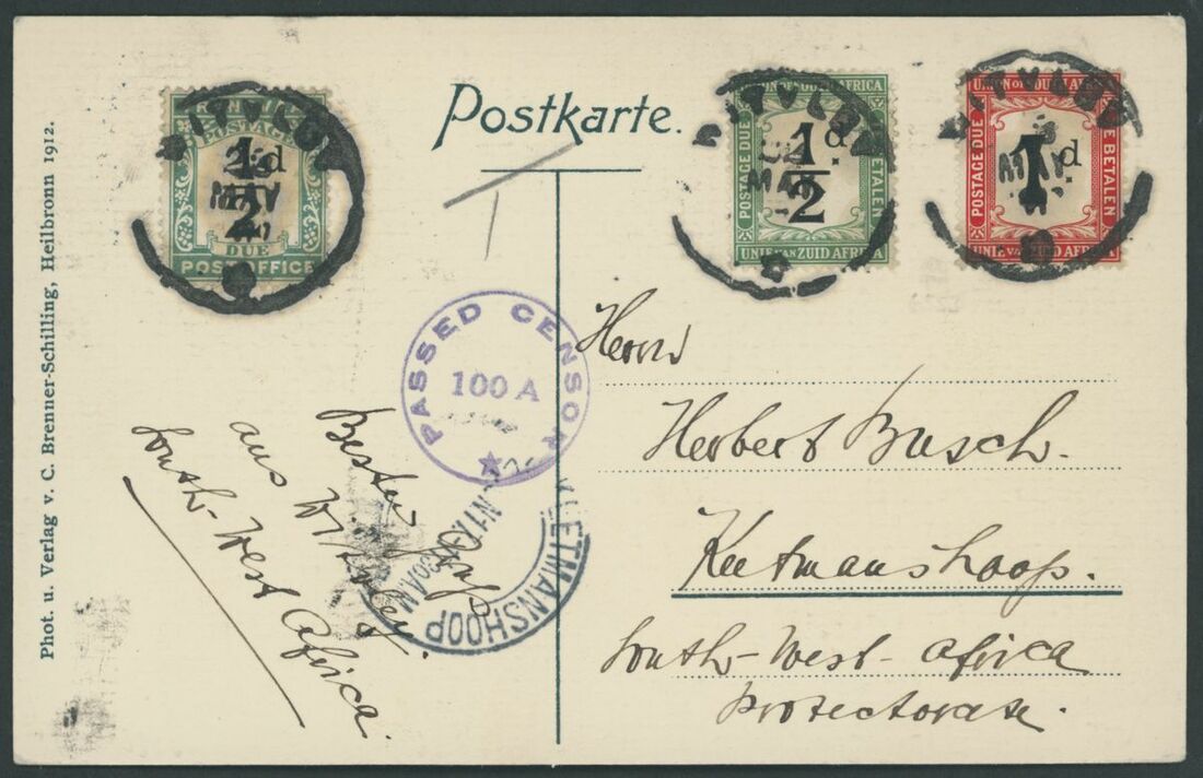 Witvley: 1916 (20 April) card tp Keetmanshoop bearing Union ½d. (2) and 1d. postage dues tied by Putz. B1 with additional B3e tying 4d. triangular to small piece. A scarce pair.