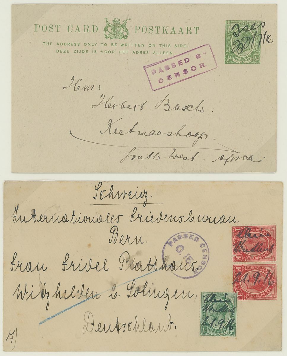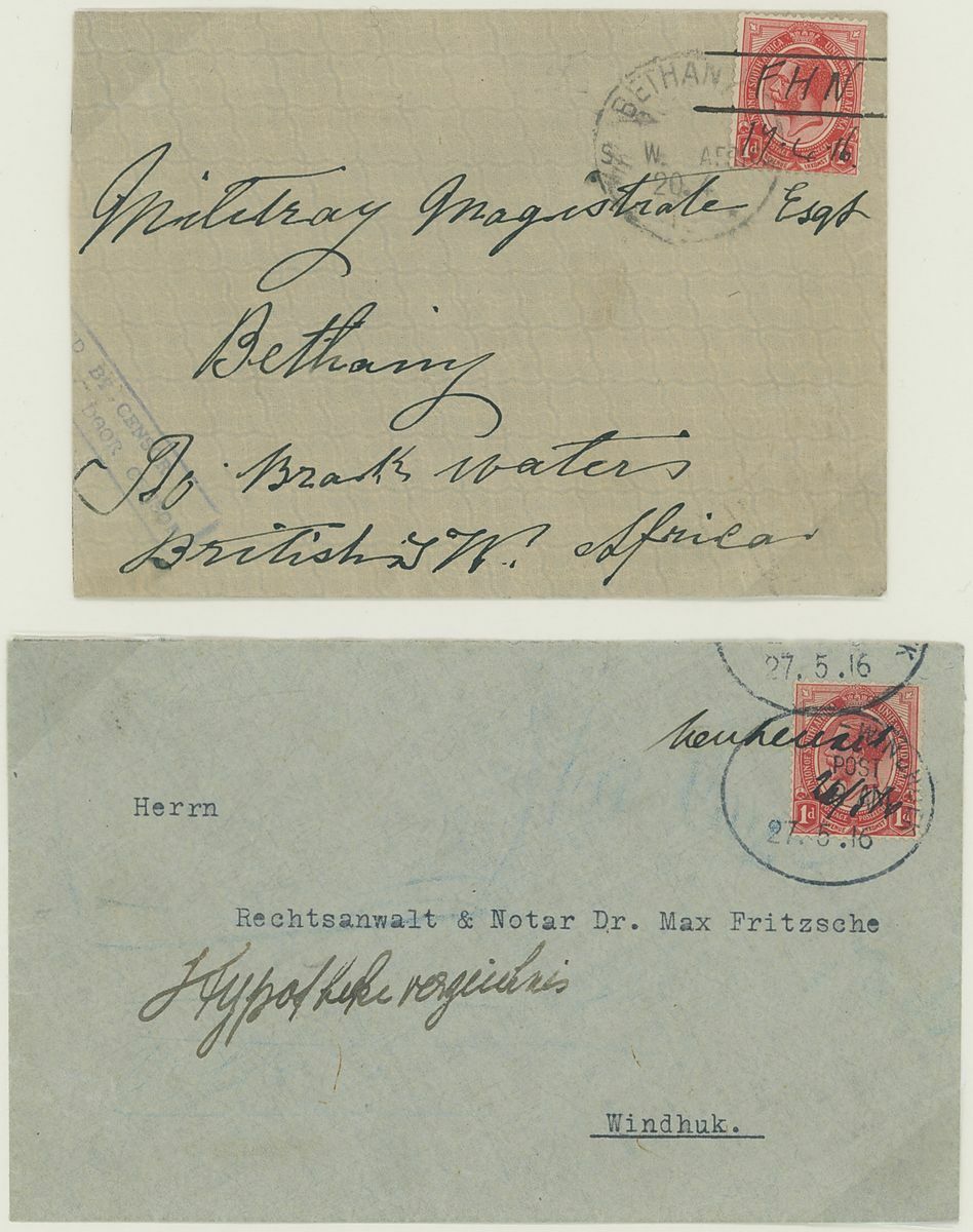 1916, three envelopes and one ½d. green card showing manuscript cancellations, frankings made up of ½d. and 1d., cancellations including "FHN" (Feldschuhhorn), "Neuheusis", "Tses" and "Klein Windhoek". A fine and rare group.