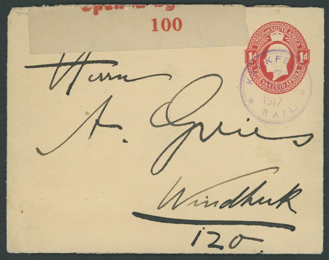 Kalkfeld: 1917 (7 Jan.) 1d. red postal stationery envelope to Windhoek cancelled by wonderfully crisp "