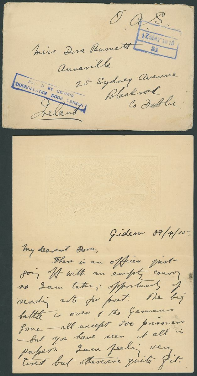 1915 (17 May) stampless envelope to Ireland headed "O.A.S." with unknown F.P.O. c.d.s. in blue and "