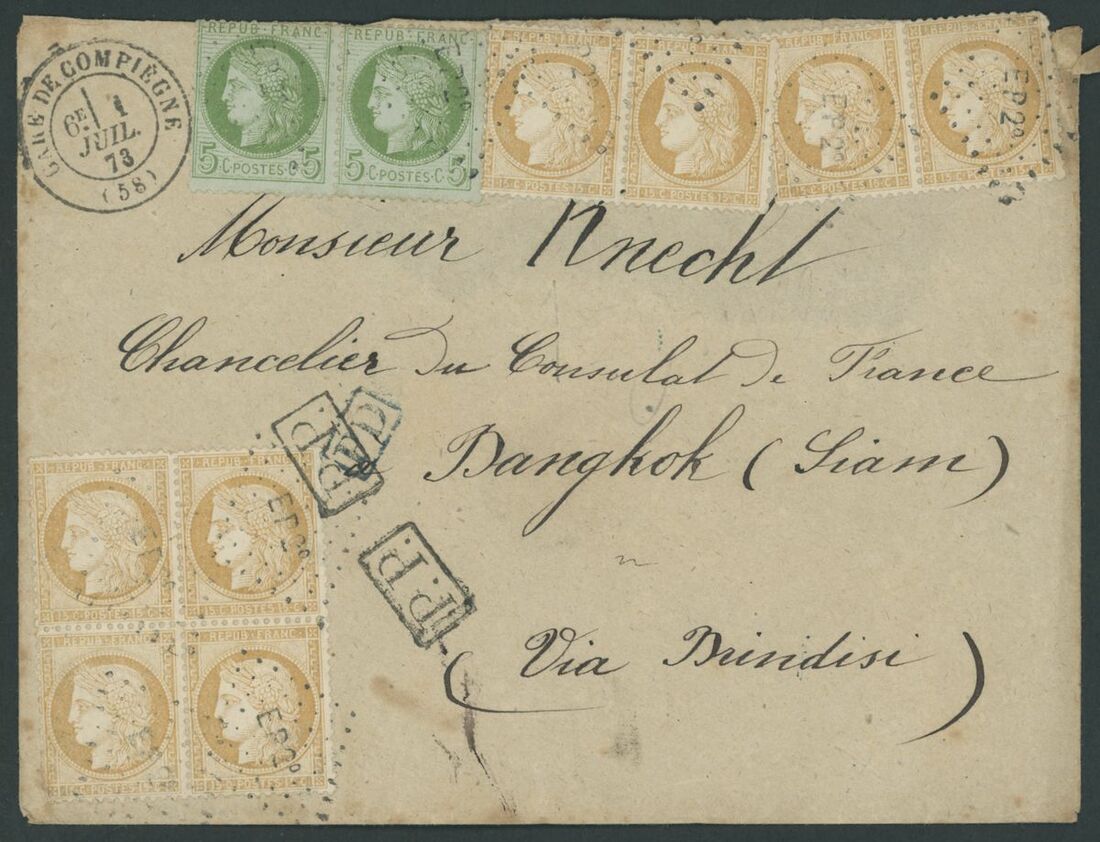 1873 (1 July) envelope from France to "Monsieur Knecht Chancelier du Consulat de France Bangkok (Siam)", bearing 1871-76 5c. green pair, and thin figures 15c. bistre block of four and pairs (2), cancelled by small numeral "
