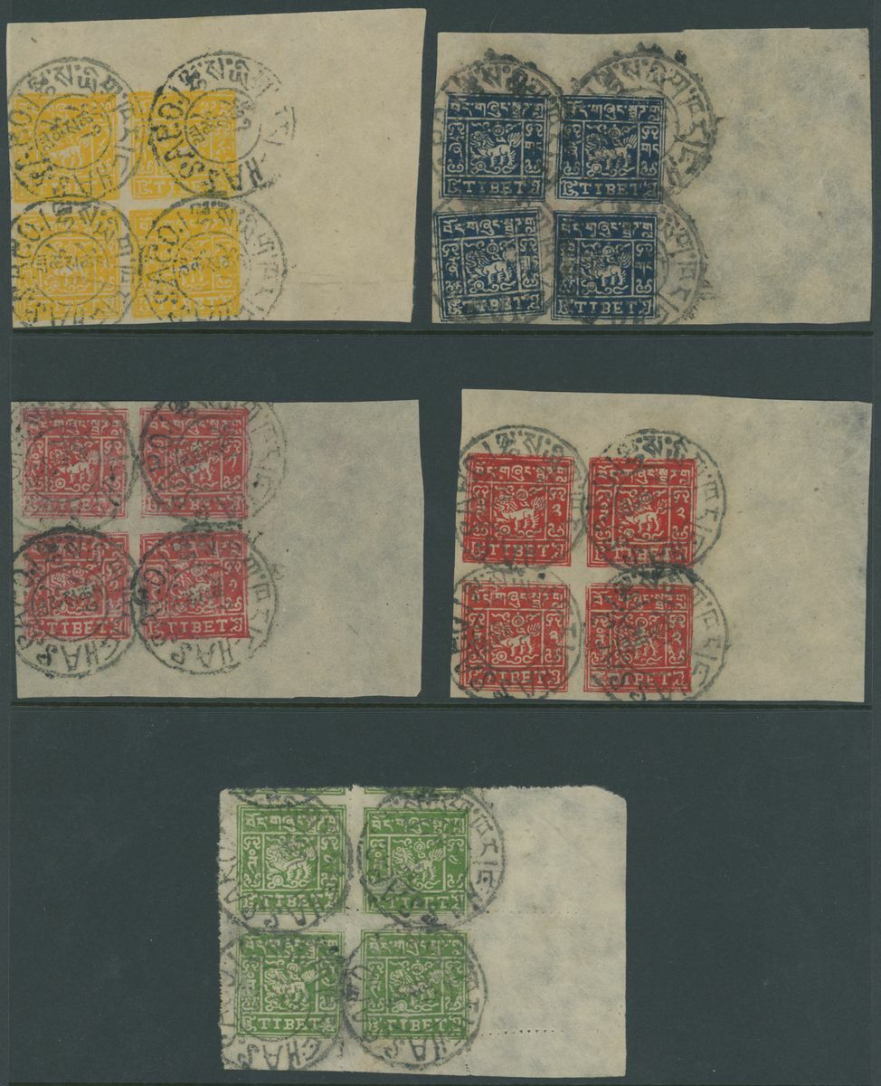 1933-60 imperf. ½t., 2/3t., 1t. and 2t., pin perf. 4t., all in used corner blocks of four with Lhasa cancellations, fine. S.G. 9A-12A 13B