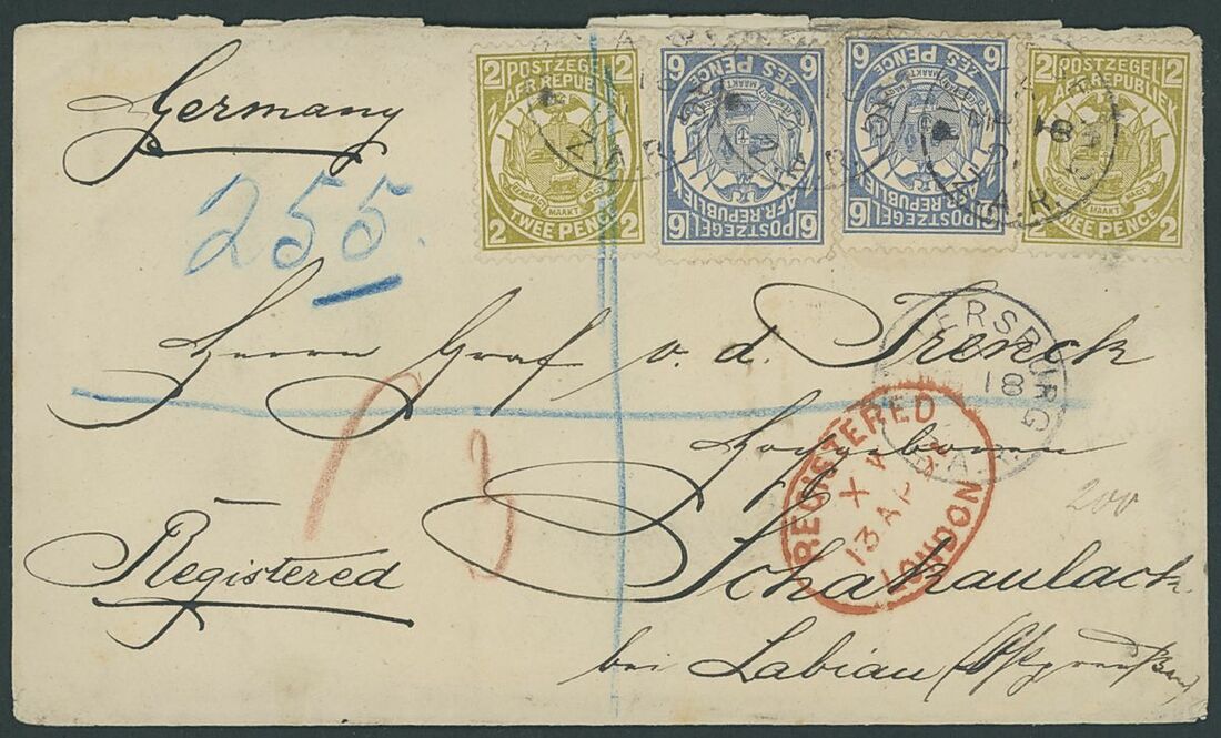 1891 (18 Mar.) double rate envelope registered to Germany, bearing Vurtheim 2d. (2) and 6d. (2) cancelled by Pietersburg c.d.s., showing manuscript registration marking, Registered London oval transit d.s. (13.4) in red with arrival datestamp on reverse. An attractive 1/4d. rate franking