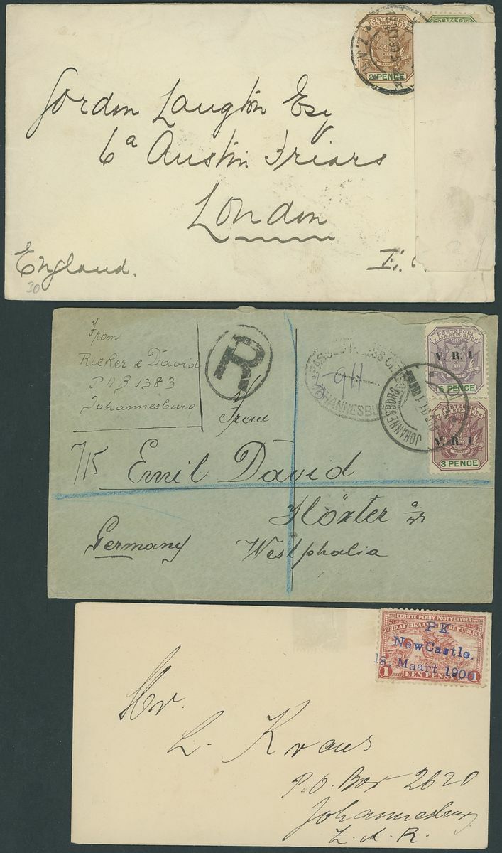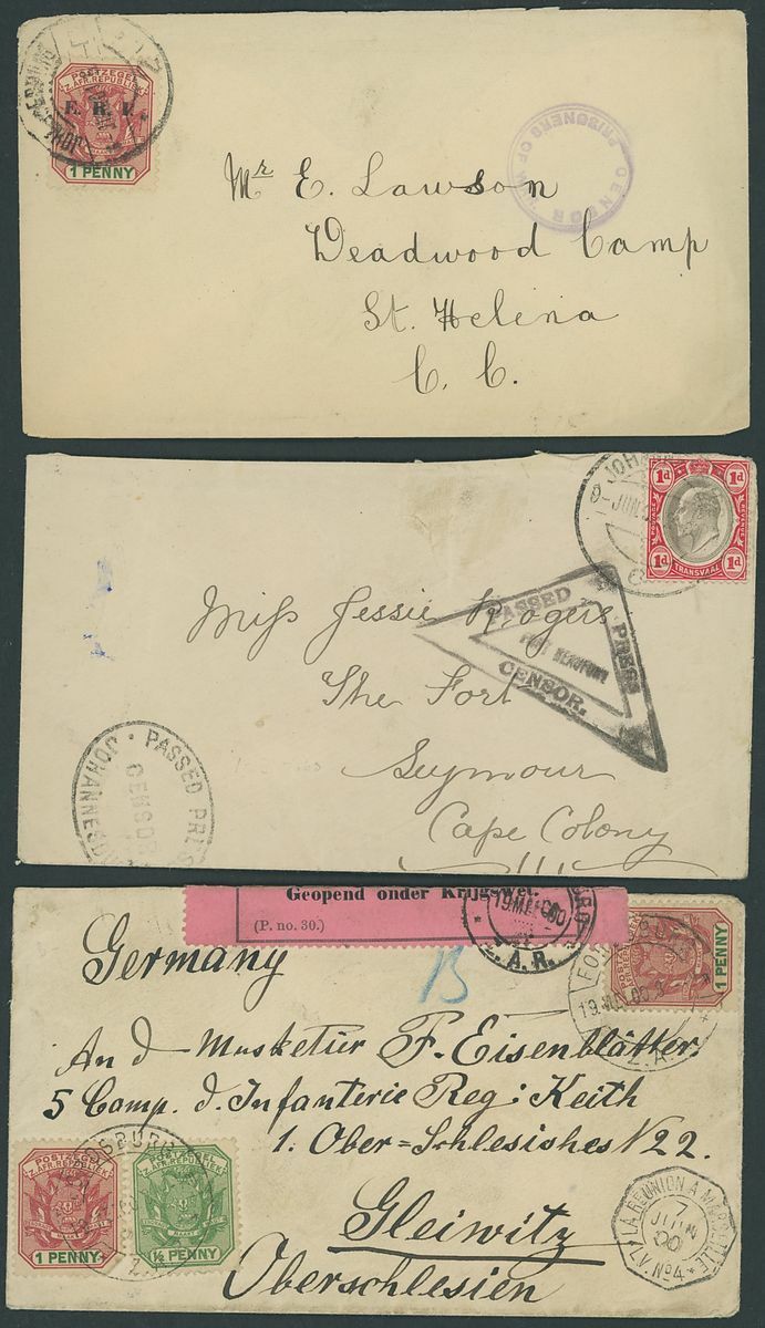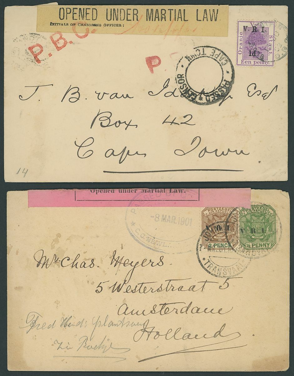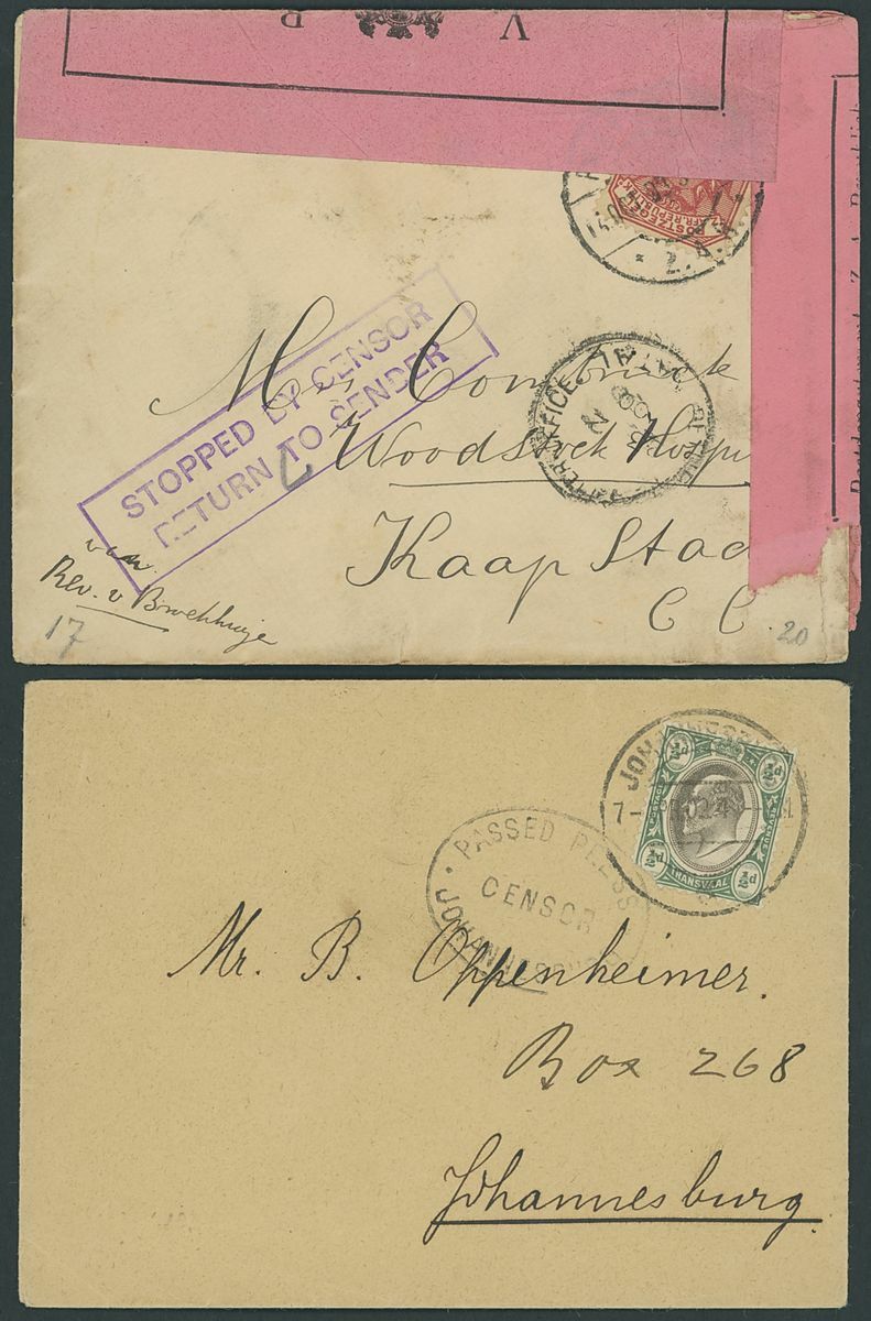 1899-1902 envelopes (10, one registered) variously addressed and franked, including 1899 envelope from Pretoria to Cape Town with Opened under Martial Law labels and showing framed