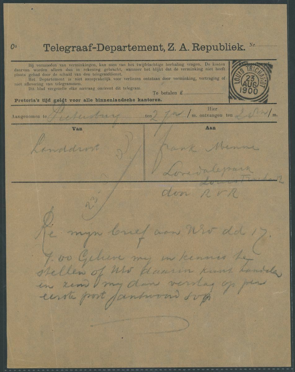1900 (18 and 23 Aug.) pair of telegram forms transmitted from Pietersburg to Louis Trichardt with superb impression of the squared circled datestamps on receipt of messages, contents of one refer to the departure of a train.