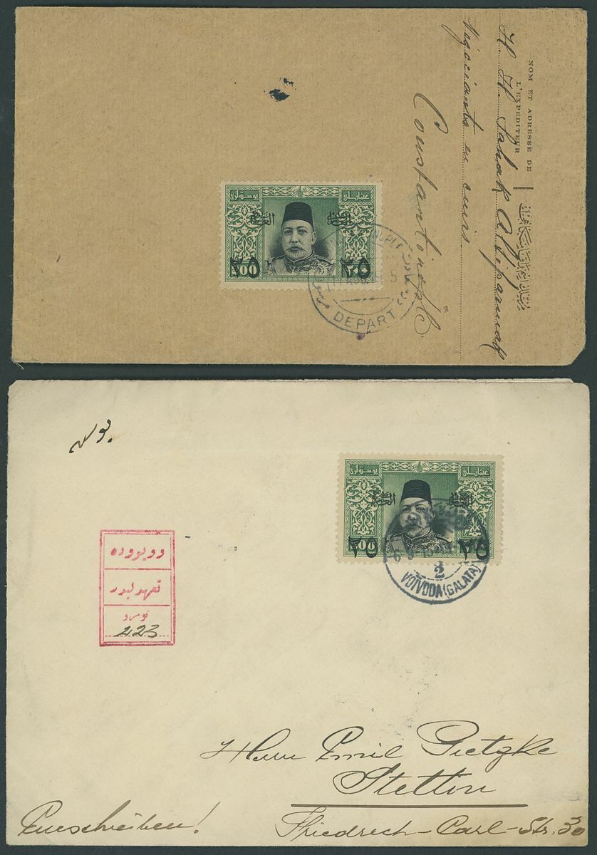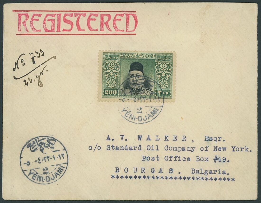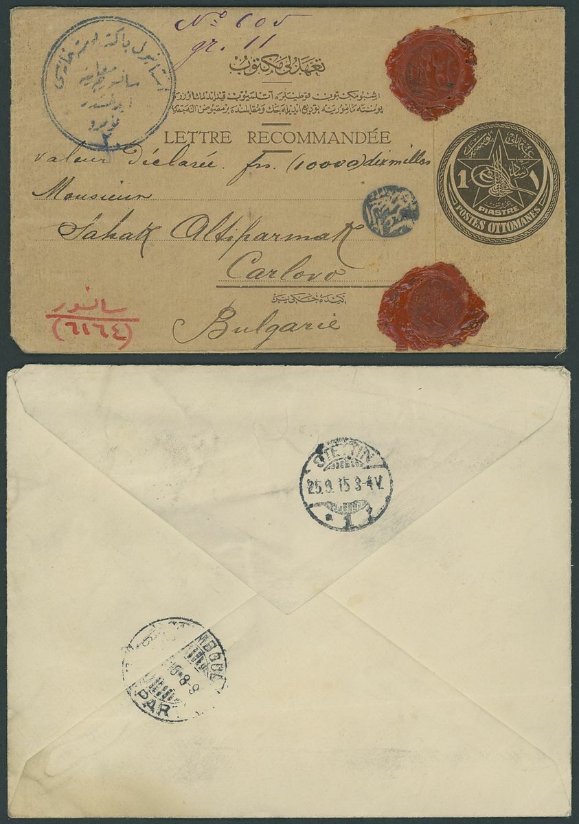 1914 (14 Jan.) 200pi. tied by Yeni-Djami d.s. to envelope registered to Bulgaria, the reverse with attractive red paper seal; also 1915 (Aug.) 25pi. on 200pa. (2), one tied by Voivoda(Galata) d.s. to envelope registered to Germany, the other tied by Constantinople-Depart d.s. to "Lettre Recommandee" 1pi. postal stationery envelope to Bulgaria with two intact wax seals, and various transit markings. A rare and interesting group
