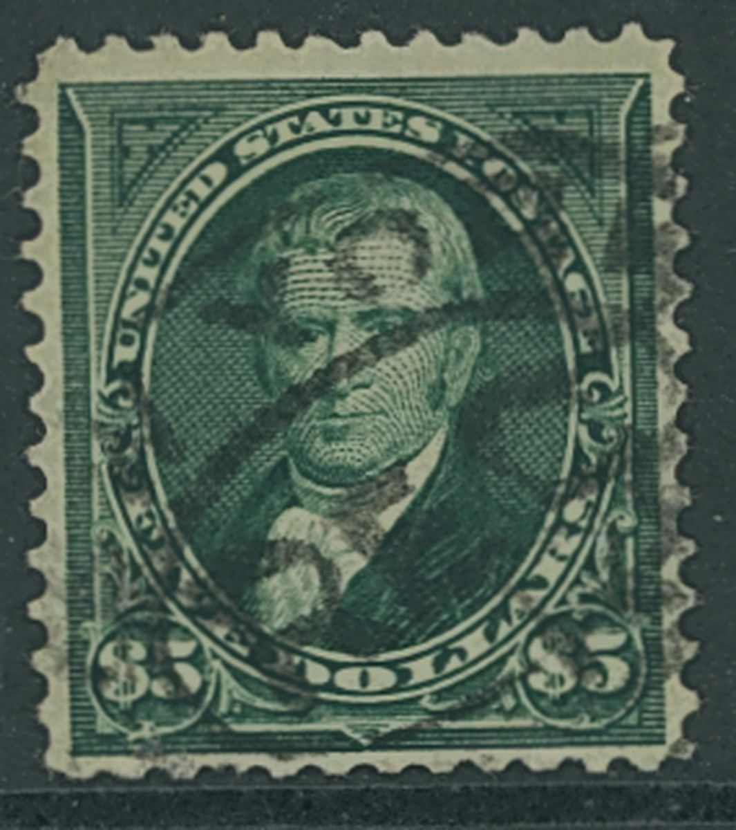 1895-98 Bureau Issue $5 dark green, nearly struck with partial New York registered oval, centred slightly to the foot; small thin at centre and short perf. at foot, still a sound example. P.S.A.G. Certificate (2022). Scott 278, $600