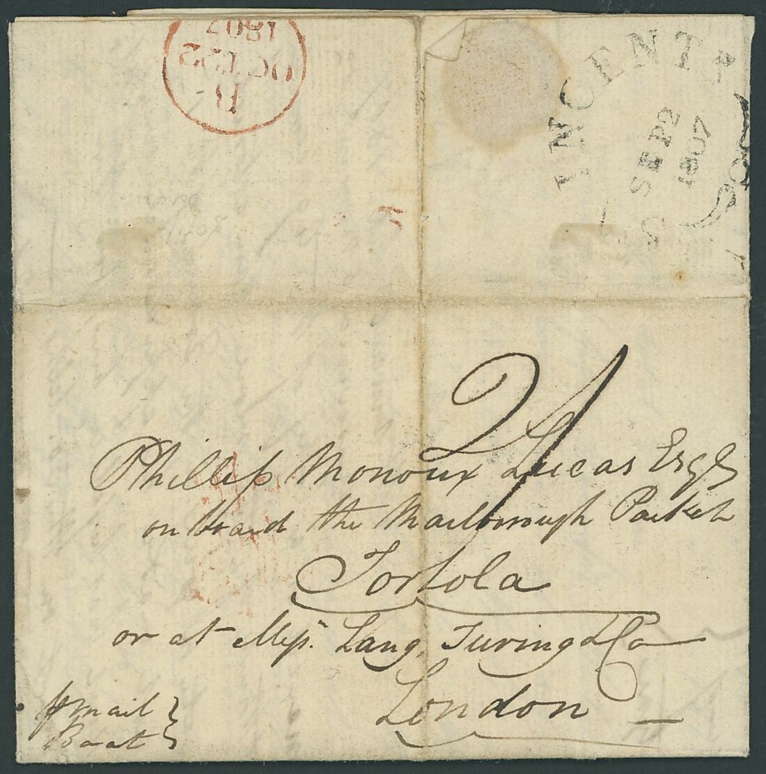1807 entire letter from St. Vincent to Tortola (or London), endorsed "Pr Mail Boat" on reverse St. Vincent Fleuron (2.9); vertical filing fold, fine