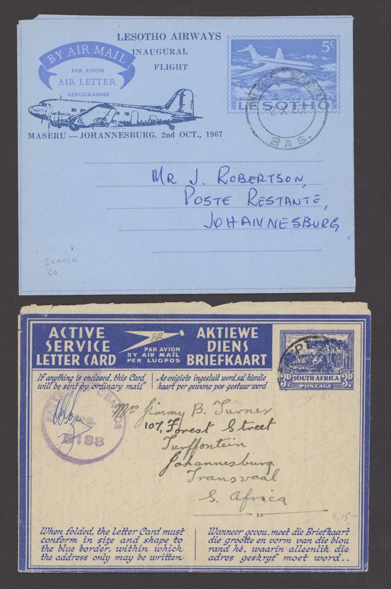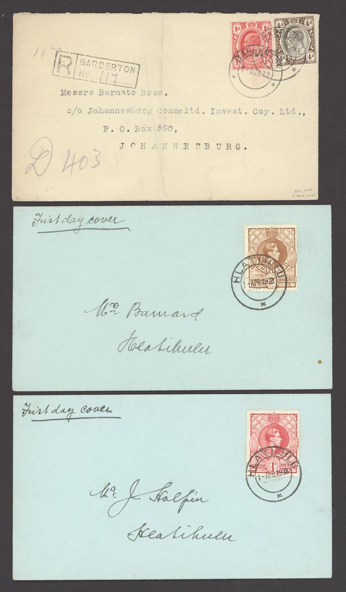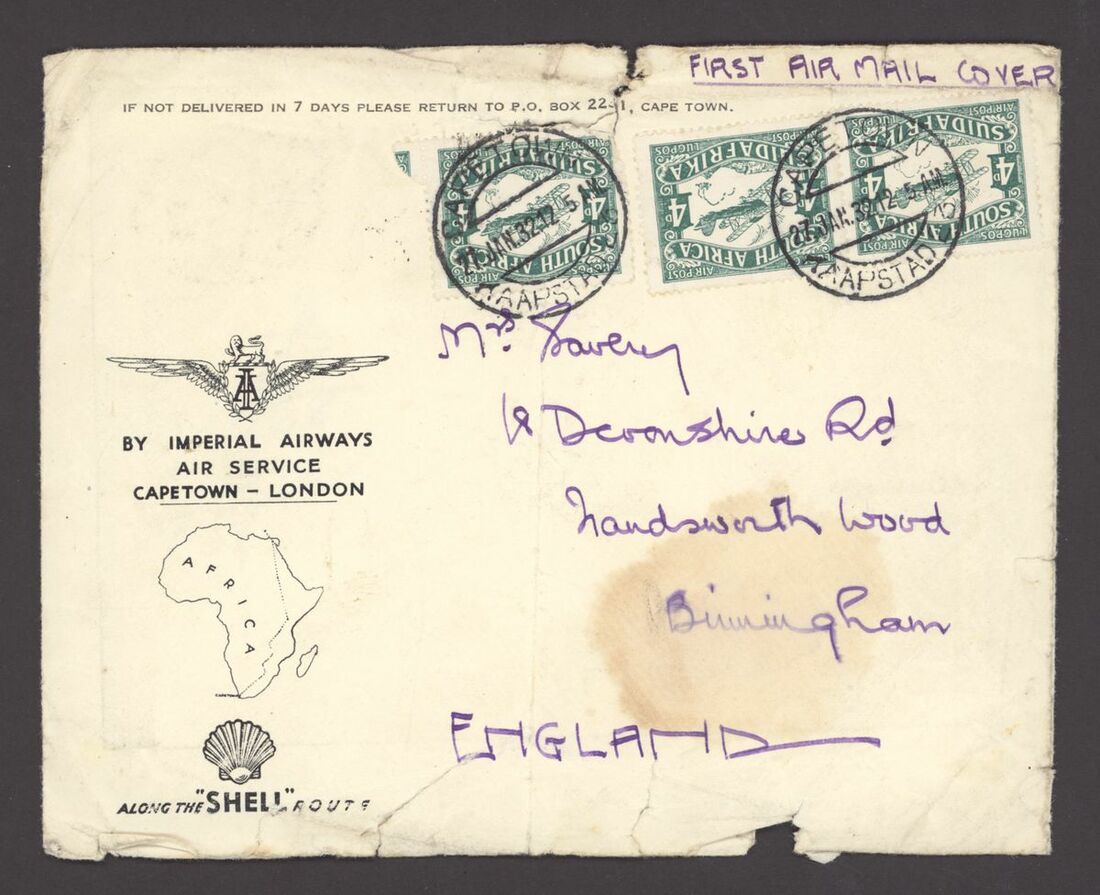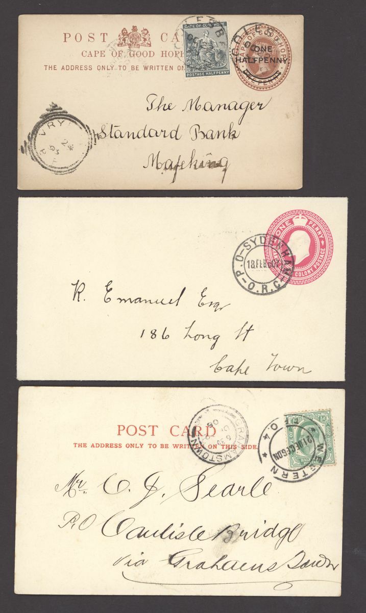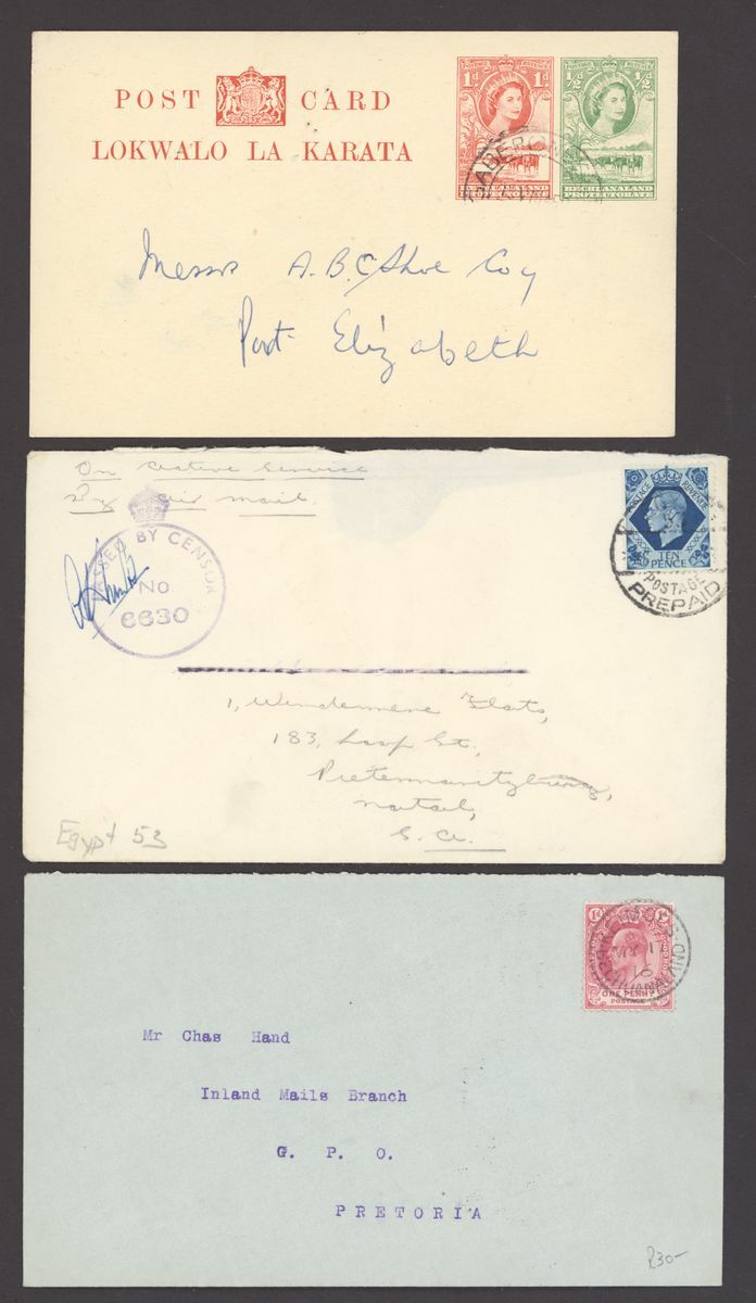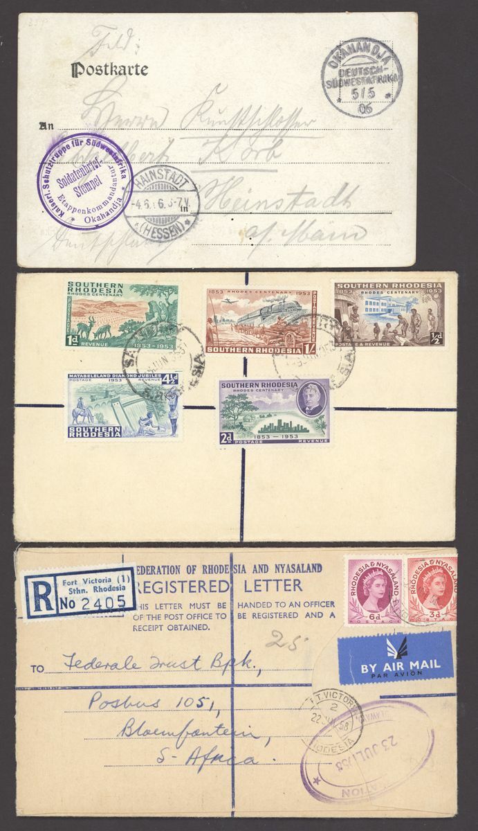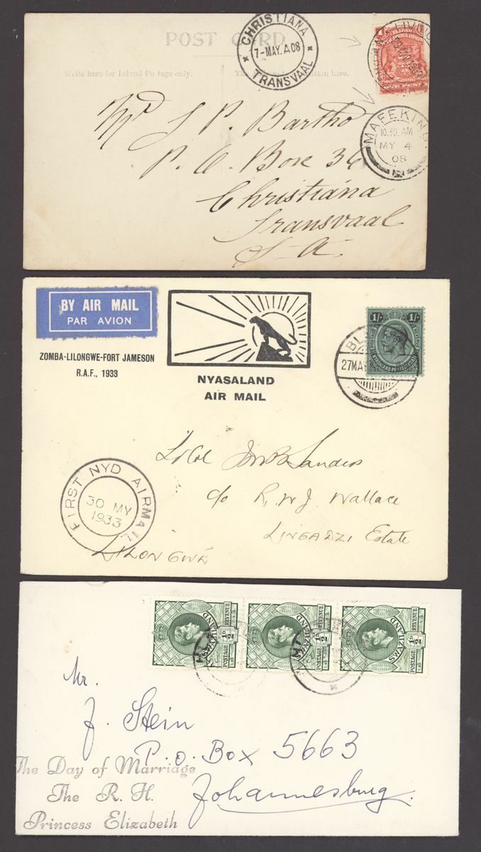 A group of Southern Africa envelopes and postal stationery cards etc. (18) including 1908 Postcard to Transvaal to Rhodesia bearing 1d. Arms tied by Livingstone c.d.s and with Mafeking c.d.s. below, Nyasaland Air mail envelope to Lingadzi Estate bearing KGV 1/- tied by Blantyre c.d.s., 1912 illustrated First Airmail envelope to Birmingham bearing South Afrika 4d. green Airmail (3) tied by Cape Town c.d.s., Swaziland 1938 envelopes (2) one bearing 1938 1d. and the other bearing 2d. both sent on first day of issue, 1912 envelope to Johannesburg bearing Transvaal KEVII 1d. and 4d., etc.