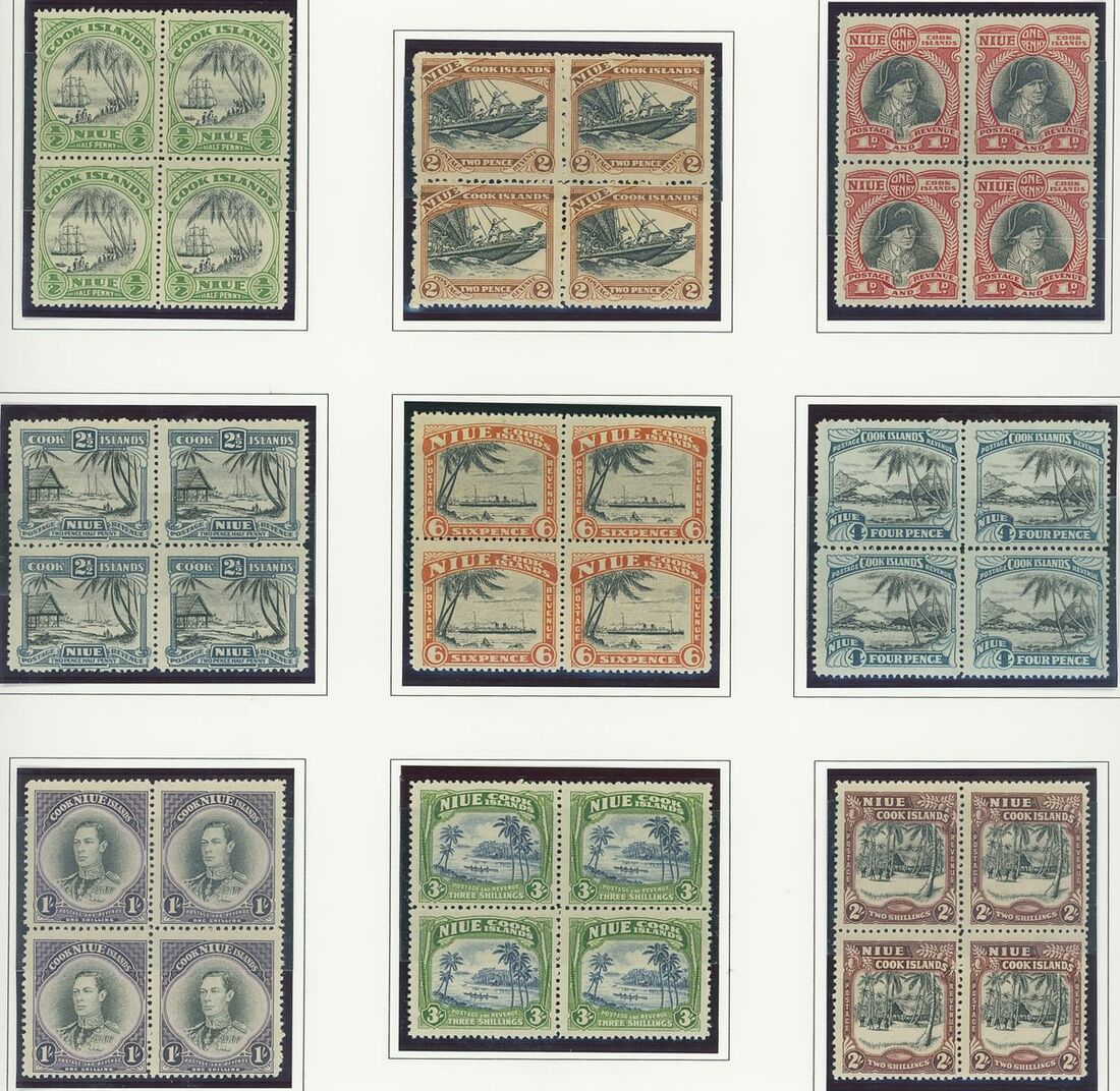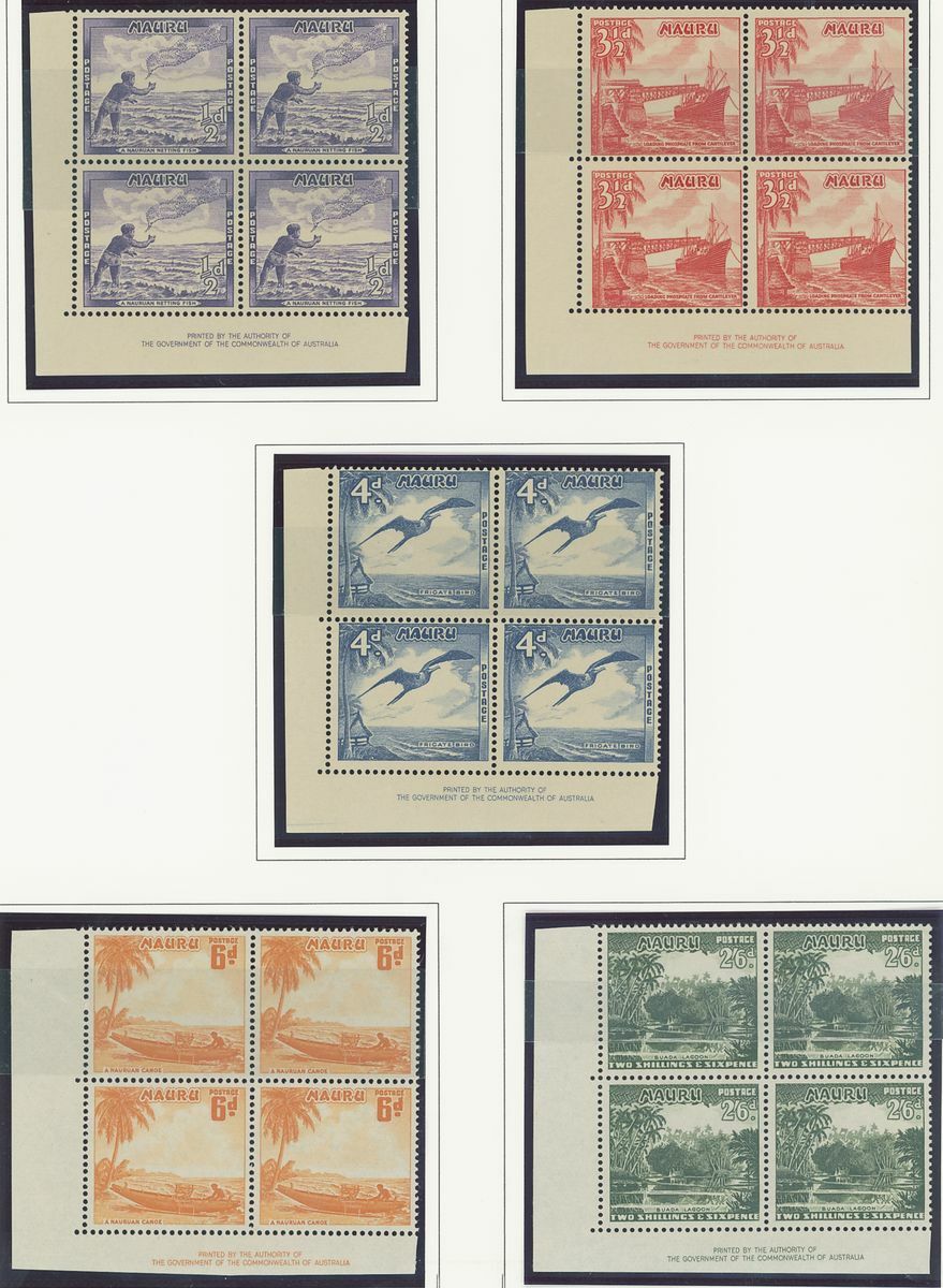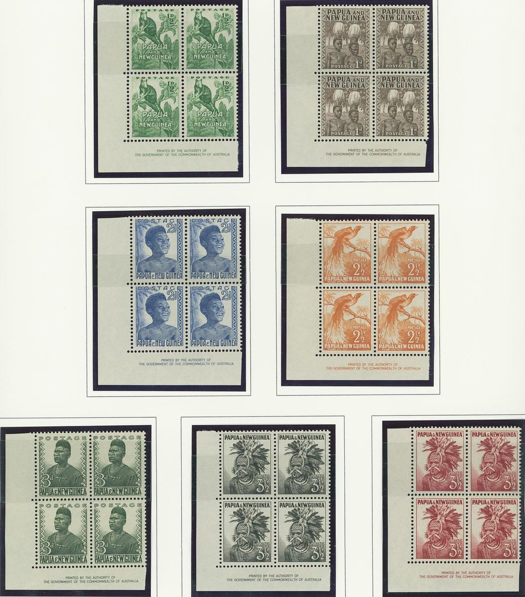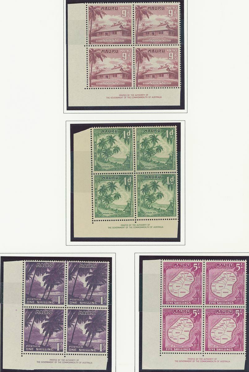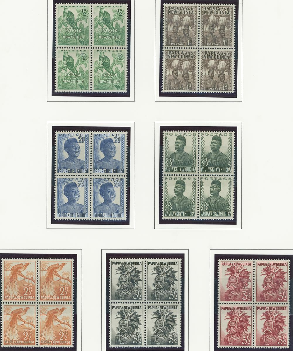 A Pacific collection of complete sets all in blocks of four including Cook Islands with 1949 set to 3/- all with imprint, Nauru with the 1954 set to 5/- all with imprint, New Zealand with 1938-44 set of seven, Niue 1944-46 set to 3/-, Papua New Guinea 1952 set to £1 (2), Papua 1939 set of six, Tonga 1942-49 set to 5/- and Western Samoa 1945 set to 3/-; fine and fresh, lightly mounted or unmounted mint. S.G. cat. value £979