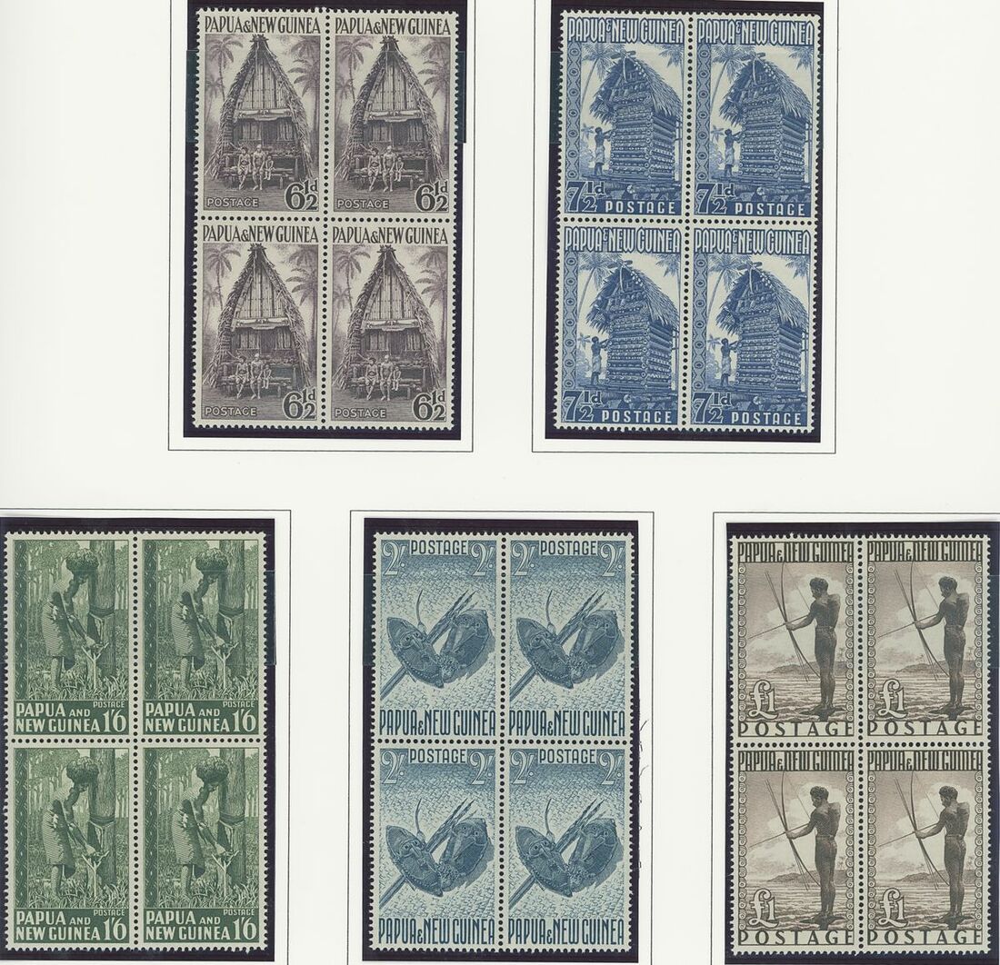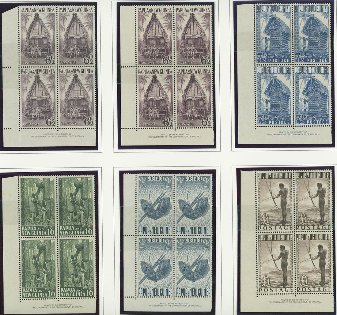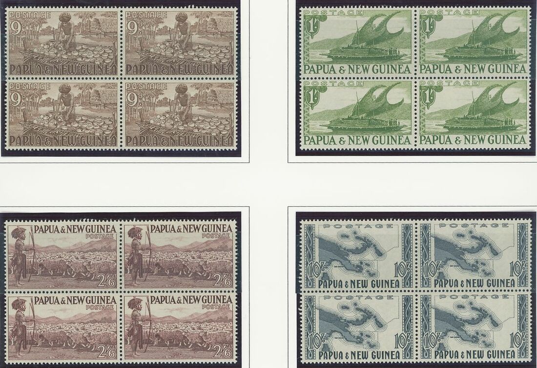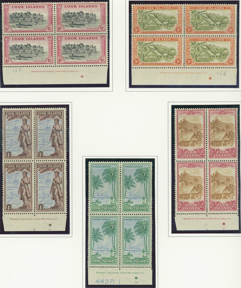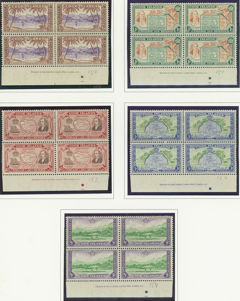 A Pacific collection of complete sets all in blocks of four including Cook Islands with 1949 set to 3/- all with imprint, Nauru with the 1954 set to 5/- all with imprint, New Zealand with 1938-44 set of seven, Niue 1944-46 set to 3/-, Papua New Guinea 1952 set to £1 (2), Papua 1939 set of six, Tonga 1942-49 set to 5/- and Western Samoa 1945 set to 3/-; fine and fresh, lightly mounted or unmounted mint. S.G. cat. value £979