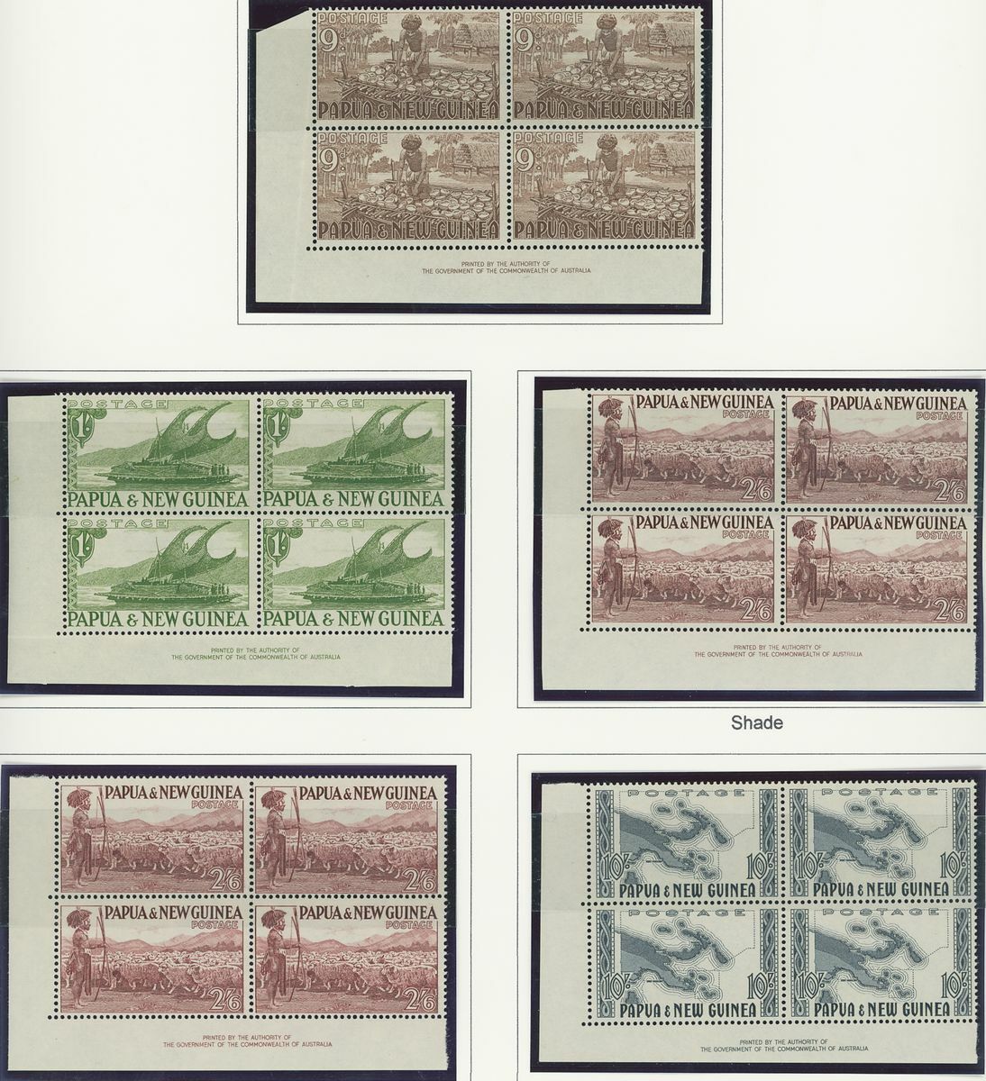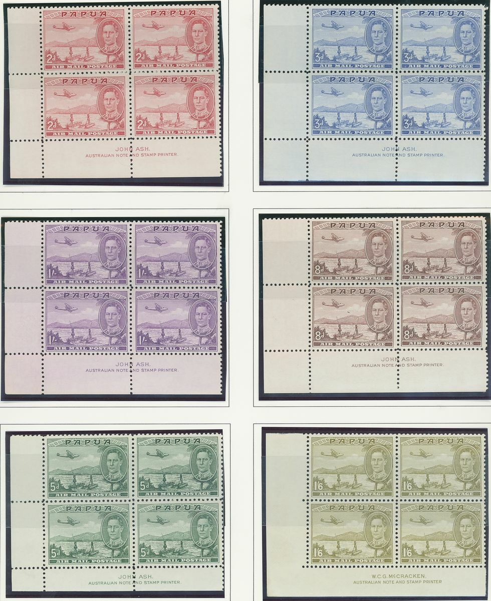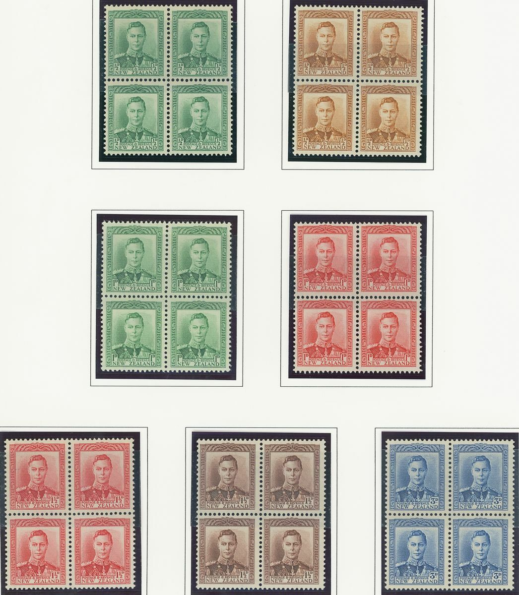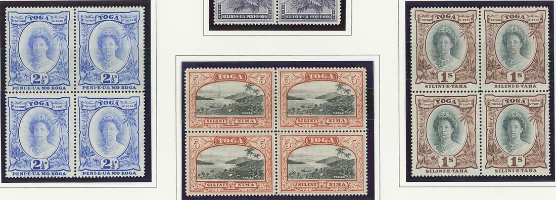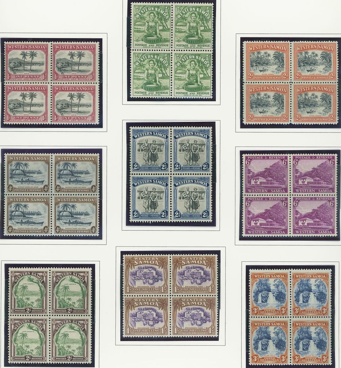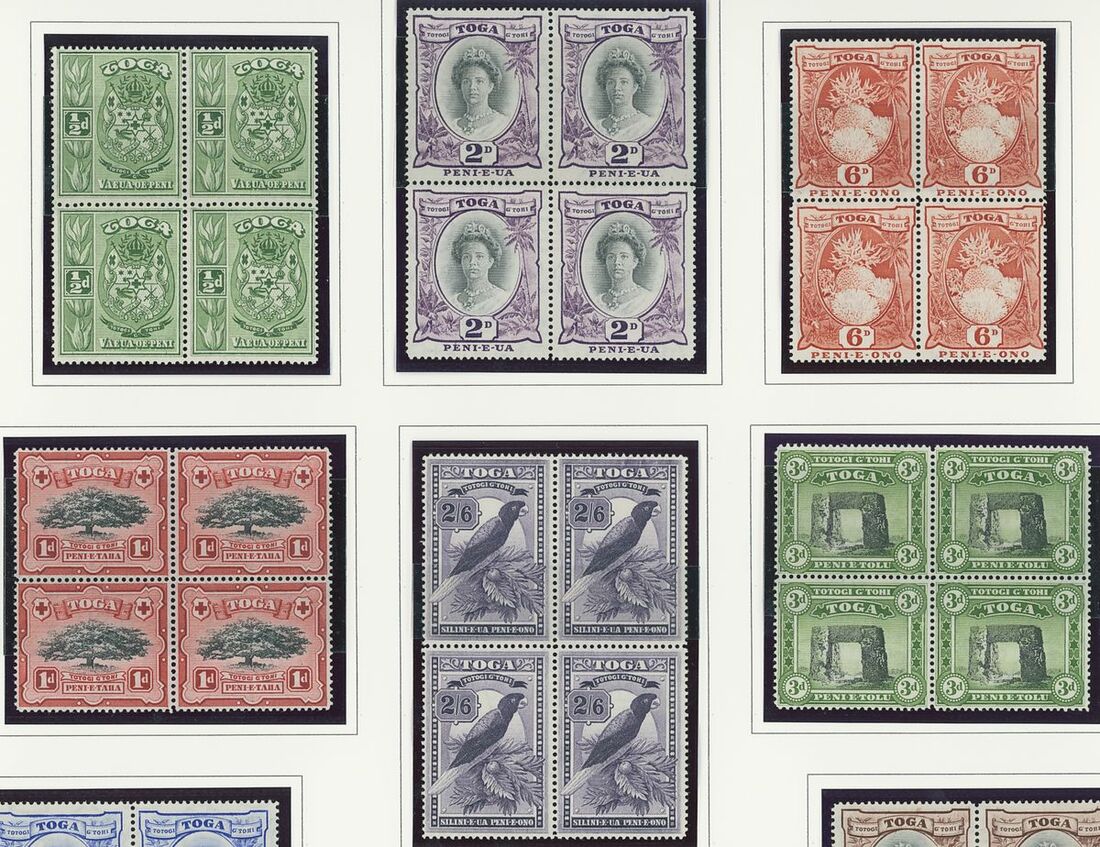A Pacific collection of complete sets all in blocks of four including Cook Islands with 1949 set to 3/- all with imprint, Nauru with the 1954 set to 5/- all with imprint, New Zealand with 1938-44 set of seven, Niue 1944-46 set to 3/-, Papua New Guinea 1952 set to £1 (2), Papua 1939 set of six, Tonga 1942-49 set to 5/- and Western Samoa 1945 set to 3/-; fine and fresh, lightly mounted or unmounted mint. S.G. cat. value £979