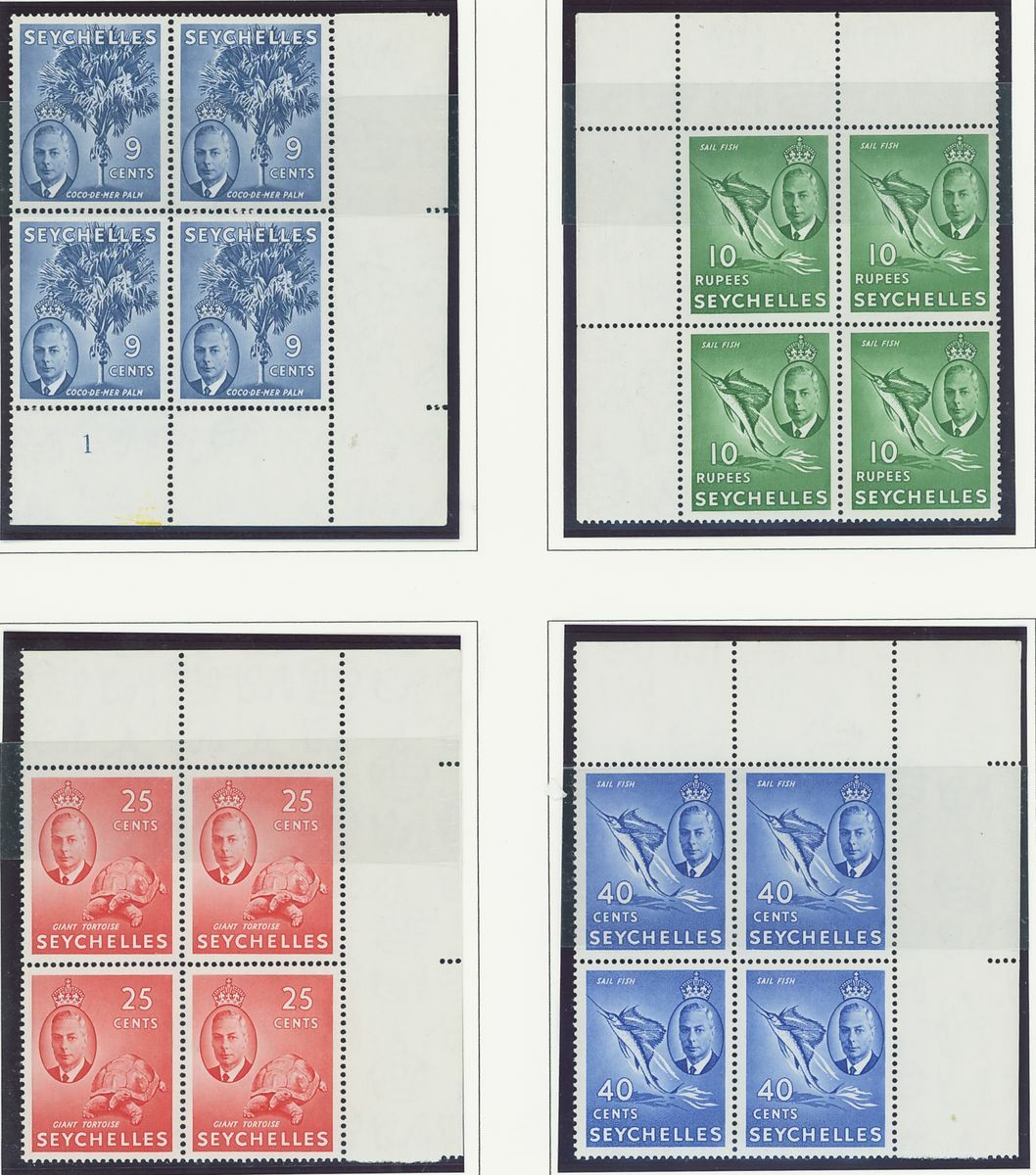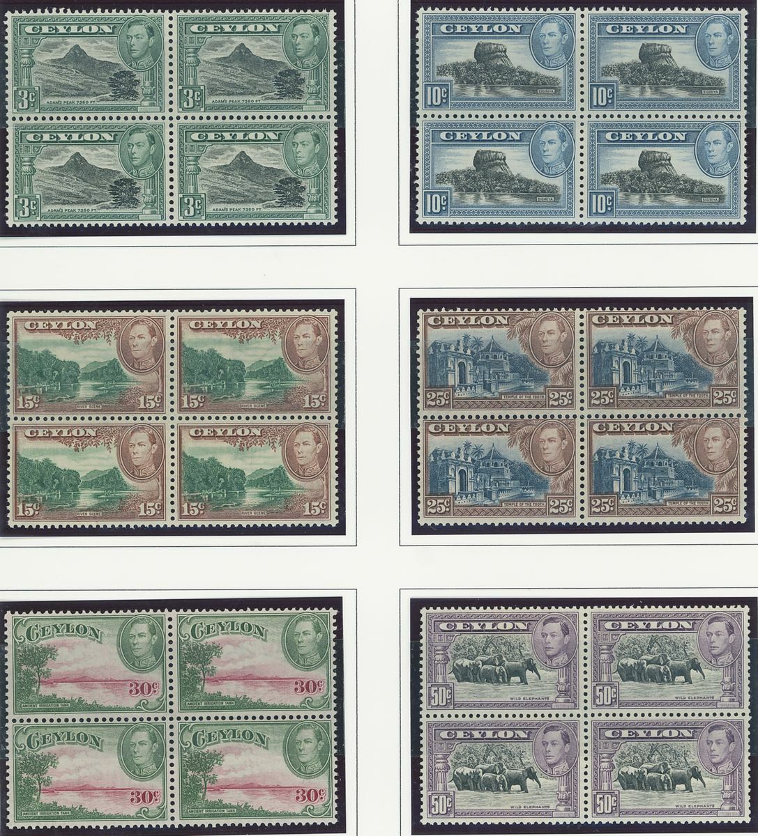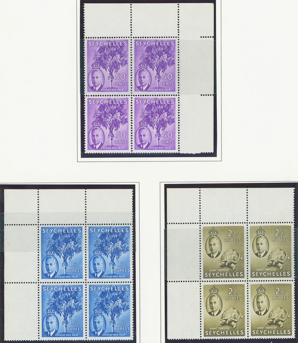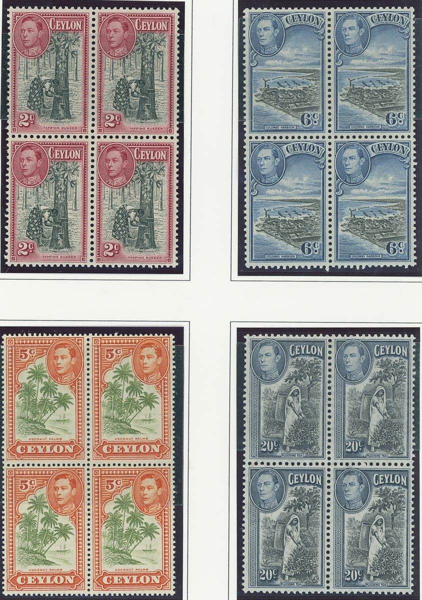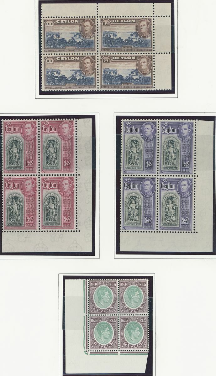 An Indian Ocean collection of full sets in blocks of four on album pages including Ceylon 1938-49, Mauritius 1938-49, Seychelles 1952 and Maldives 1950 set; fine and fresh lightly mounted or unmounted mint, mostly marginal and some with imprint or plate numbers. S.G. cat. value £1,500+