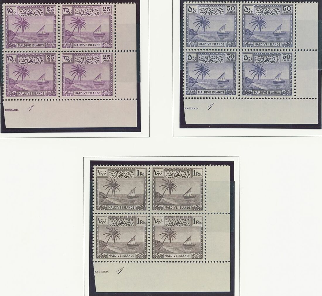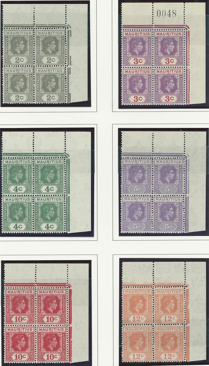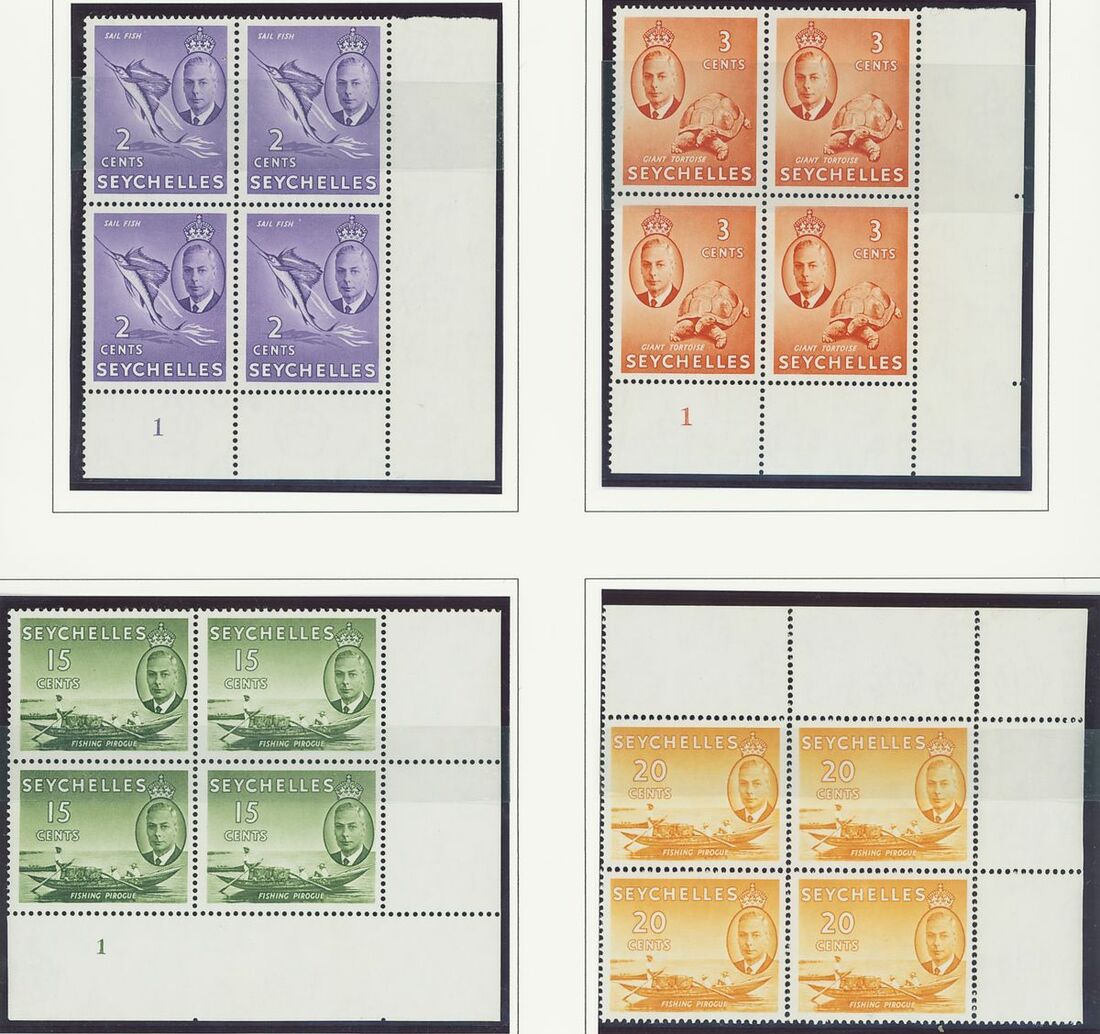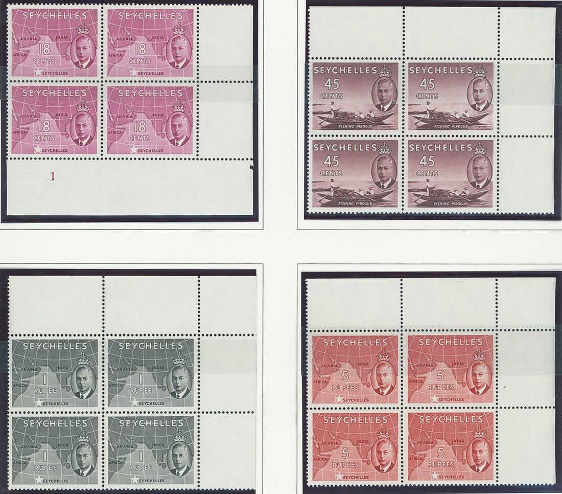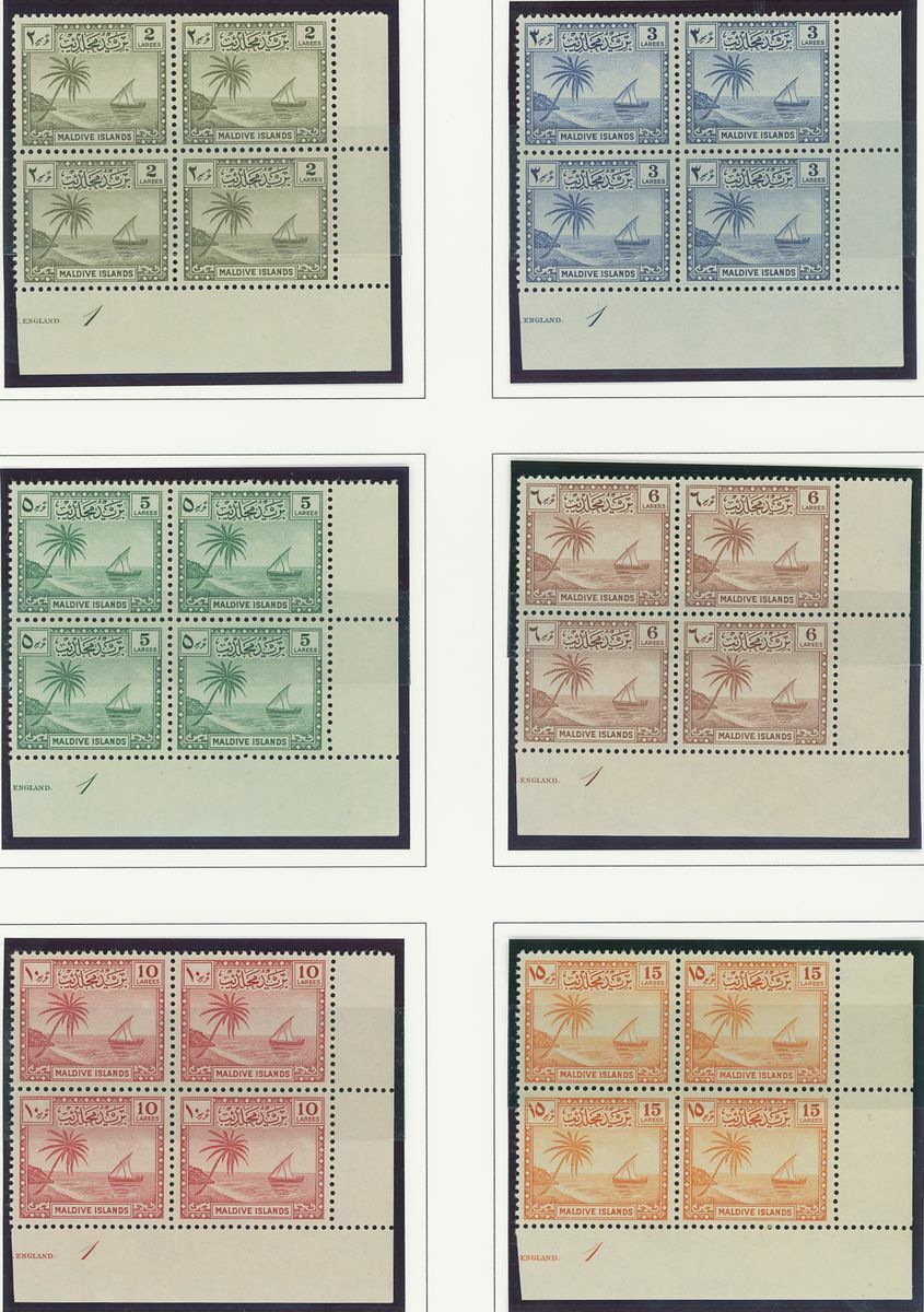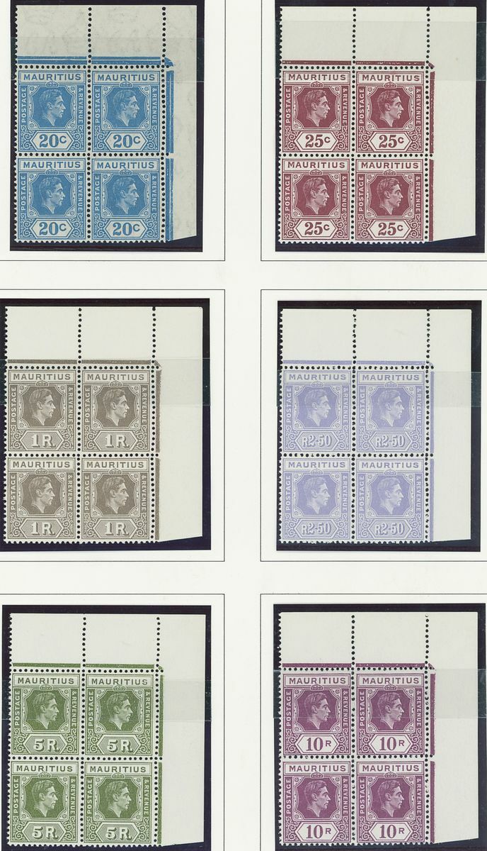 An Indian Ocean collection of full sets in blocks of four on album pages including Ceylon 1938-49, Mauritius 1938-49, Seychelles 1952 and Maldives 1950 set; fine and fresh lightly mounted or unmounted mint, mostly marginal and some with imprint or plate numbers. S.G. cat. value £1,500+