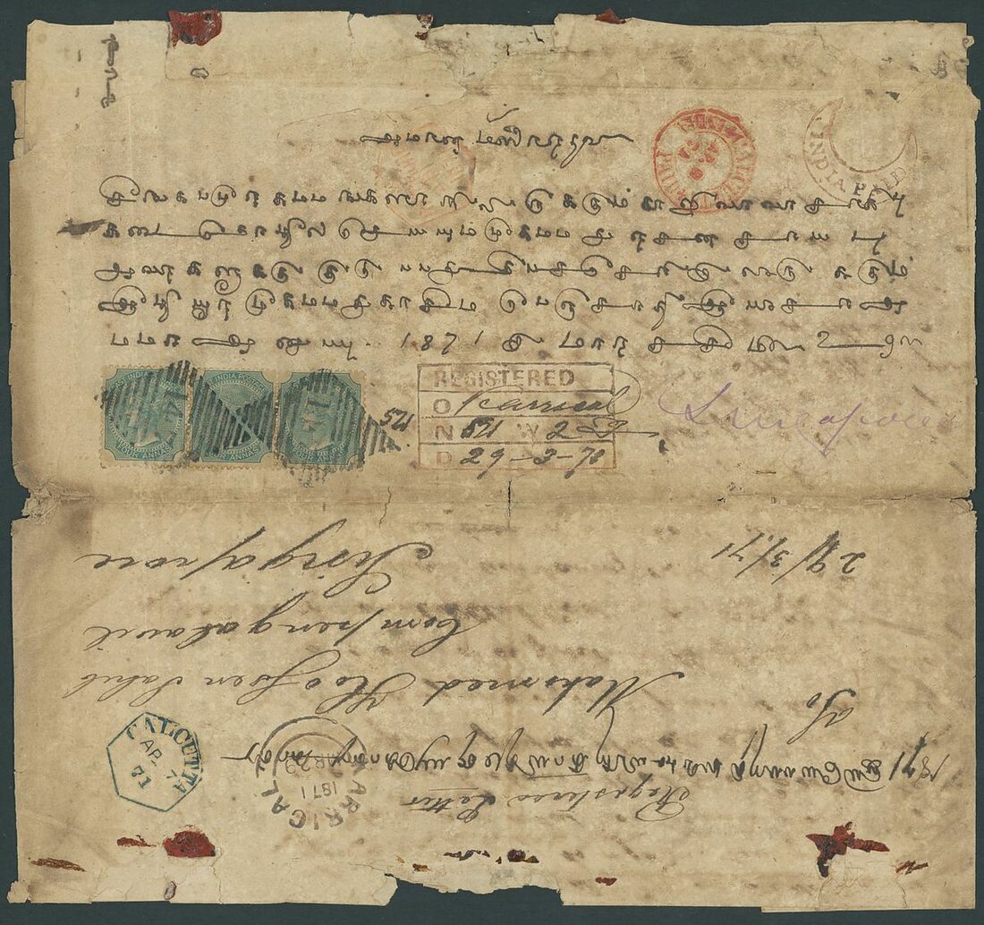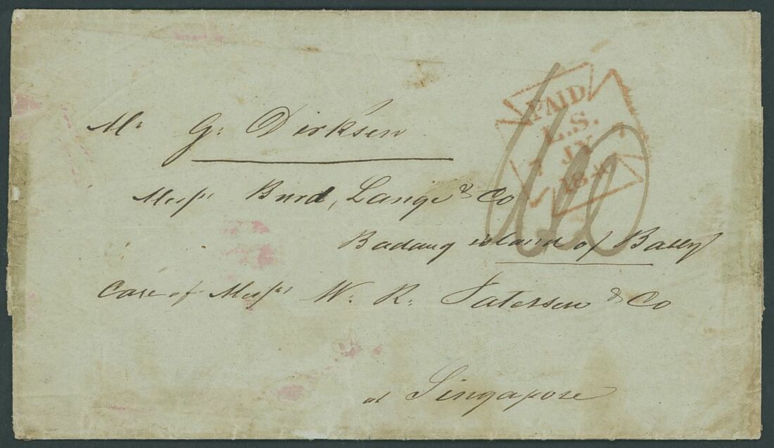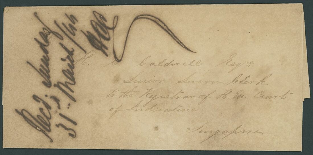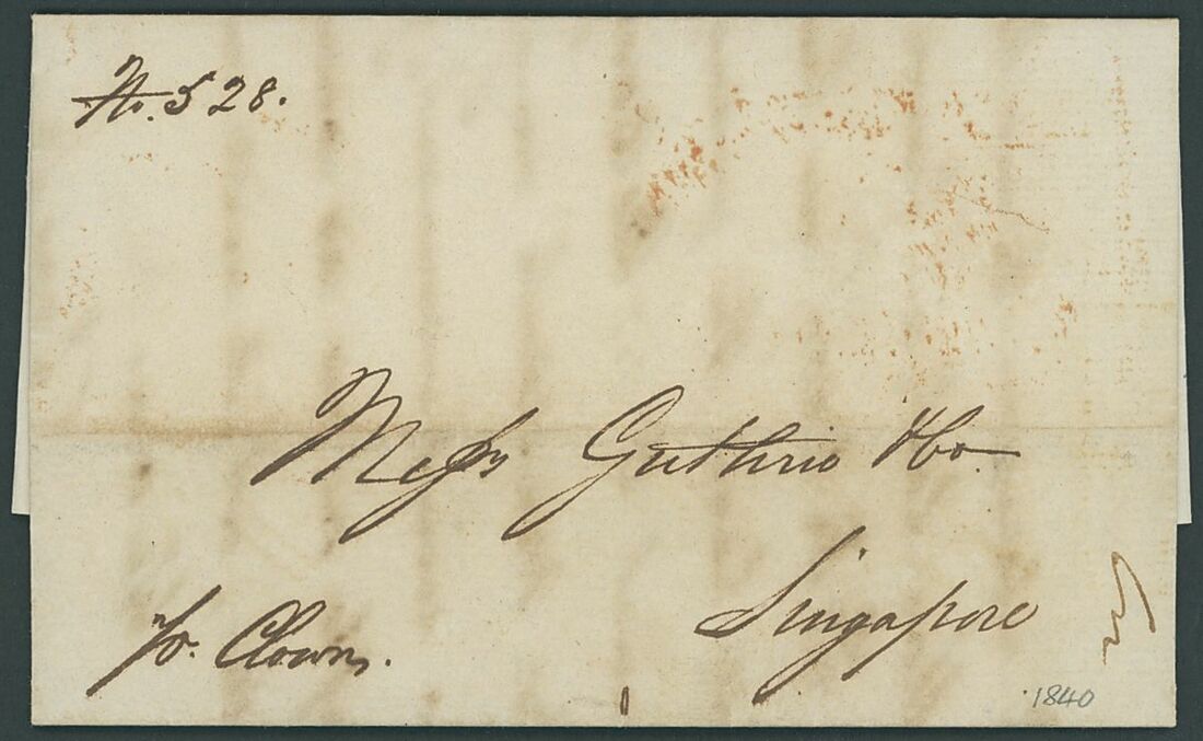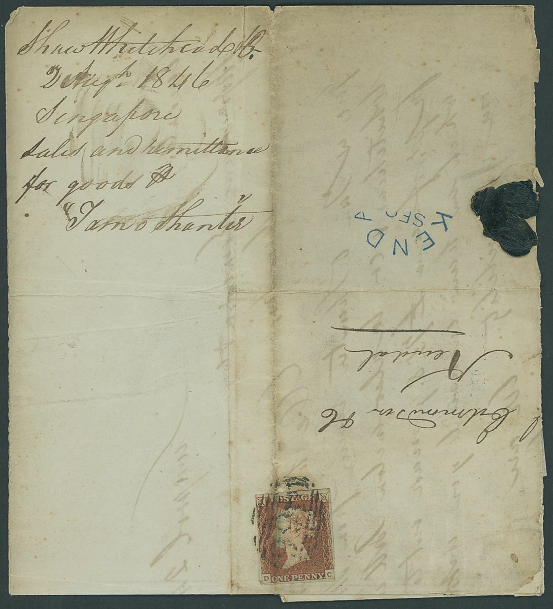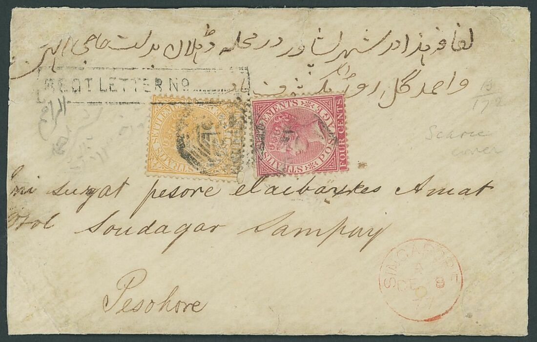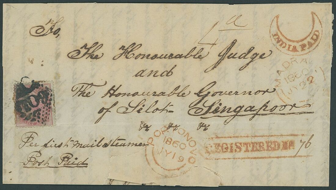 1820-1948 postal history selection (40) including 1820 letter from Canton to London with very interesting content about a boat attack finished in blood and about the massacre of Europeans in the Island of Manilla; 1860 letter registered from Portonovo India to Singapore bearing 8a. cancelled by C109 obliterator; 1874 telegram with envelope from Finland to Singapore; 1877 envelope registered from Singapore to Peshawar, bearing 4c. and 8c. cancelled by "B/172" obliterator, showing framed