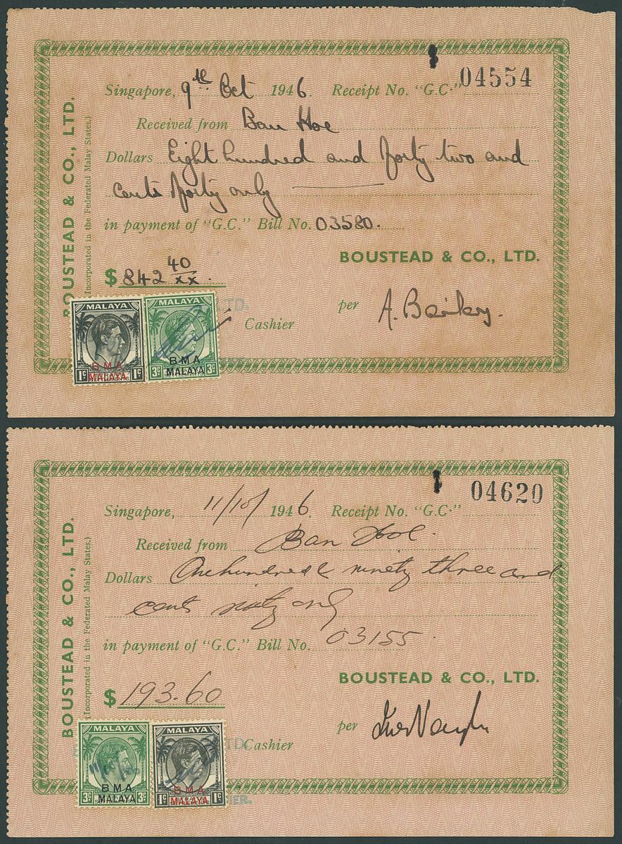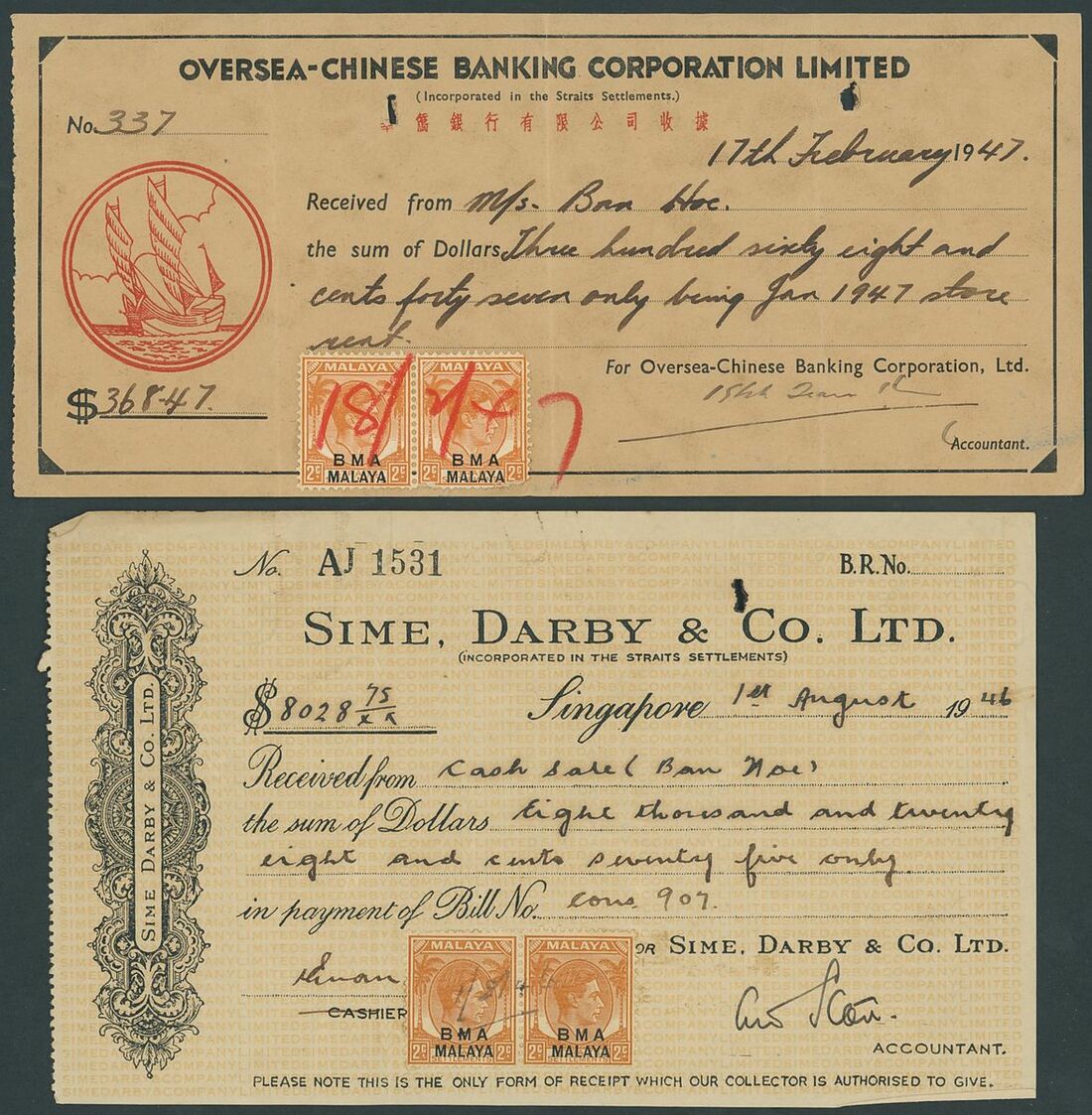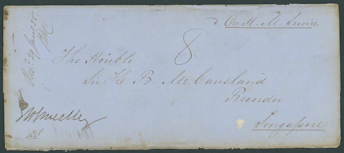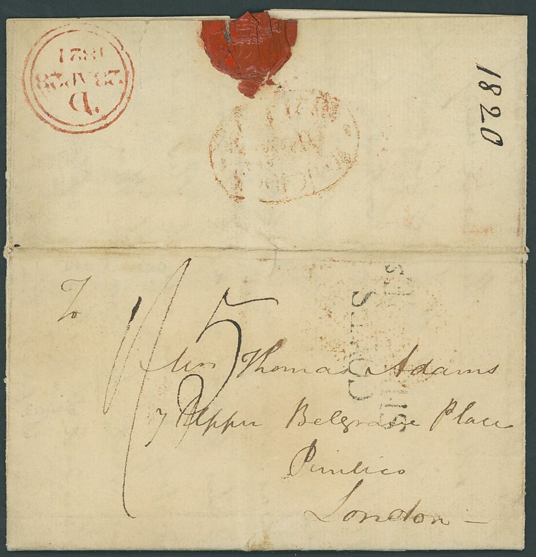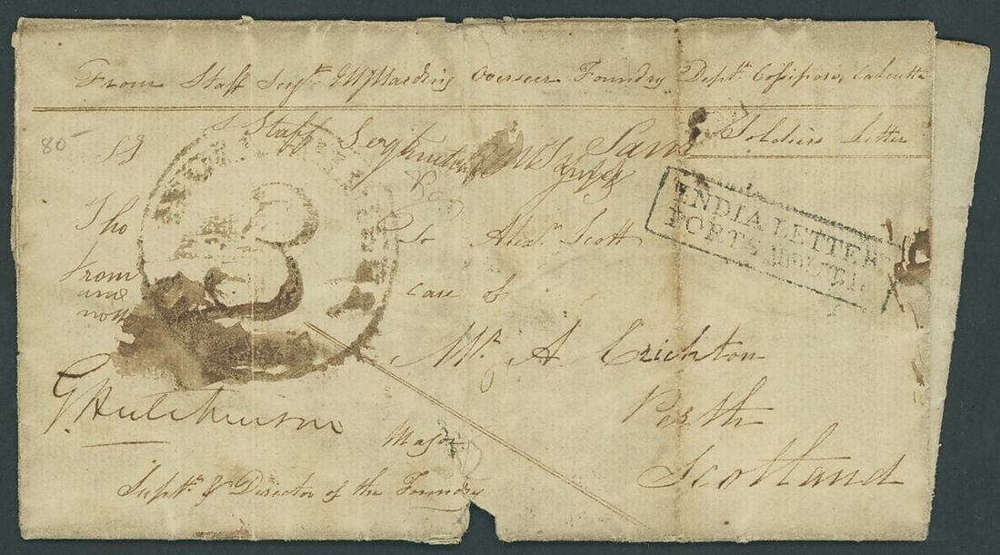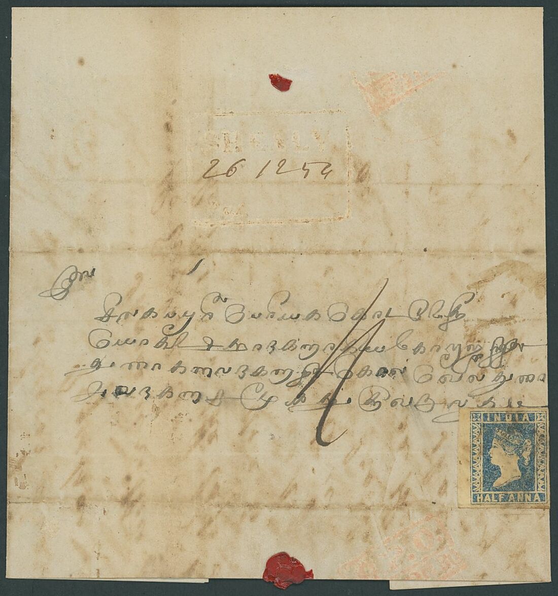 1820-1948 postal history selection (40) including 1820 letter from Canton to London with very interesting content about a boat attack finished in blood and about the massacre of Europeans in the Island of Manilla; 1860 letter registered from Portonovo India to Singapore bearing 8a. cancelled by C109 obliterator; 1874 telegram with envelope from Finland to Singapore; 1877 envelope registered from Singapore to Peshawar, bearing 4c. and 8c. cancelled by "B/172" obliterator, showing framed