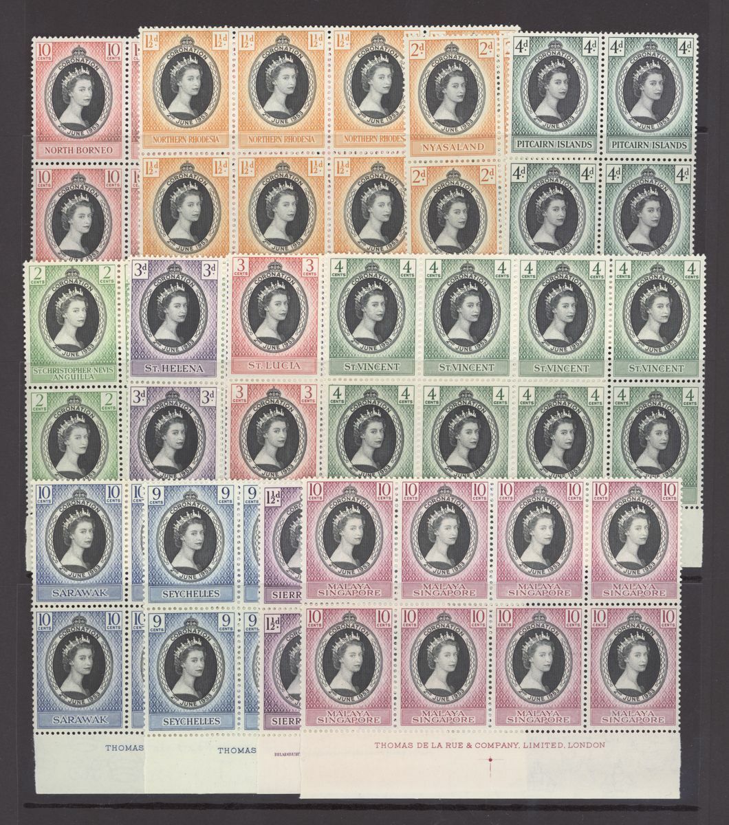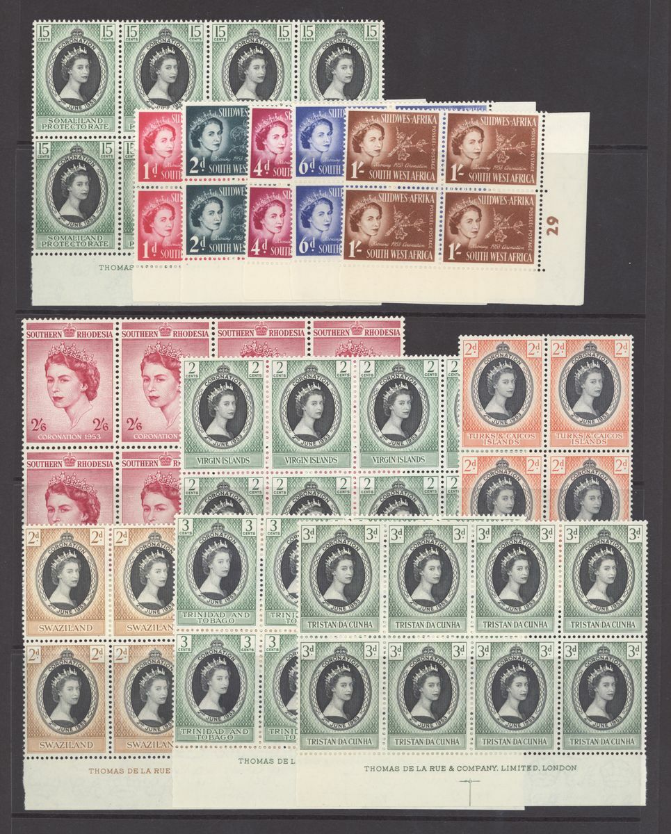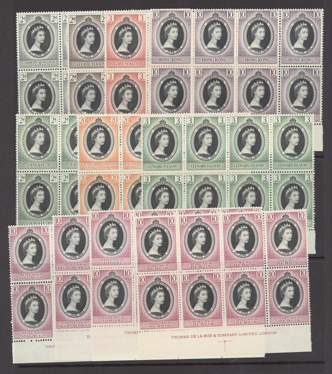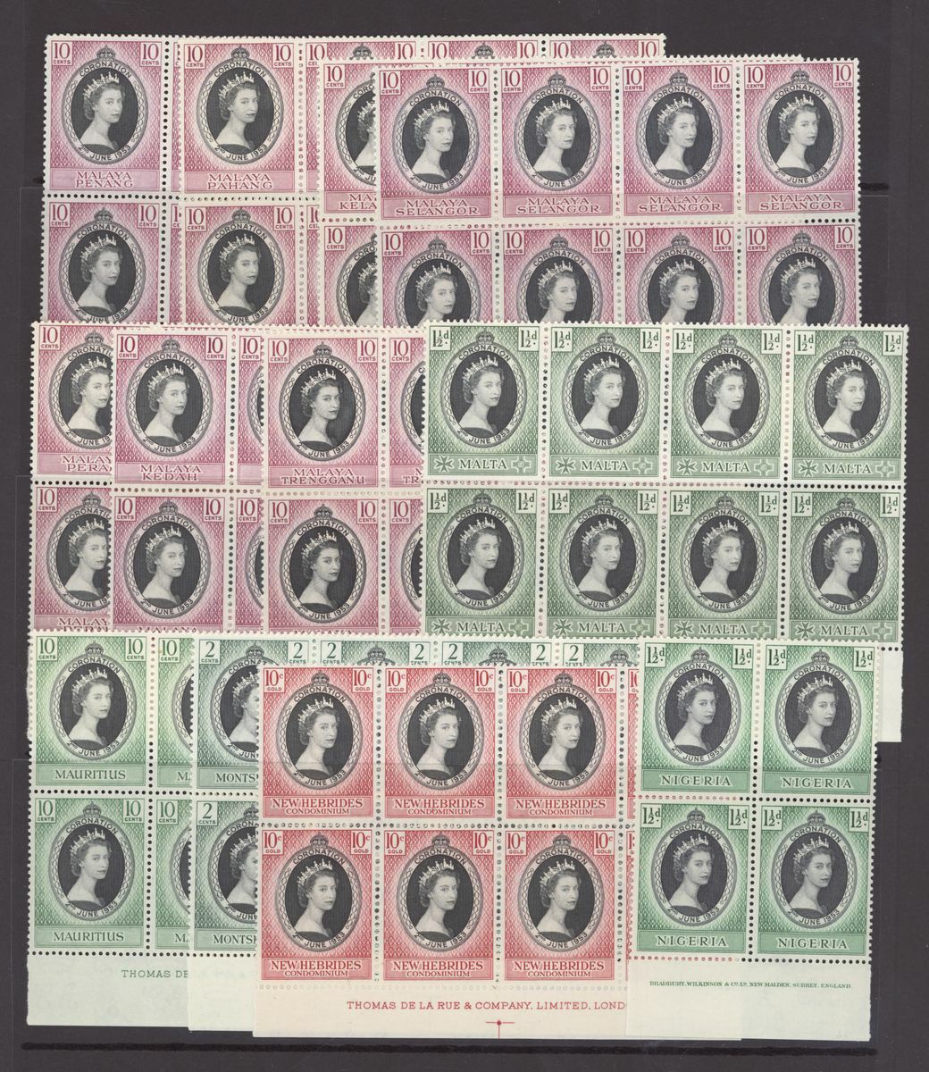A group of mainly mint sets including Hong Kong (two sets), and the Malayan States of Johore, Kedah, Kelantan, Malacca, Negri Sembillan, Pahang, Penang, Perak, Perlis, Selangor and Trengganu all in blocks of four; also 1953 Coronation, largely complete in imprint blocks of four or eight; fine and fresh mint
