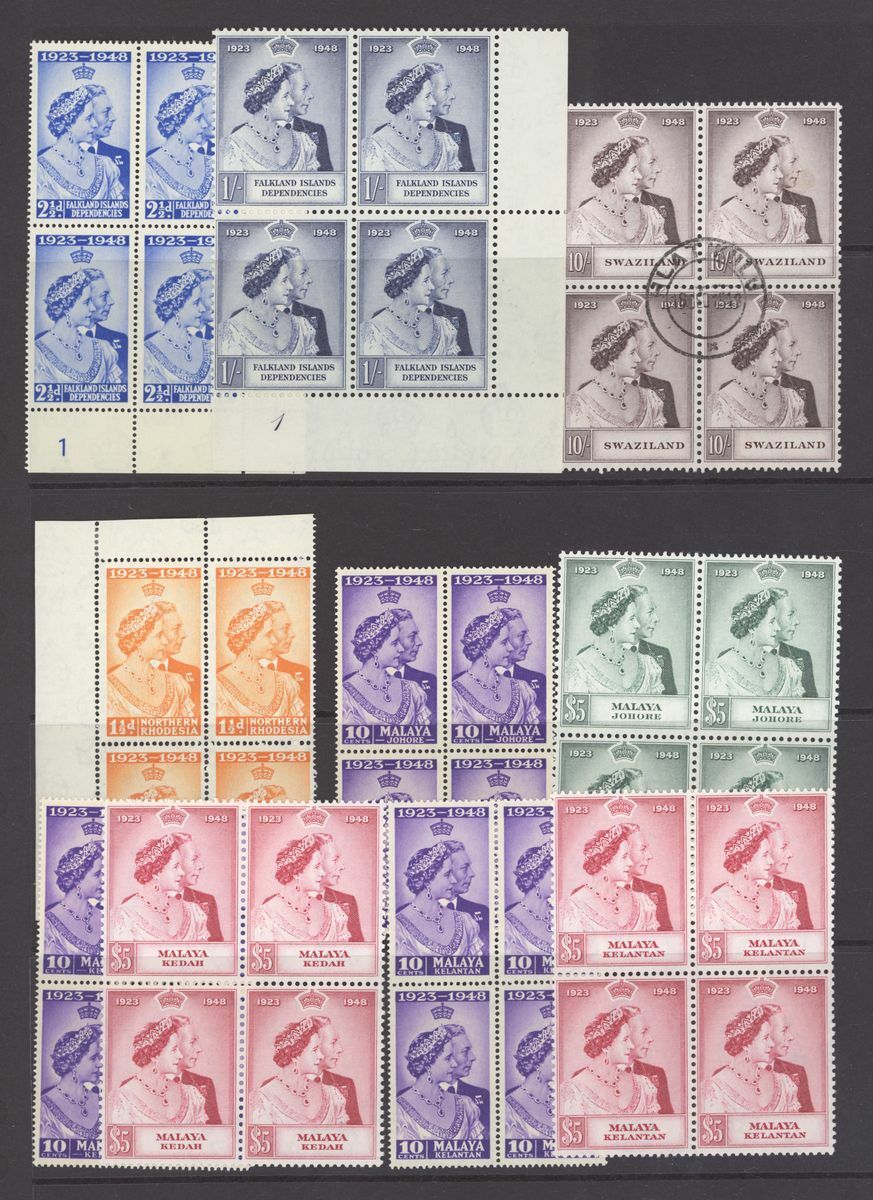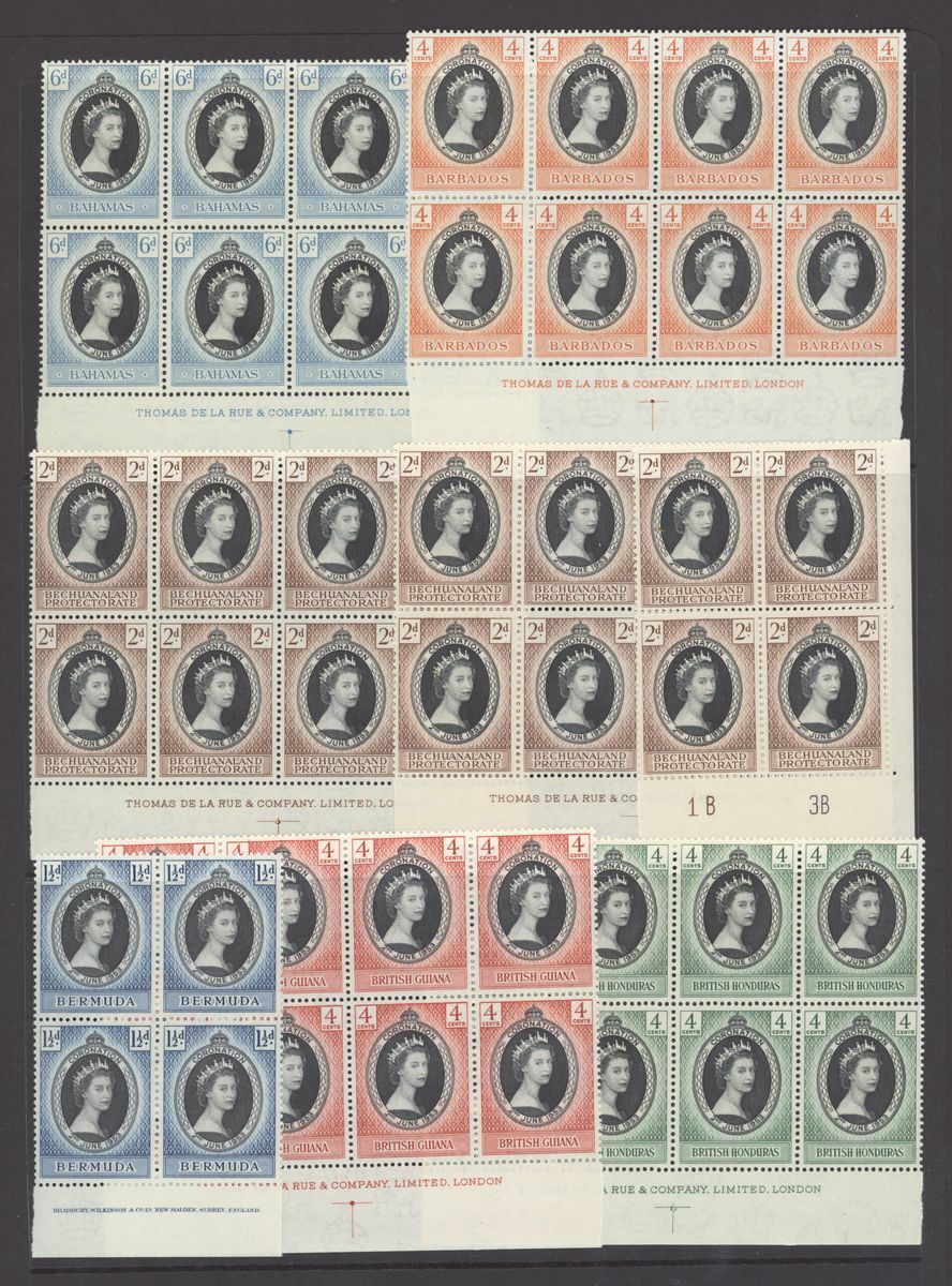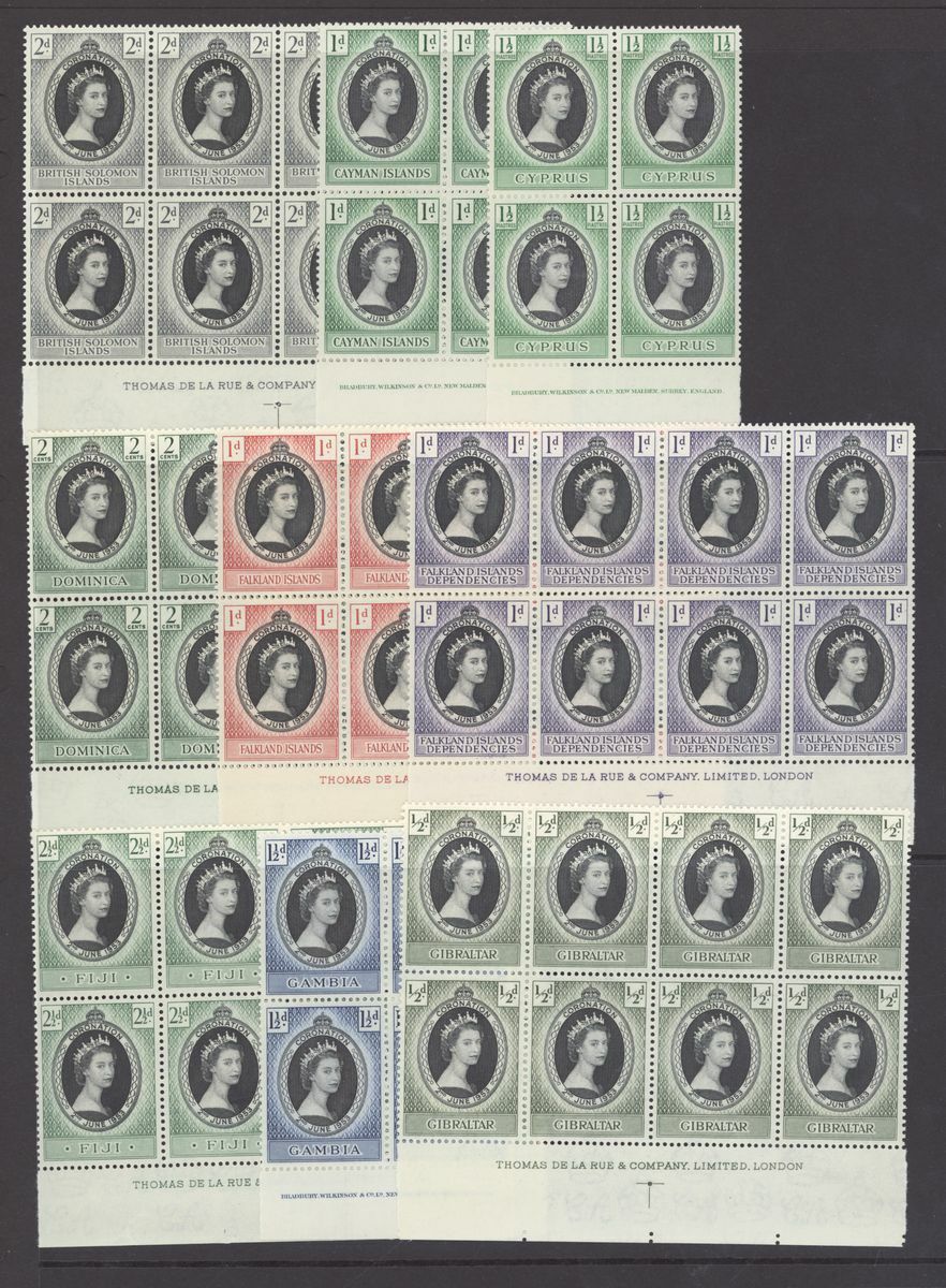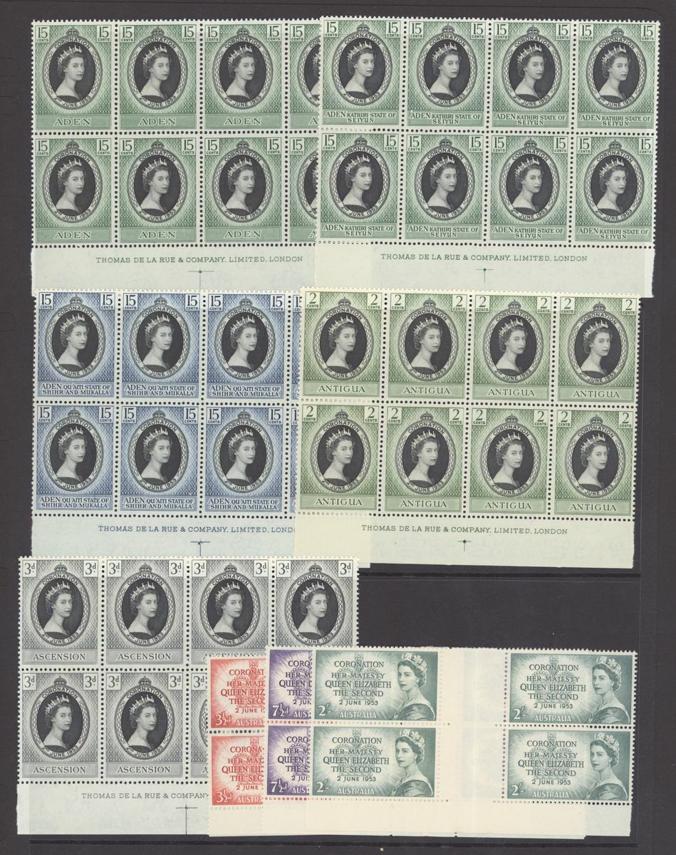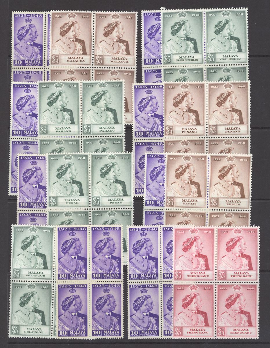 A group of mainly mint sets including Hong Kong (two sets), and the Malayan States of Johore, Kedah, Kelantan, Malacca, Negri Sembillan, Pahang, Penang, Perak, Perlis, Selangor and Trengganu all in blocks of four; also 1953 Coronation, largely complete in imprint blocks of four or eight; fine and fresh mint
