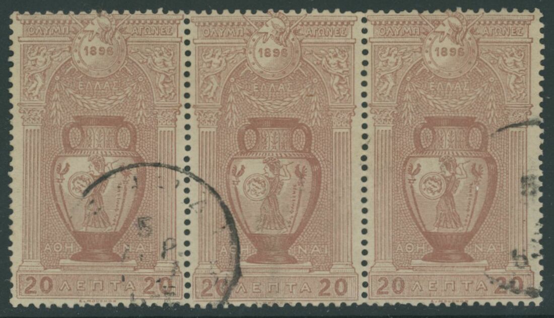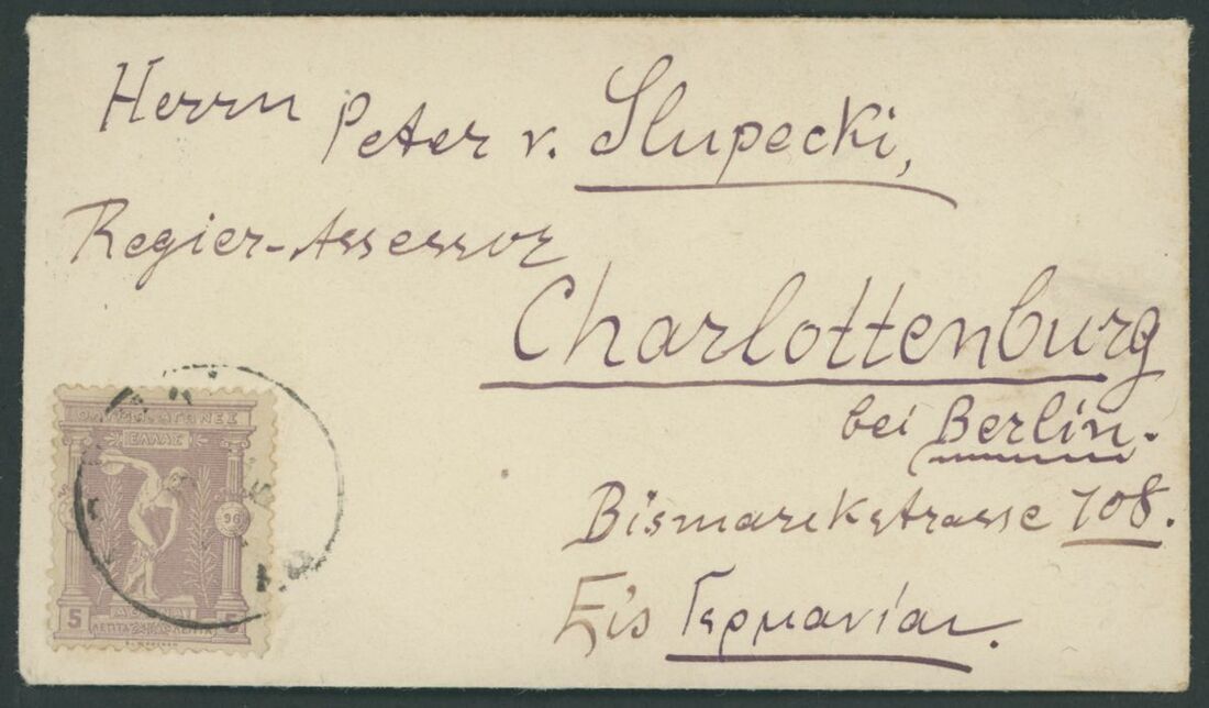 Athens: 1896 5L. Discus thrower, tied to small 1897 envelope addressed to Berlin, also 20L. horizontal strip of three used