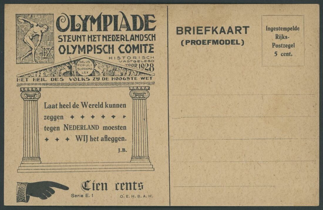 Amsterdam: 1928 essay for 5c. postal stationery card in black, showing a discus thrower and with four line inscription and E1 below; small water stain on reverse, fine and rare