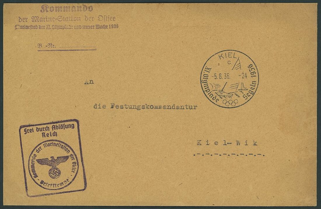 Berlin: 1936 stampless official envelope to Kiel with "Kommando der Marine Station der Ostsee/Marinestab der XI. Olympiade und Kieler Woche 1936" cachet and with special "