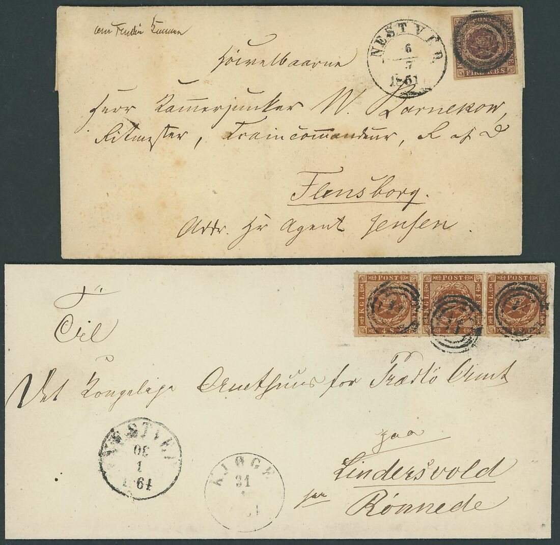 1851-63 Nevsted postal history duo including 1851 to Flensborg bearing 4 R.B.S. (Ferslew-2, plate I, 73) with Arctander certificate (1980); 1864 to Lindersvold bearing 1863 rouletted 4sk. (3) with Kaiser certificate (1980). Mixed condition, an attractive duo.