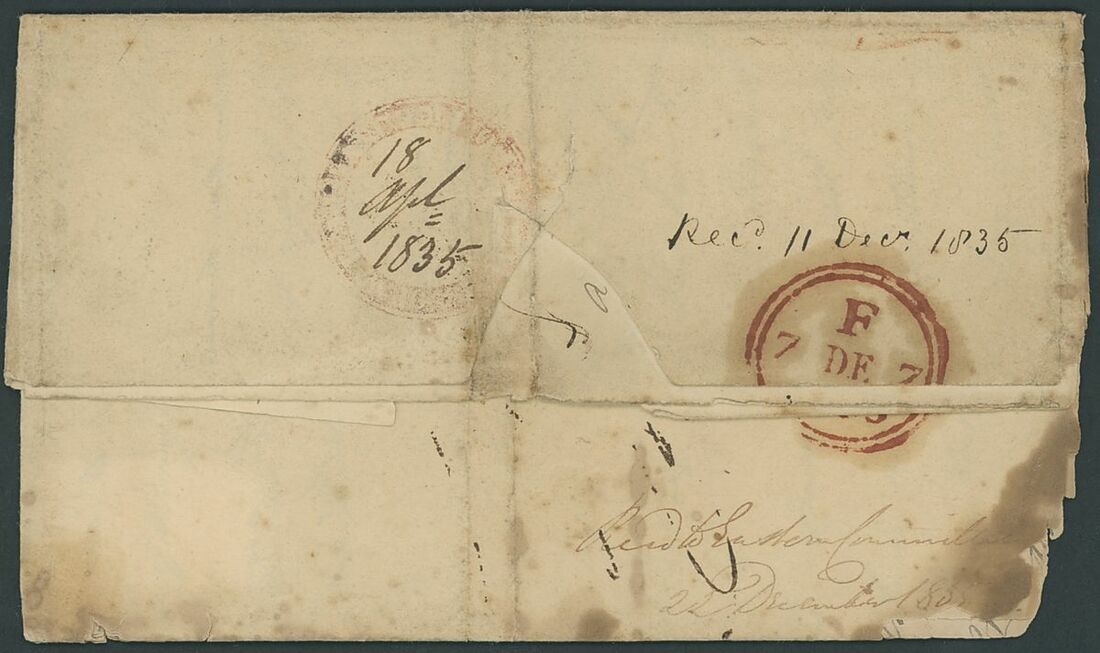 1835 (18 Apr.) entire letter to London, rated "1/1" and showing, on reverse, fair circular intaglio