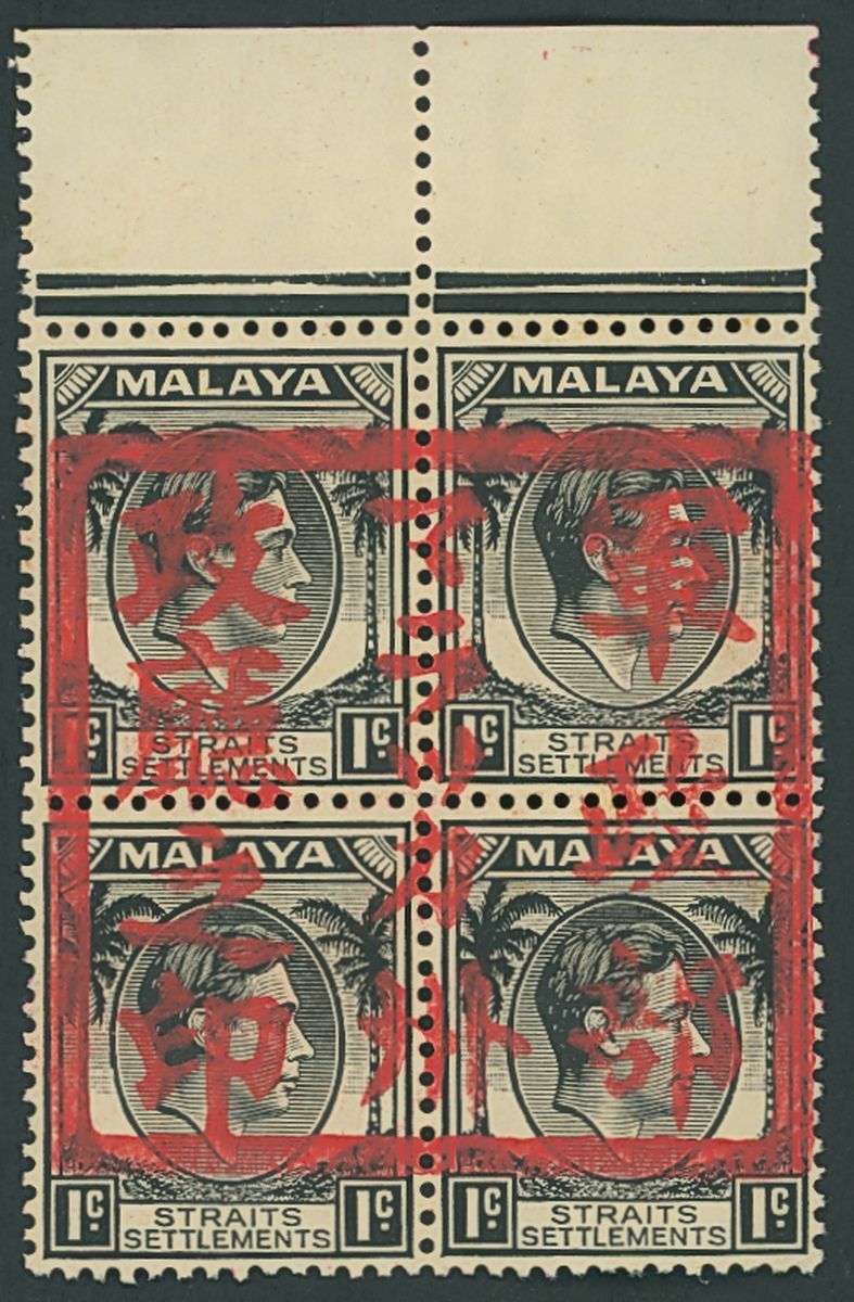 1942 1c. black, block of four with upper margin showing full 'Military Administration Malacca State Government Seal', unmounted mint with usual brown gum, fine. S.G. J45, £700+