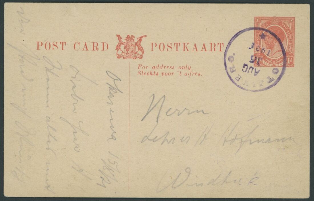Otjivero: 1921 (15 Aug.) 1d. post card to Windhoek cancelled by B1 rubber cancel in violet. A rare cancel.