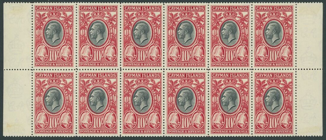 1935 Script 10/- black and scarlet, a block of twleve with margins on either side, being two complete rows of six; fine unmounted mint. S.G. 107, £1,200+