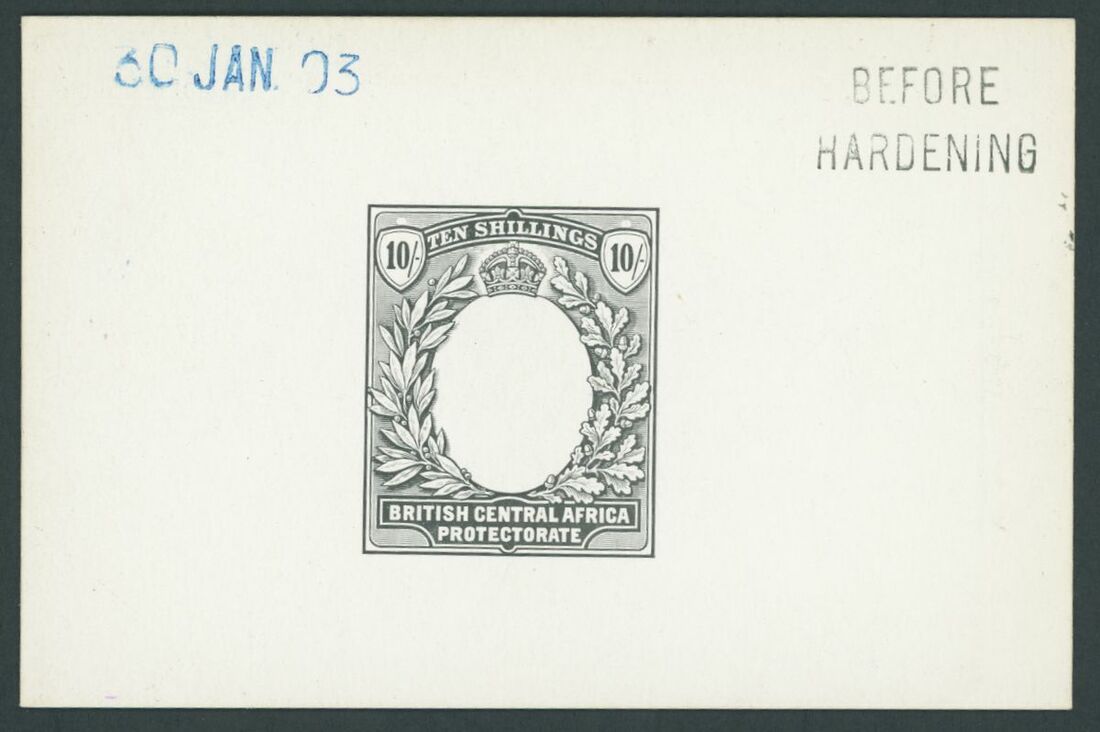 10/- frame only die proof in black on white glazed card (90 x 60mm.), endorsed