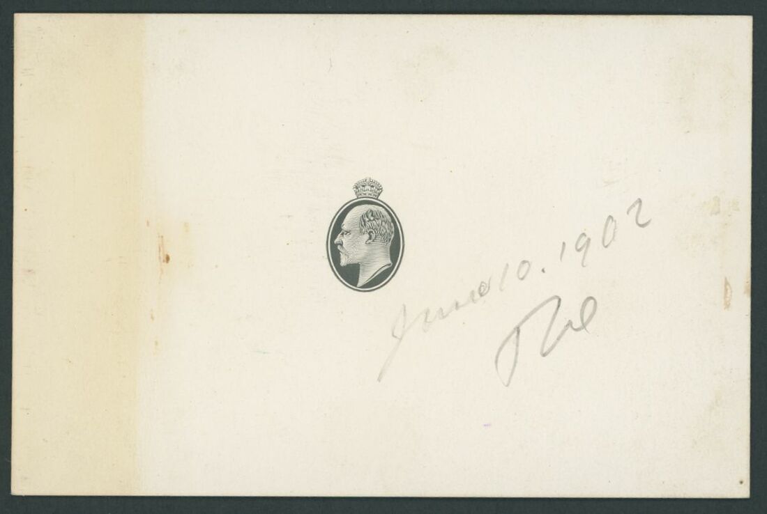 1902 head only die proof in black on white glazed card (90 x 60mm.), dated ' June 10. 1902' in pencil and signed below, fine.