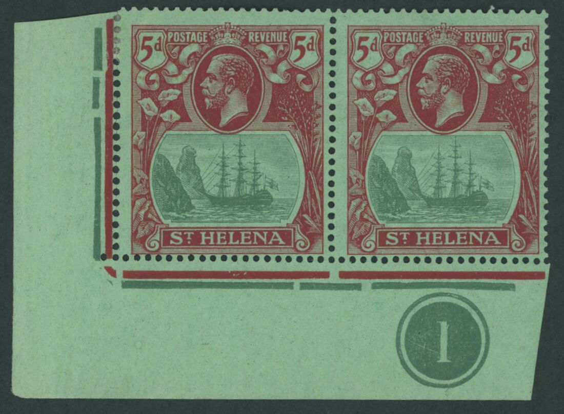 1922-37 Script 5d. green and deep carmine on green, a horizontal pair from the lower left corner of the sheet with plate number '1', variety cleft rock, very slight diagonal gum bend, large part original gum. S.G. 103, 103c, £250+