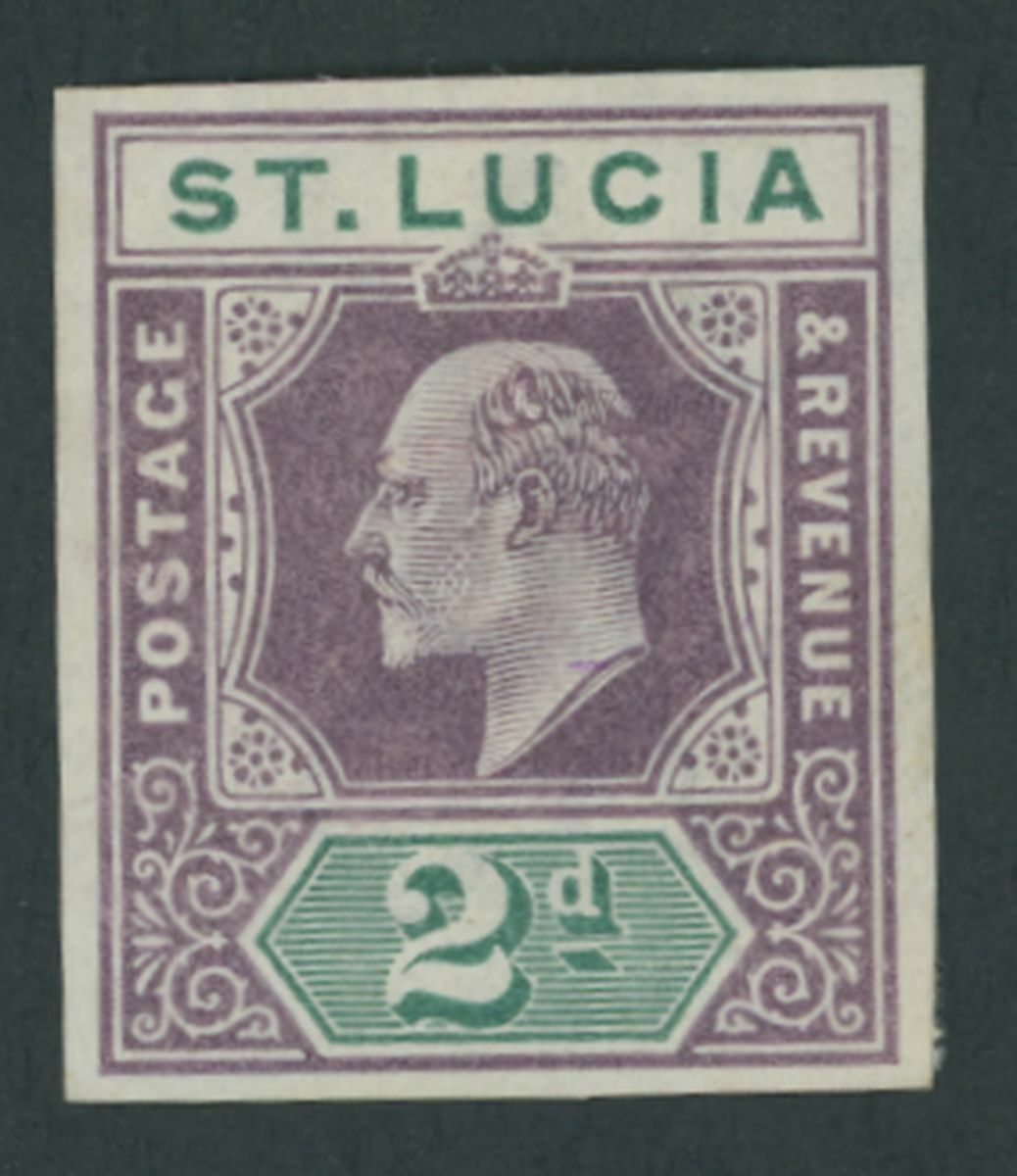 2d. imperforate colour trial in dull purple and green, the colours of the issued ½d. value, on gummed watermarked paper; large part original gum, fine