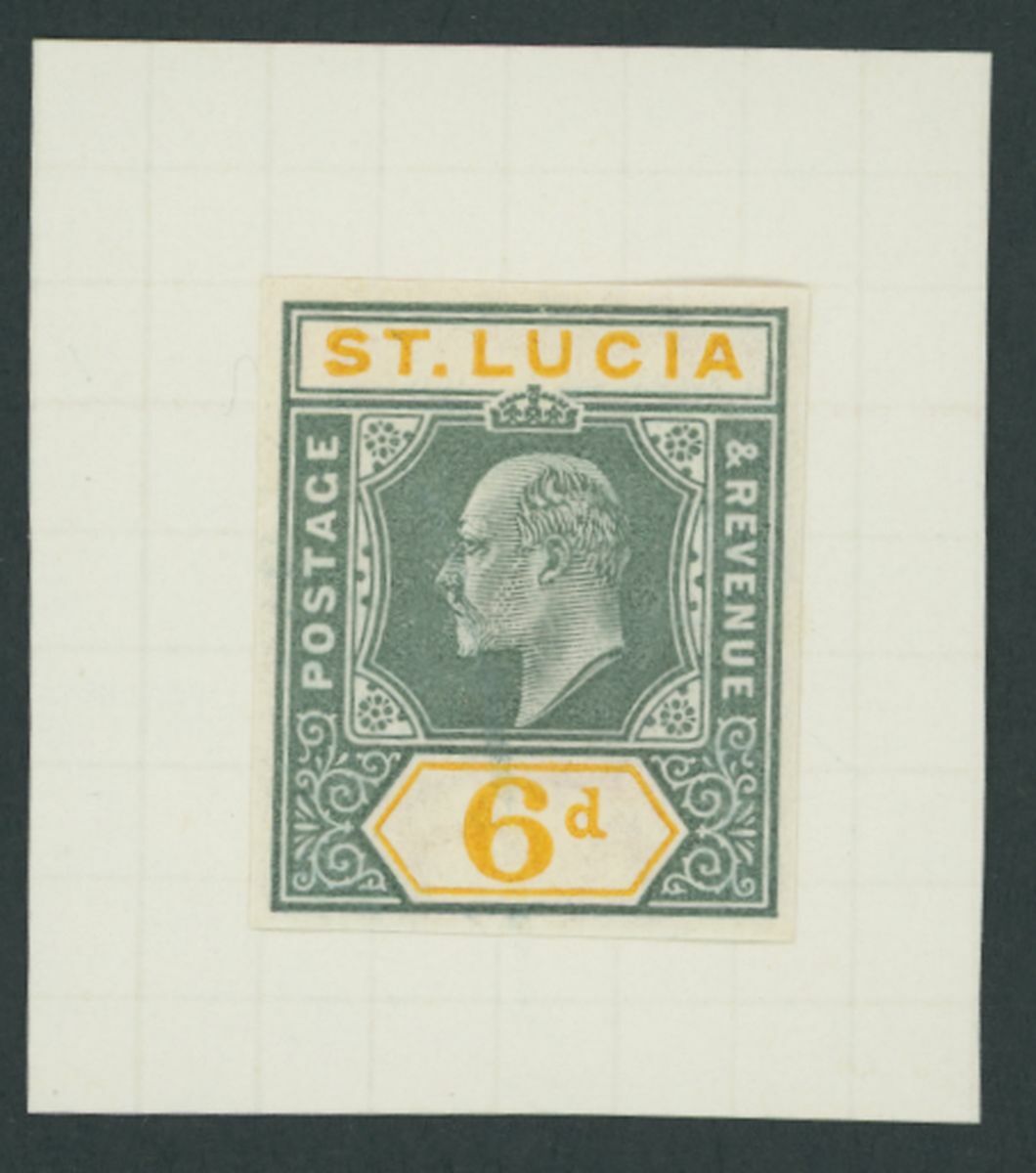 6d. imperforate colour trial in dull green and yellow, on gummed watermarked paper affixed to small piece of archival paper (36 x 40mm.), fine