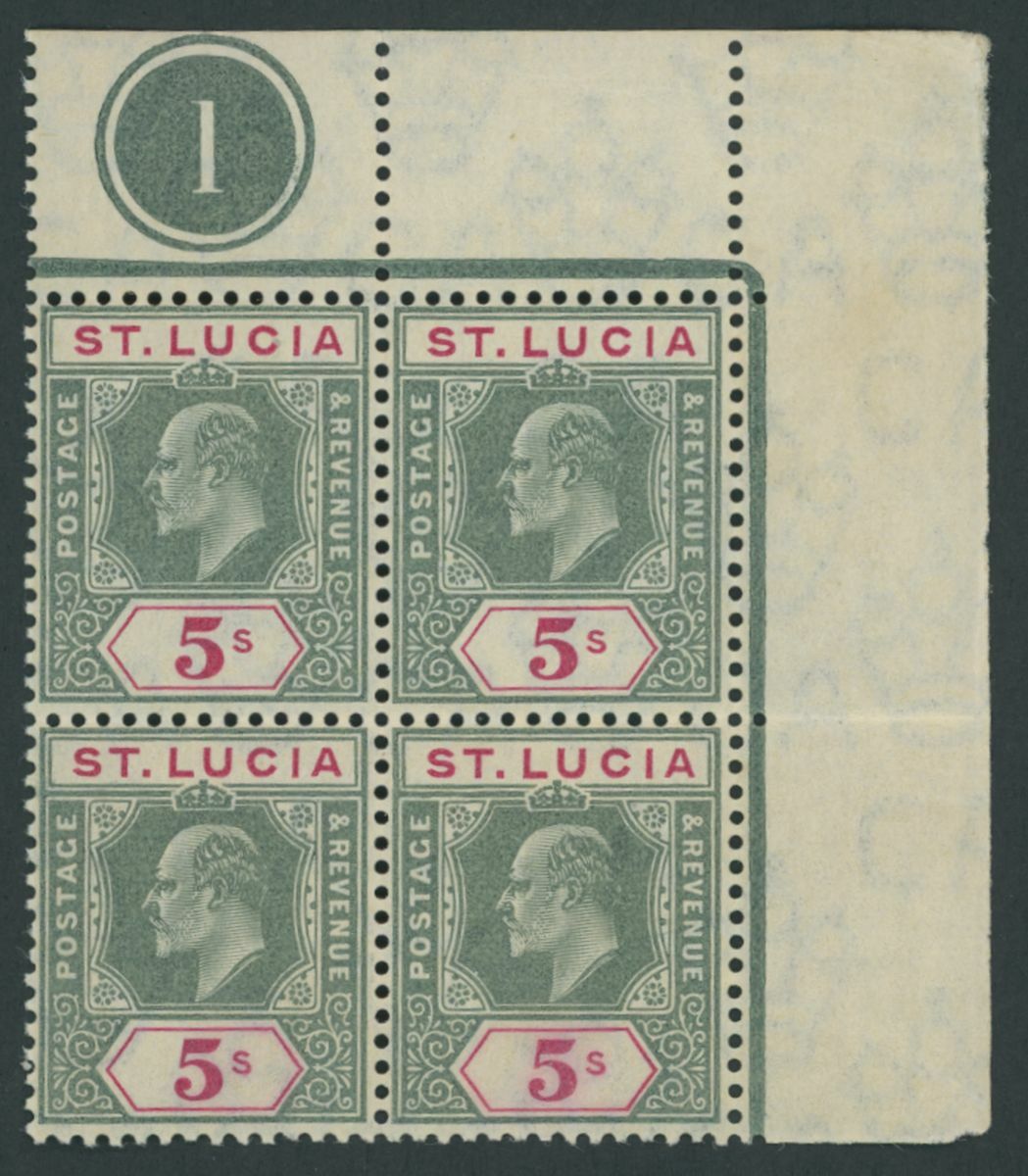 1904-10 MCA 5/- green and carmine, an upper right corner block of four with plate number '1', fine unmounted mint, a scarce multiple. S.G. 76, £340+