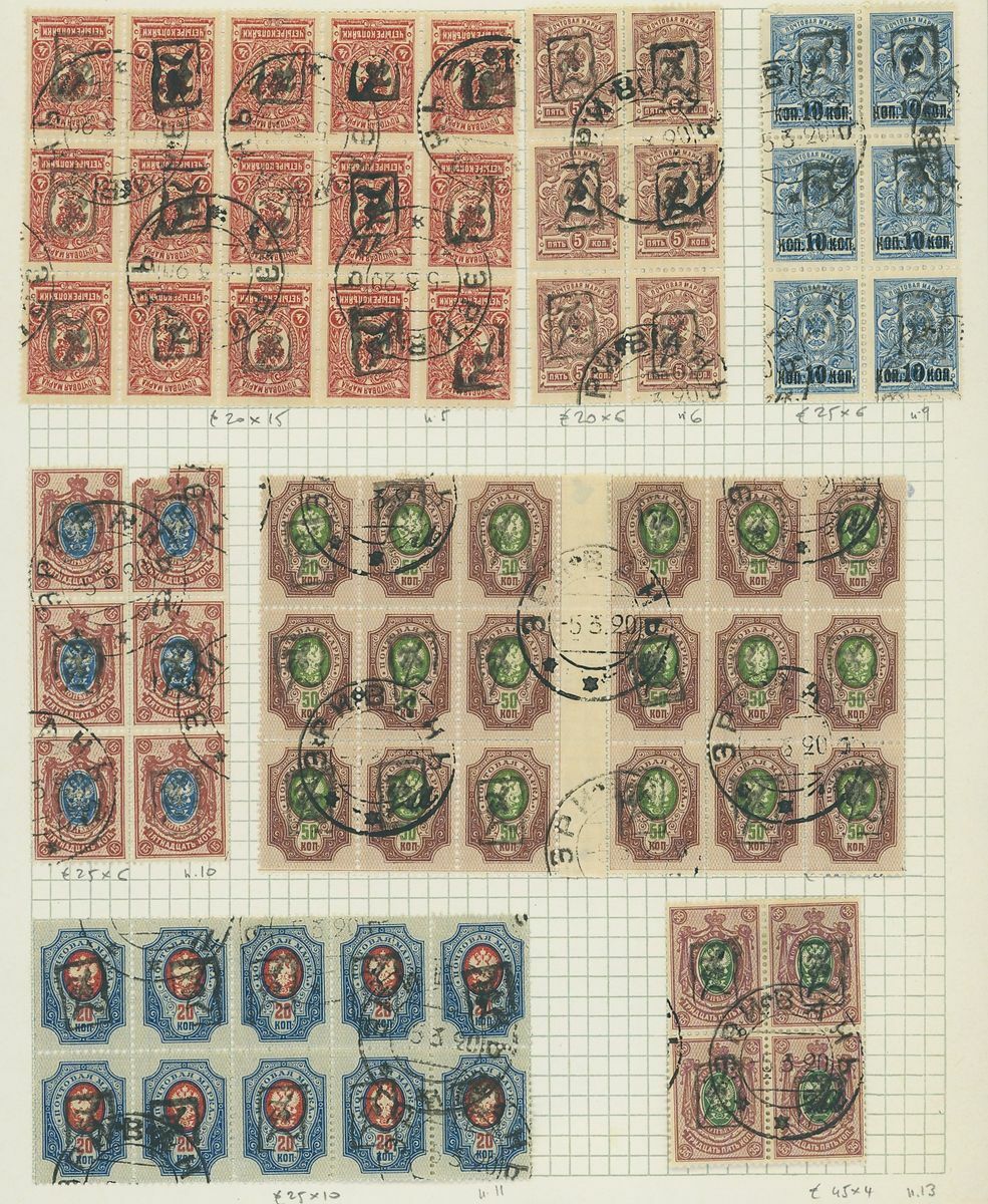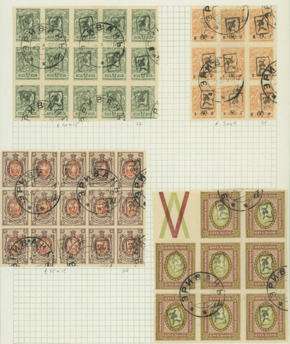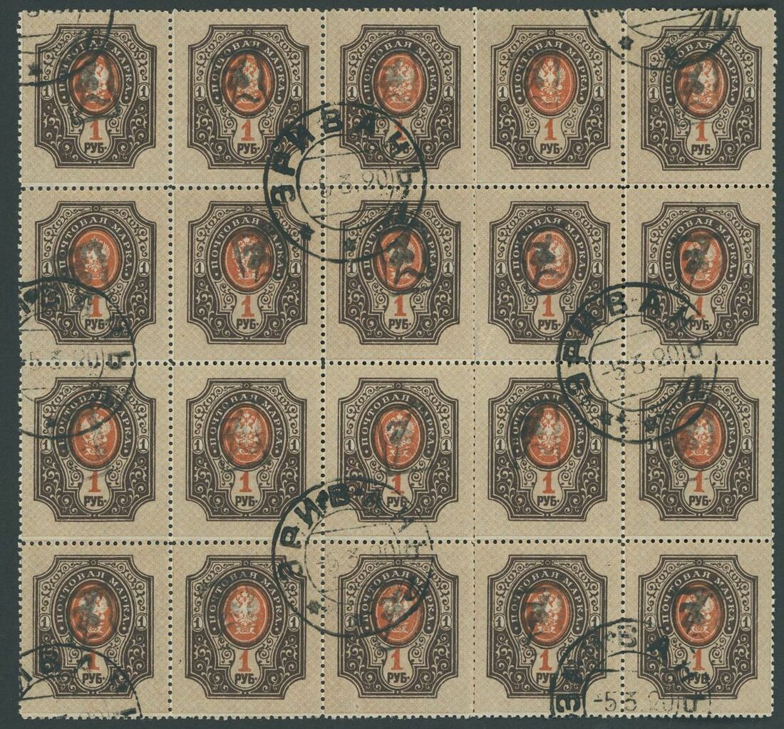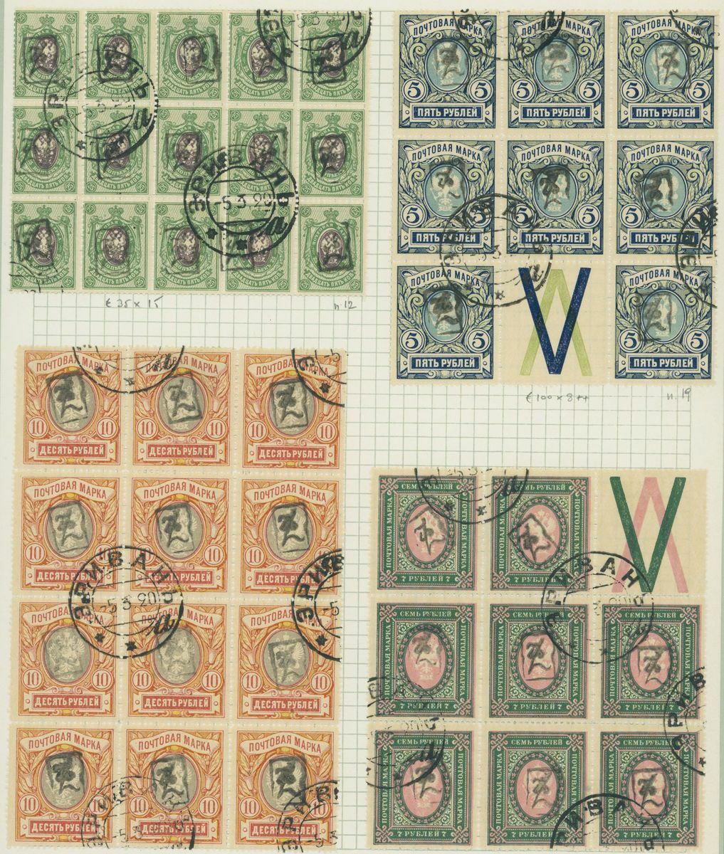1919 collection of sixteen used blocks including 50k. block of eighteen (6x3) with interpanneau in the middle, 5R. block of nine (8 stamps and monogram), 7R. block of nine (8 stamps and monogram), 10r. block of twelve (3x4), generally fine and a very difficult lot to replicate, stated Yvert catalogue €9,500++