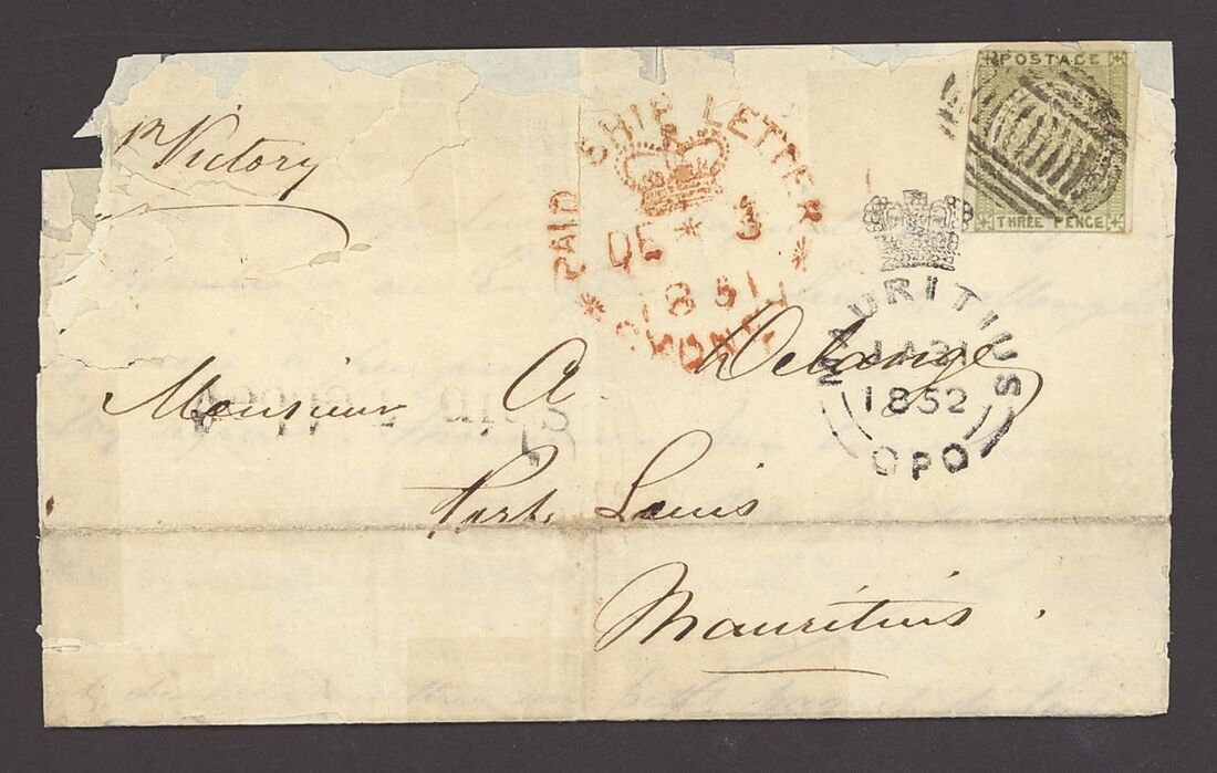 1851 (3 Dec.) entire from Sydney to Mauritius bearing 3d. green with margins in places cancelled by barred oval obliterator, showing on the front neat crowned
