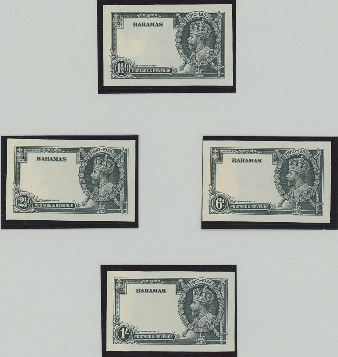 1935 Silver Jubilee 1d. to 1/- set of four stamp size proofs of the frames in black on wove paper; some usual archive paper remainder on the reverse mentioned for accuracy, a very rare set. Photo