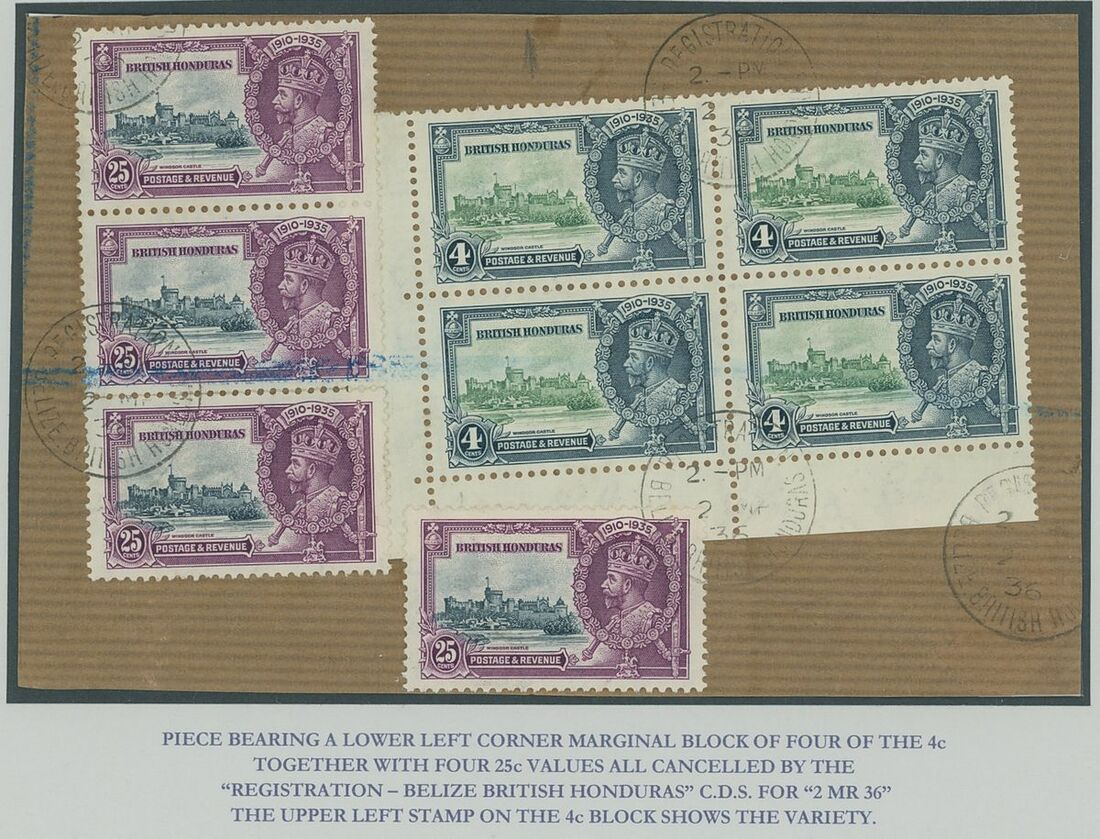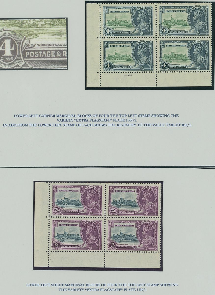 1935 variety extra flagstaff 4c. and 25c. each in lower left corner block of four with the upper left stamp showing the variety, unmounted mint, also a piece bearing a 4c. lower left corner block of four showing the variety and additional 25c. (4) cancelled by "Belize" (2.3.36) c.d.s. Generally fine. S.G. 144, 144a, 146, 146a, £700+
